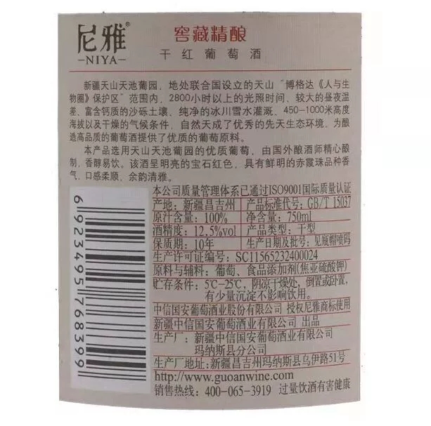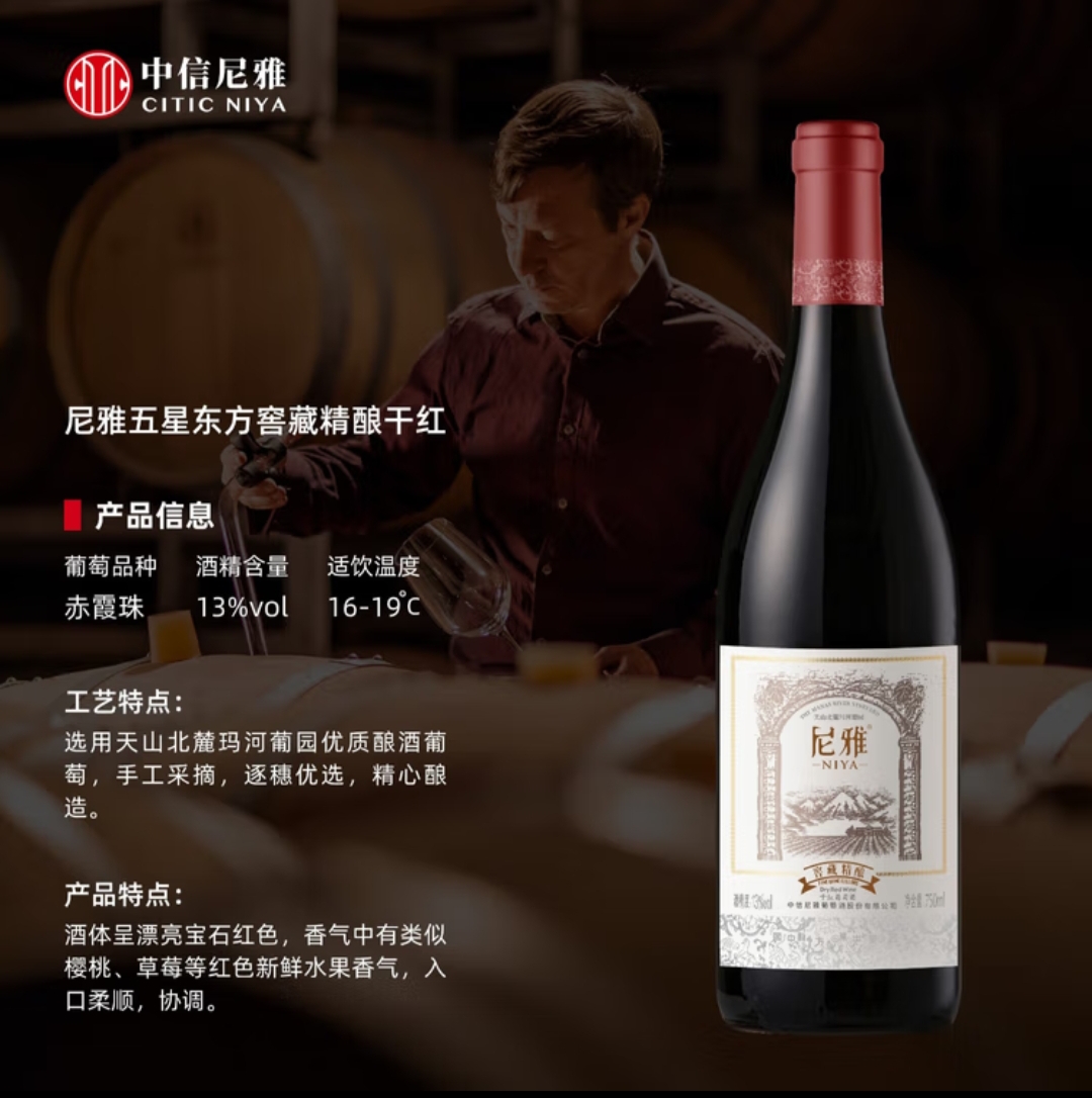 尼雅五星东方窖藏精酿干红 750ml 13%vol 裸瓶