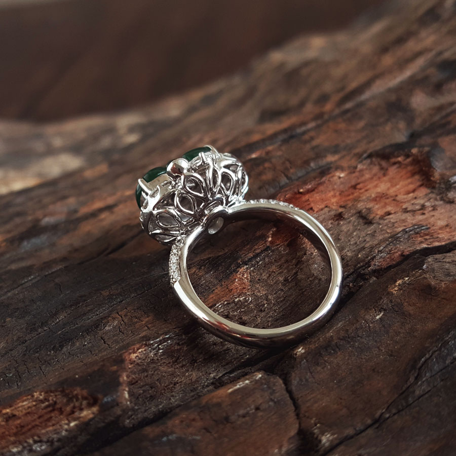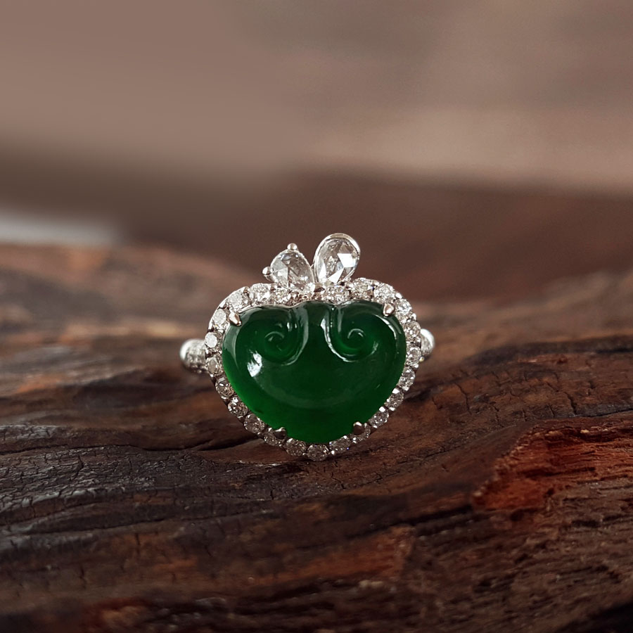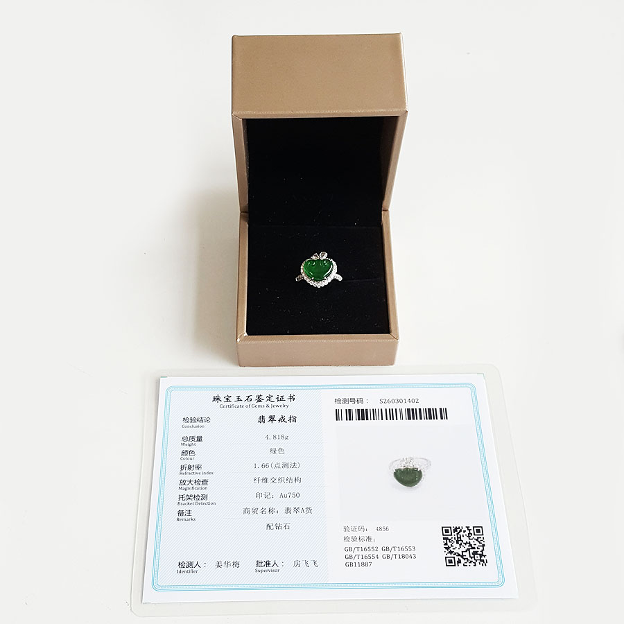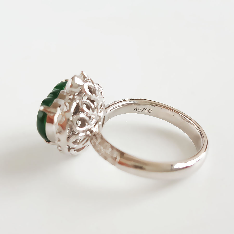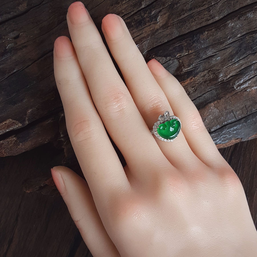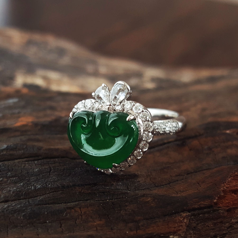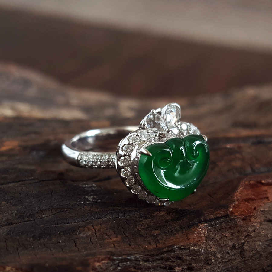名称 | AU750白金镶钻镶天然细腻冰种满绿如意(万事如意)翡翠戒指 |