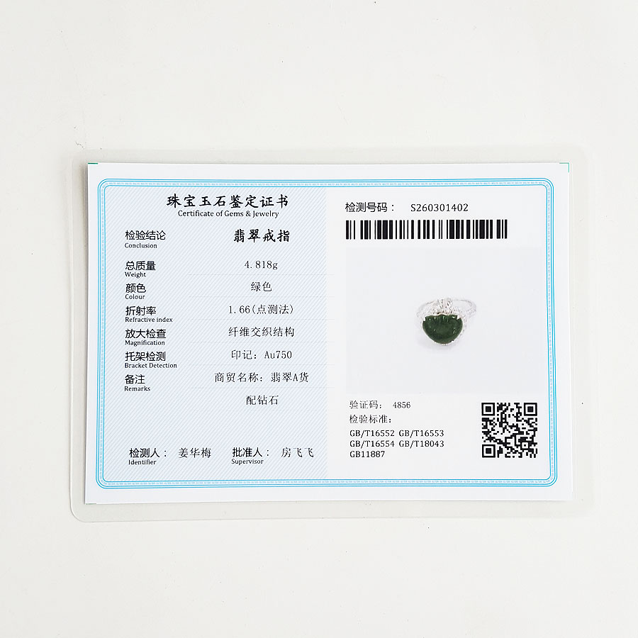 【天然正品】A货翡翠AU750白金镶钻镶天然细腻冰种满绿如意(万事如意)翡翠戒指 8号(戒圈可改)250326NJM40