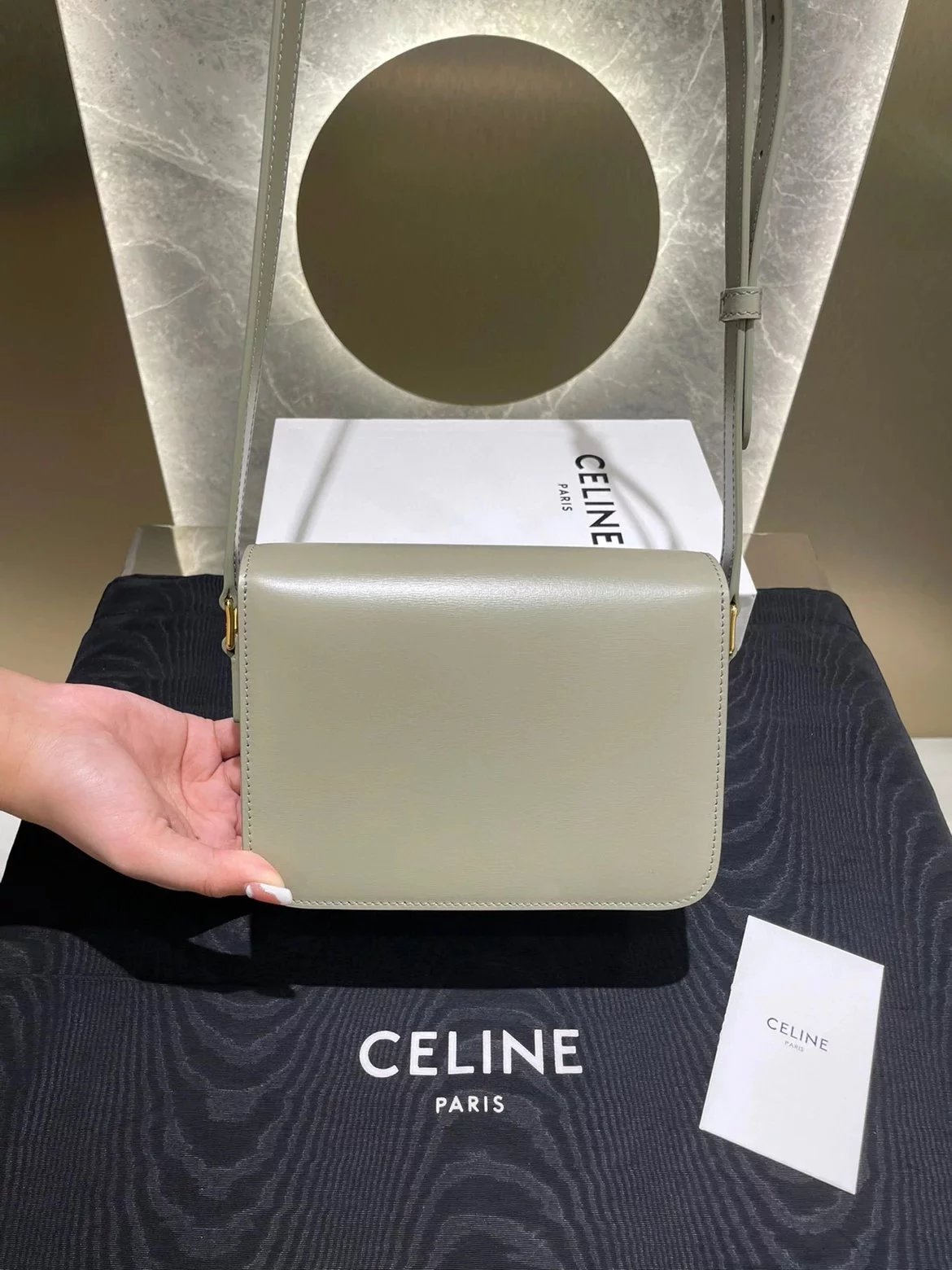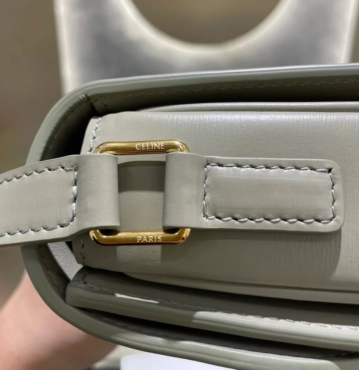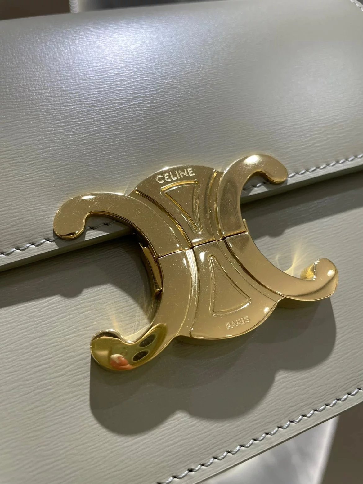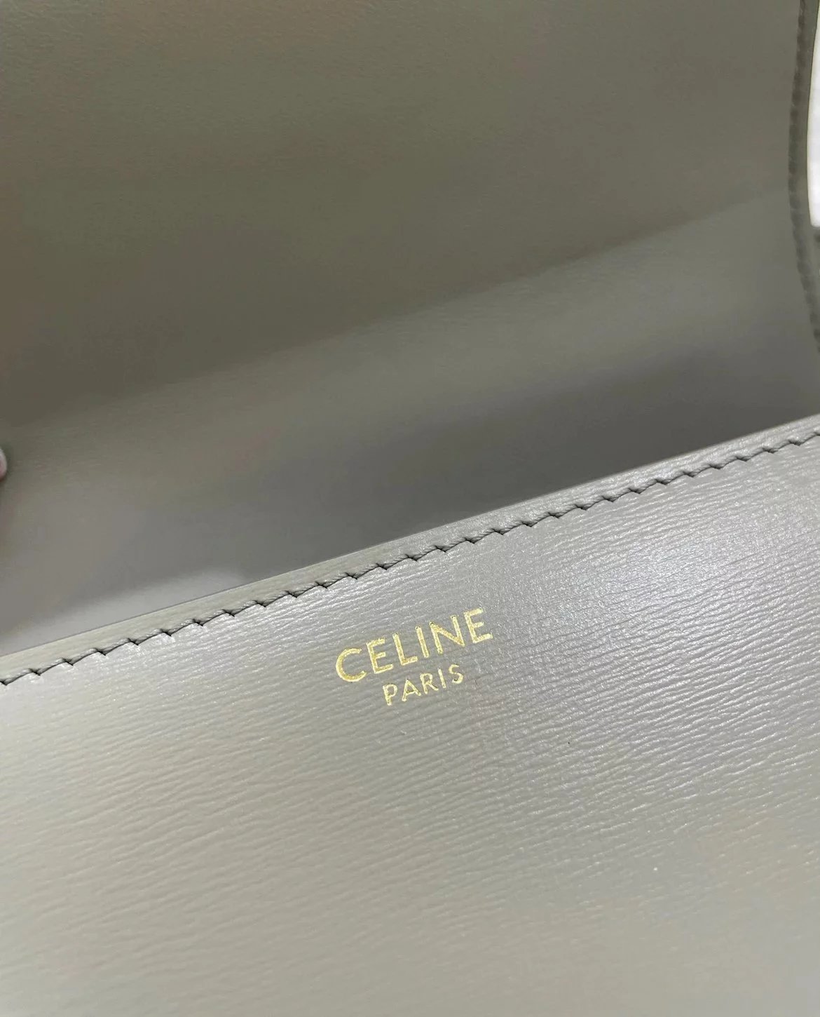 赛琳 23新色灰绿色凯旋门 Box|DZ 亮泽牛皮革手袋 这款采用刺绣制成的TRIOMPHE手袋配有一条可调节的皮革肩带和TRIOMPHE专属搭扣。 尺码 原厂牛皮革 羊皮革衬里金色金属件斜挎和肩背 金属质感锁扣3个内侧隔层 内侧拉链口袋和扁平口袋 可调节皮革肩带长