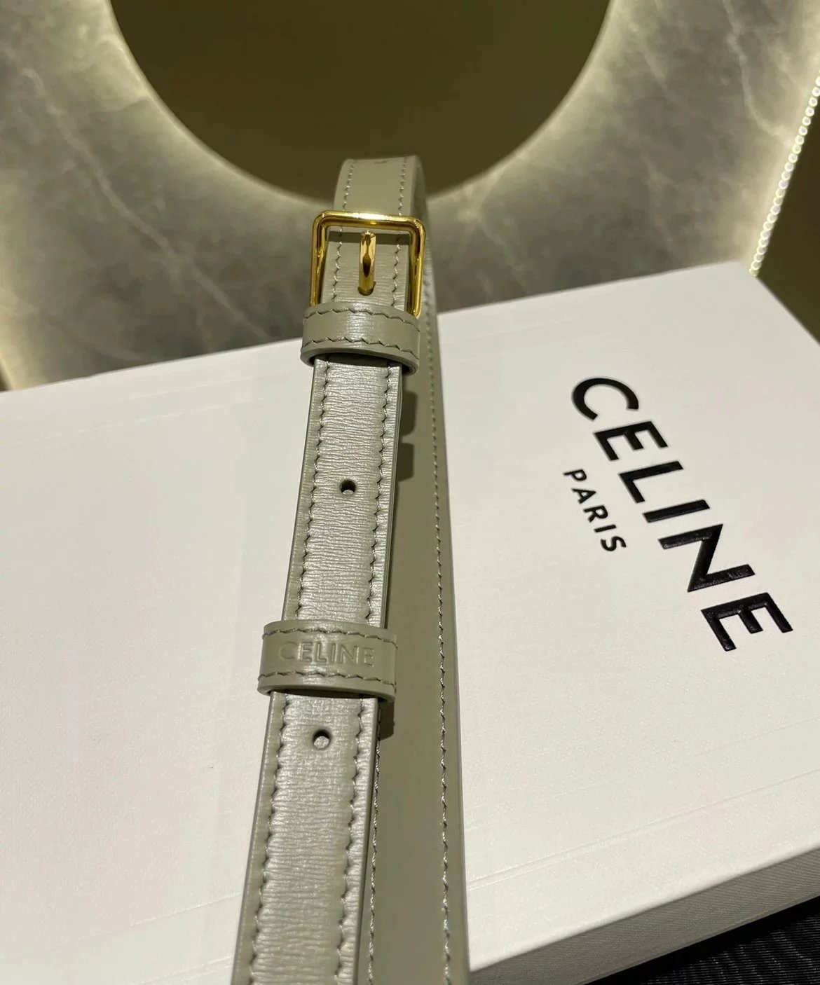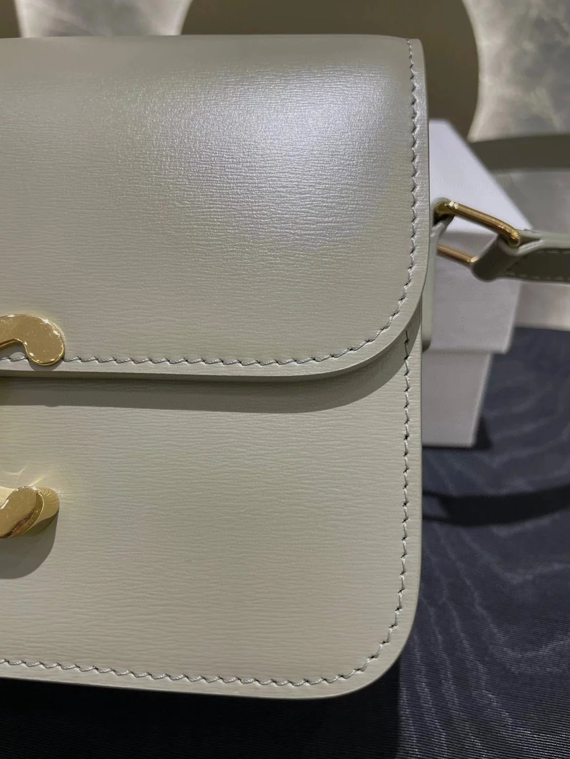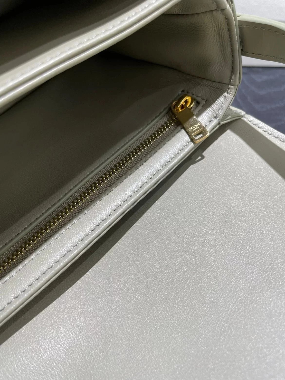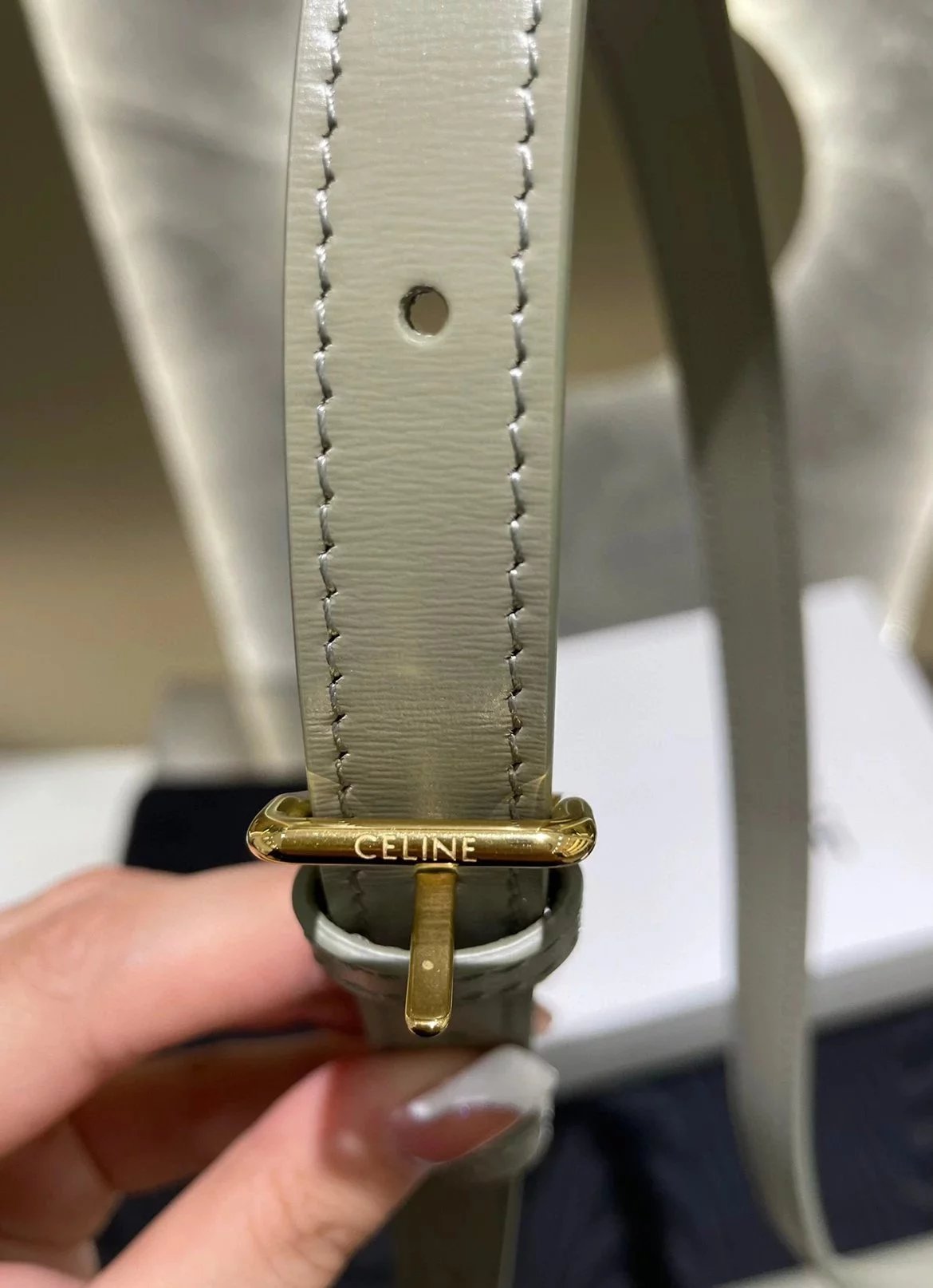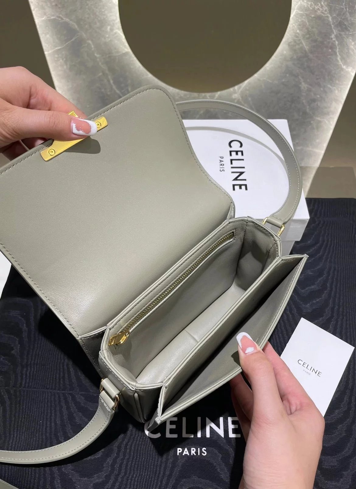 赛琳 23新色灰绿色凯旋门 Box|DZ 亮泽牛皮革手袋 这款采用刺绣制成的TRIOMPHE手袋配有一条可调节的皮革肩带和TRIOMPHE专属搭扣。 尺码 原厂牛皮革 羊皮革衬里金色金属件斜挎和肩背 金属质感锁扣3个内侧隔层 内侧拉链口袋和扁平口袋 可调节皮革肩带长