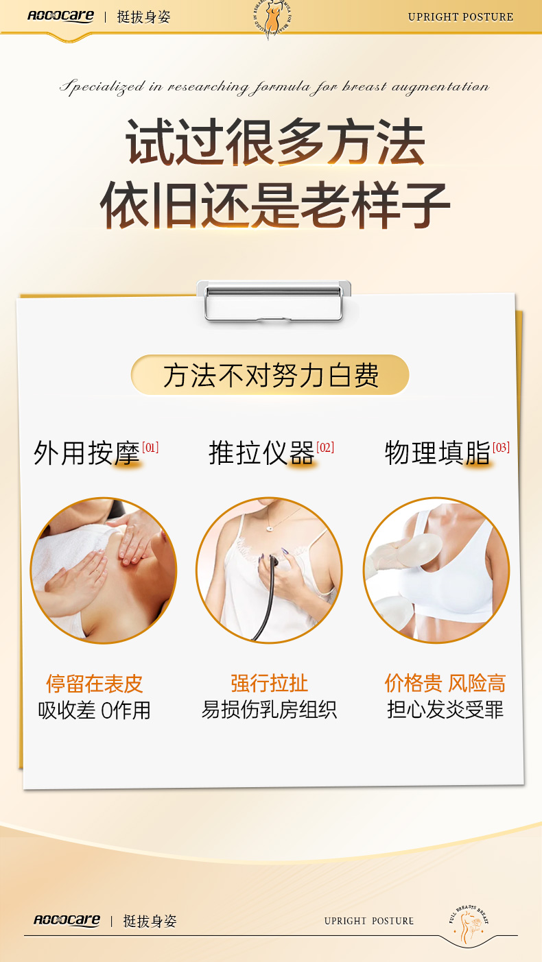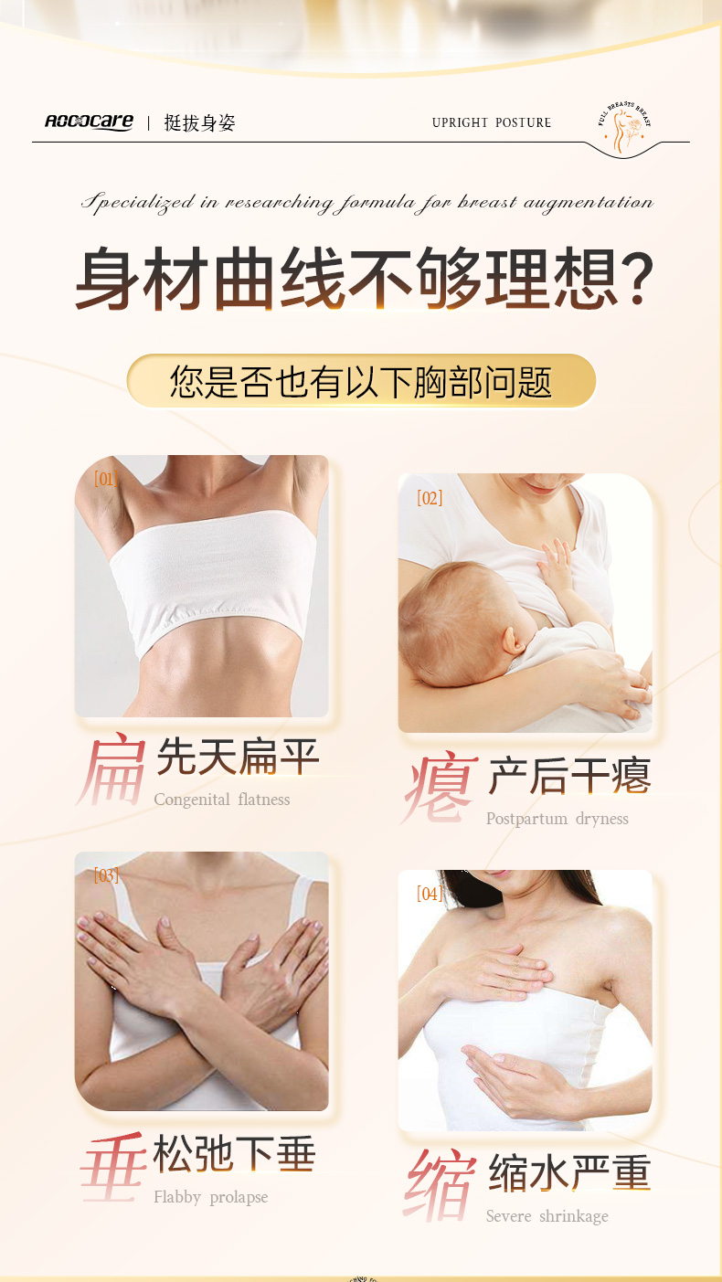 5.药后反弹人群:使用激素类的丰胸产品,由于激素刺激乳腺腺泡异常增大,短时间内达到了丰胸的效果,但停用后乳房迅速回缩、发黑老化的女士。