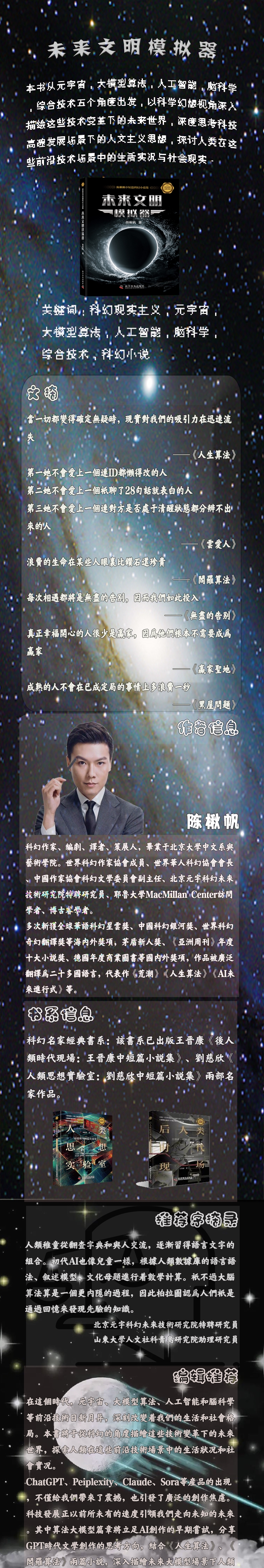 陈楸帆,科幻作家、编剧、译者、策展人,毕业于北京大学中文系与艺术学院。世界科幻作家协会成员、世界华人科幻协会会长、中国作家协会科幻文学委员会副主任、北京元宇科幻未来技术研究院特聘研究员、耶鲁大学MacMillan Center访问学者、博古睿学者。