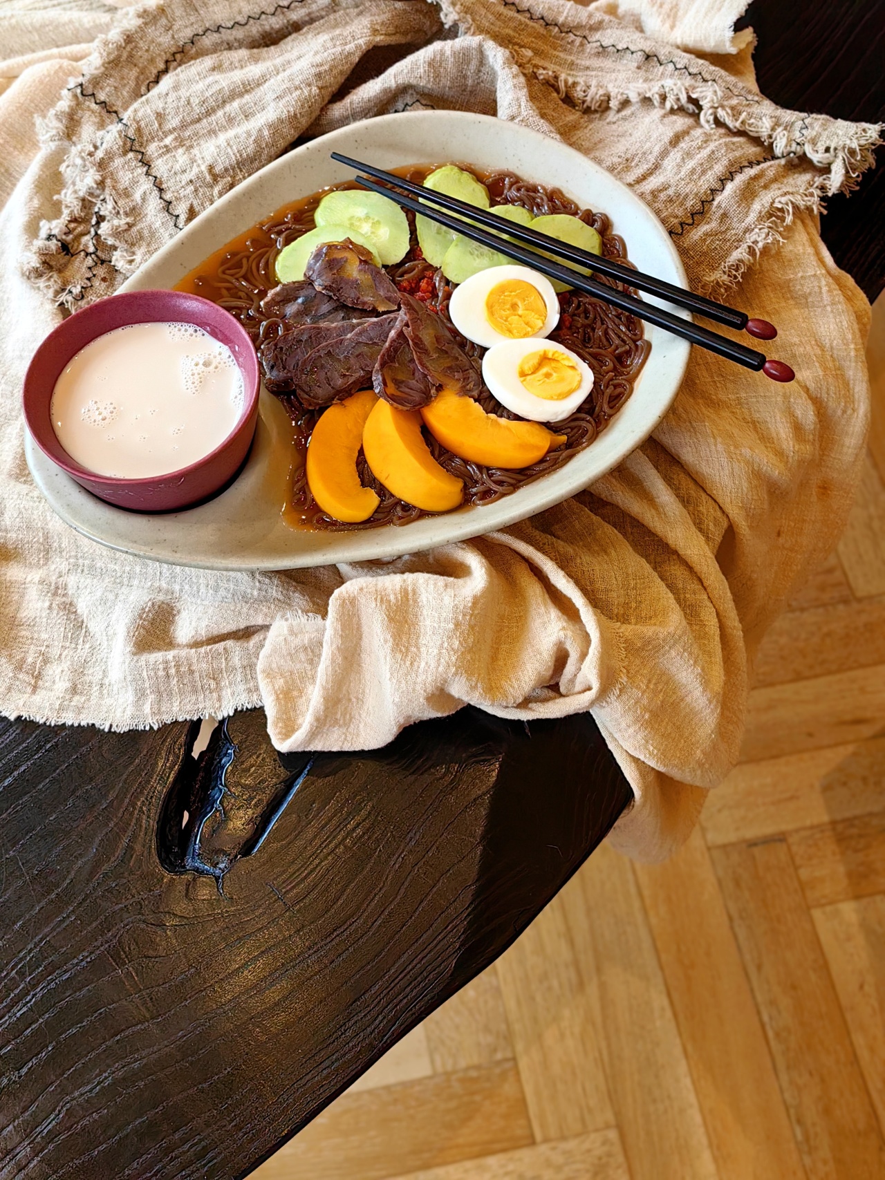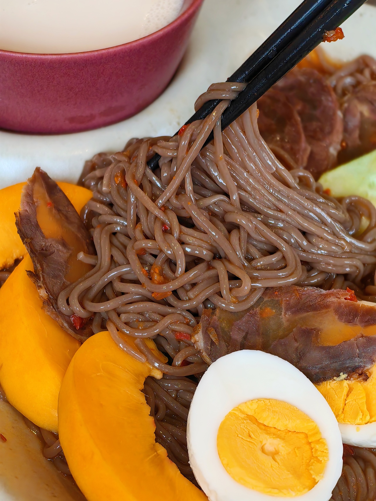 夏天还是要吃吃冷面的!这是延吉冷面哦,发源于中国延边朝鲜族自治州,是当地极具代表的特色美食,更是无数吃货心驰神往的舌尖盛宴,清凉冰爽,嗦起来超惬意!我还加了黄桃、鸡蛋、黄瓜和牛腱肉,就是忘了放泡菜撒芝麻啊啊啊啊啊!下次一定搞上,也试下搭配更正宗的苹果片西瓜块!