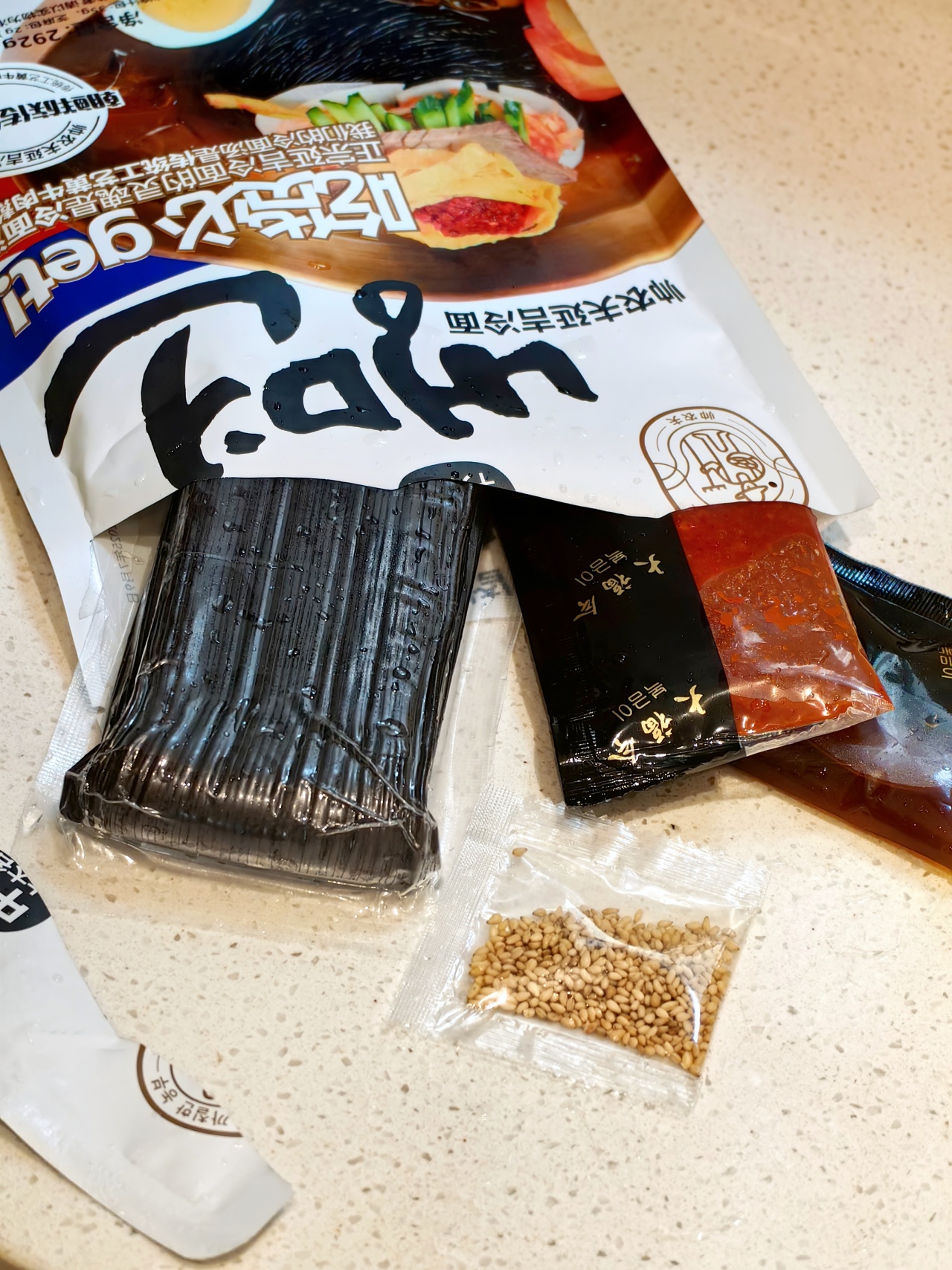 冷面每袋292克,包含220克面饼、35克秘制酱、35克冷面汤浓缩汁和2克芝麻,从主料到辅料一应俱全,轻松复刻地道美味。做起来超简单:首先,把面饼常温解冻,搓散,水沸后煮约2分钟,面条无硬心就行了。捞出后用冷水反复冲洗到凉透,控水装碗,我还用了冰水,更爽滑。接着,把冷面汤和秘制汁加入350毫升冰镇矿泉水稀释,放面,再撒上芝麻,一碗基础版冷面就完成了!如果想升级口感,还可以搭配鸡蛋、黄瓜丝、苹果片、泡菜或酱牛肉片,风味会更加丰富多元,一口下去,面条劲道,酸甜香辣在舌尖绽放,美味得让人欲罢不能,绝对的夏天本命面!