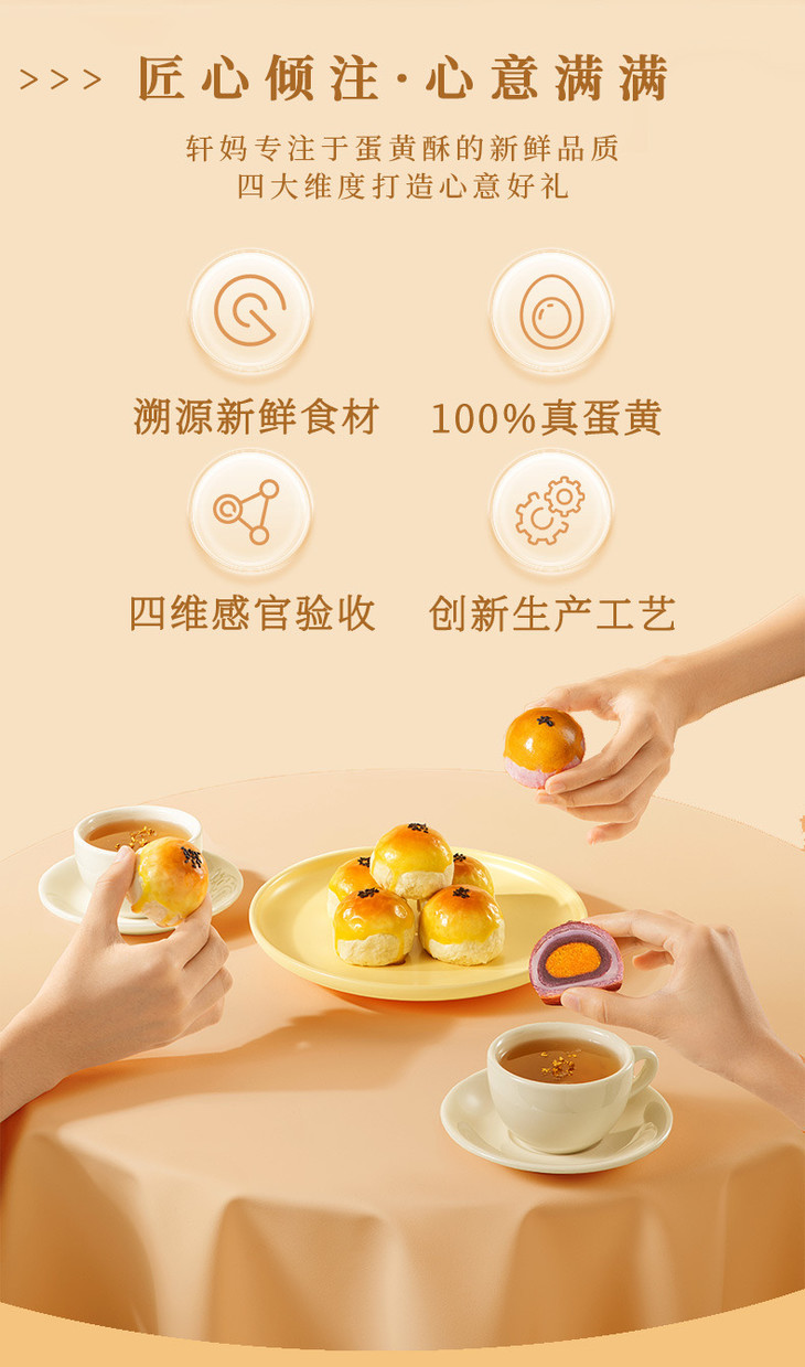轩妈家的蛋黄酥,在用料上决不让步,精选新西兰安佳黄油,让酥皮自带浓郁奶香;优选广西红树林的海鸭蛋,经过45天的腌制,让蛋黄沙酥流油,才剥开取出制作内馅。新鲜的食材搭配面点师傅手工擀制的面皮,把蛋黄酥的“香、酥、糯、绵、咸”发挥到极致!轩妈也坚持现做现发,因为没有多余的防腐剂添加剂,赏味期限只有35天,虽然不长,但不用担心,因为到手不出2天,都逃不出吃货的胃!