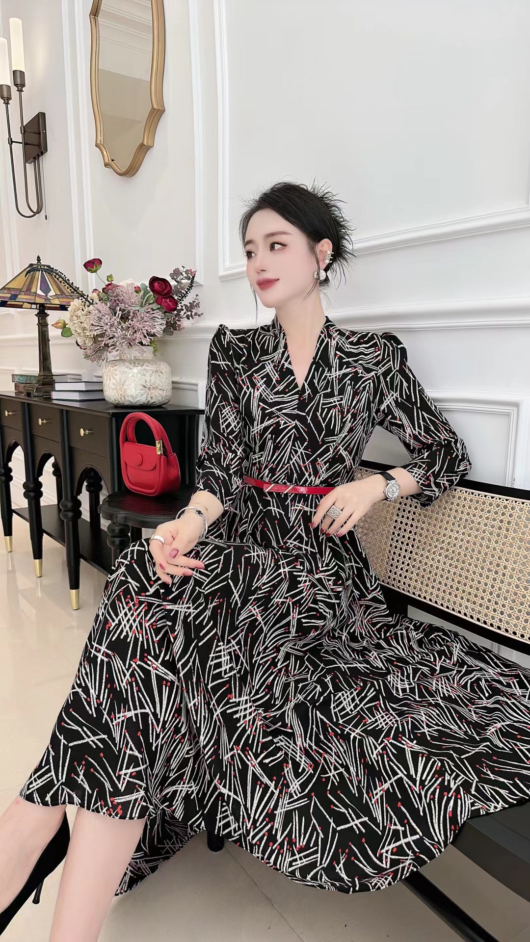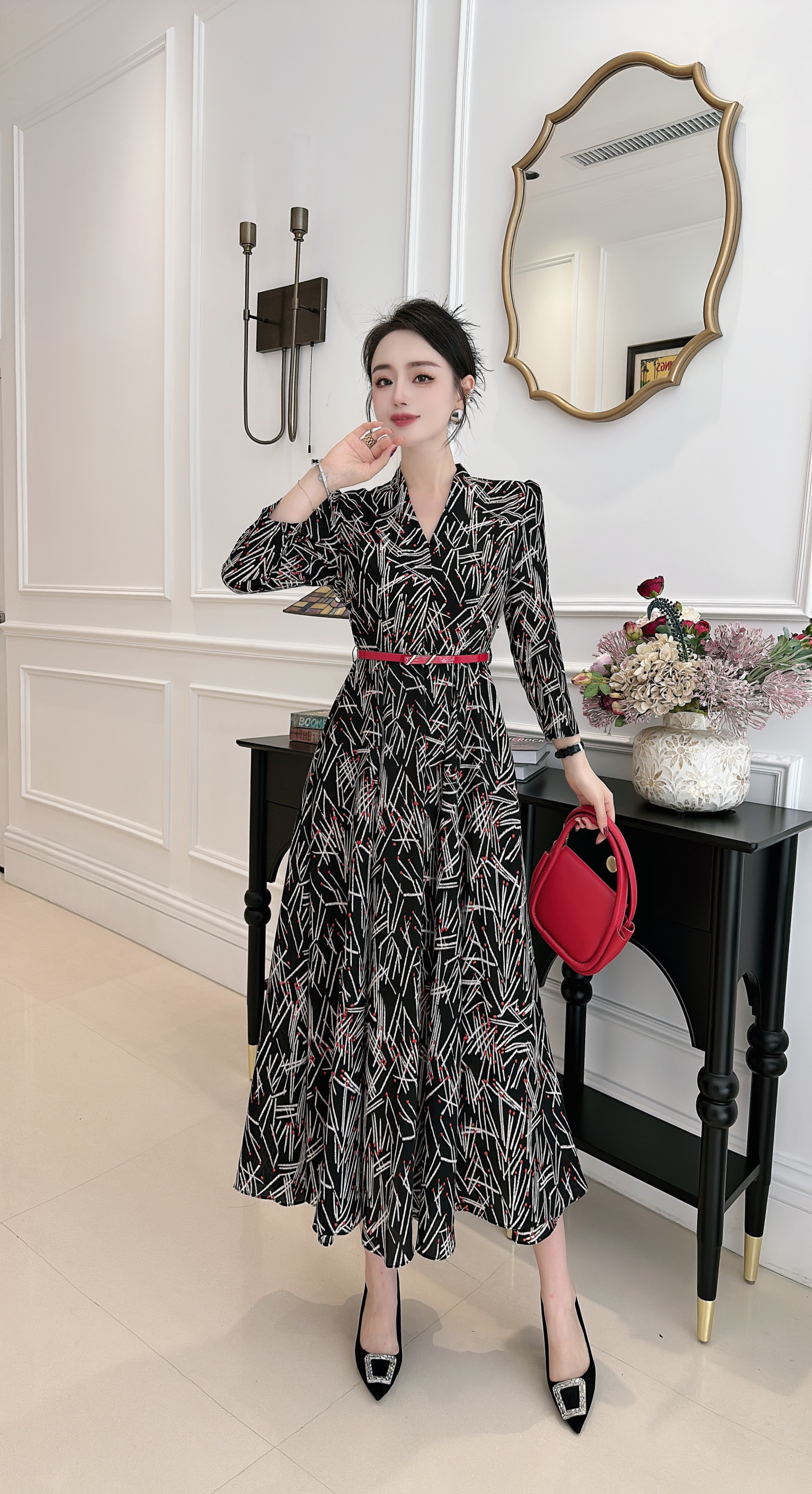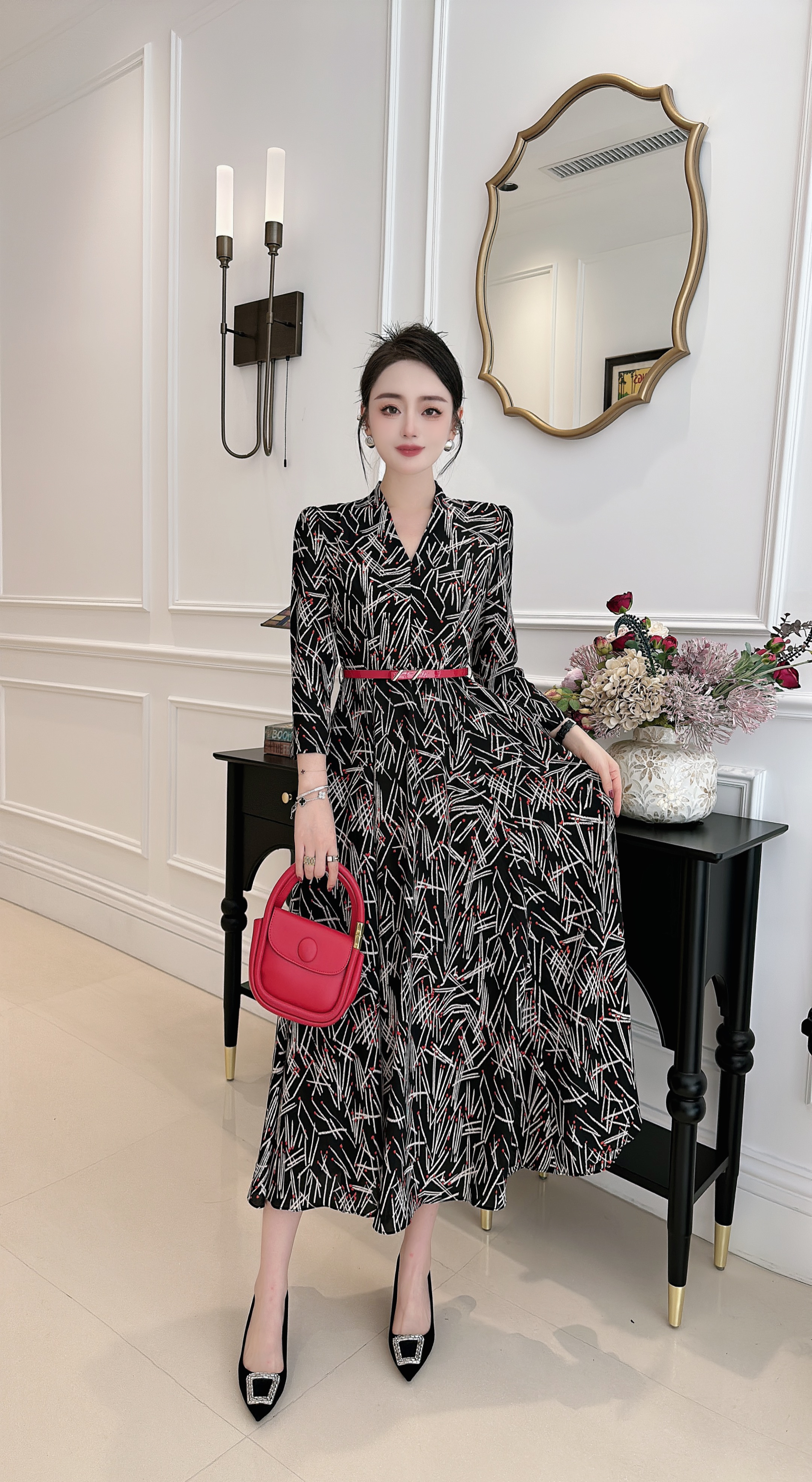 HJ1S67_胭脂色_连衣裙_秋冬_复古西装领 V 领线条印花收腰腰带_高级女装_BERNIEELEN 伯妮斯茵