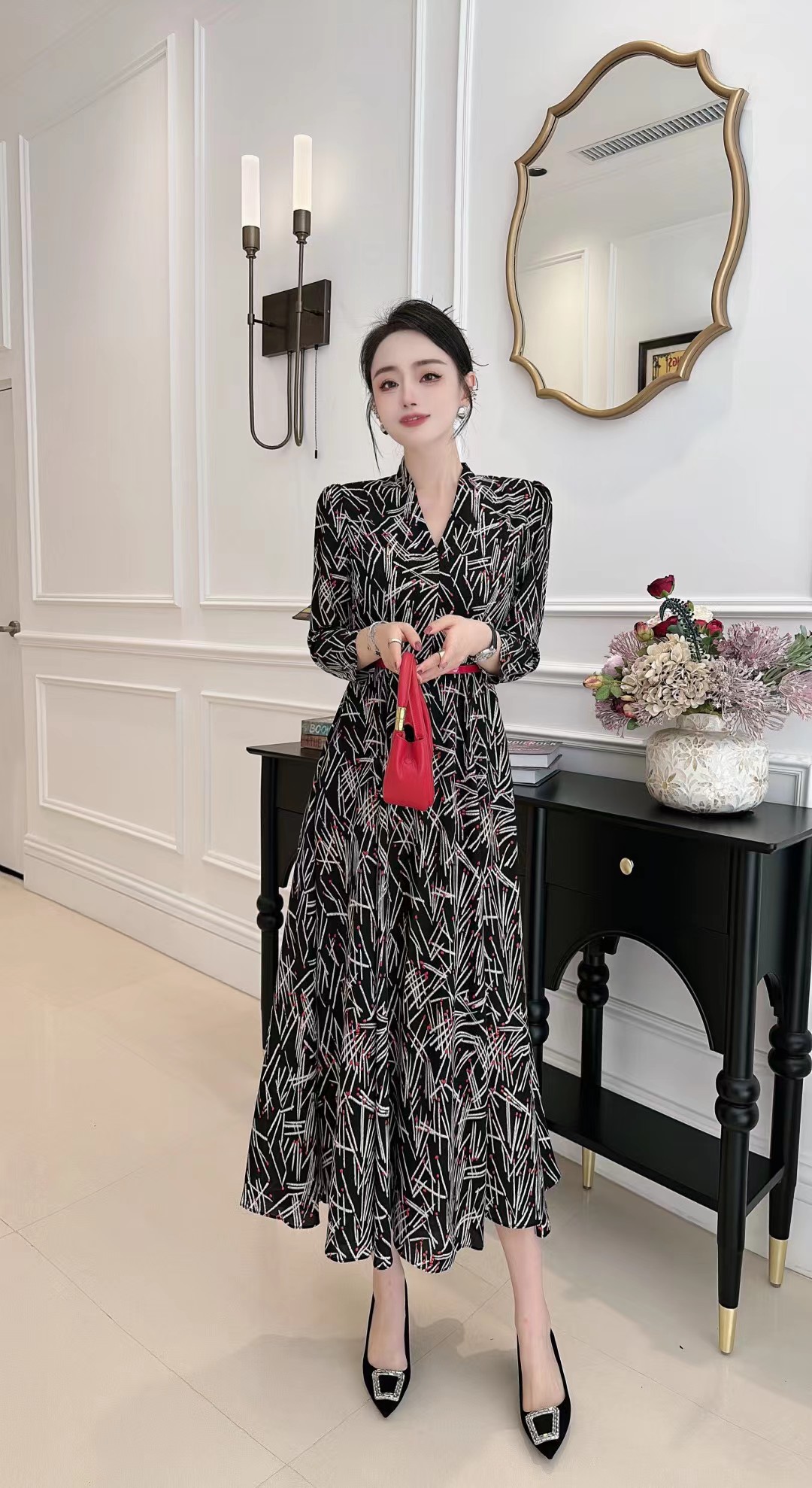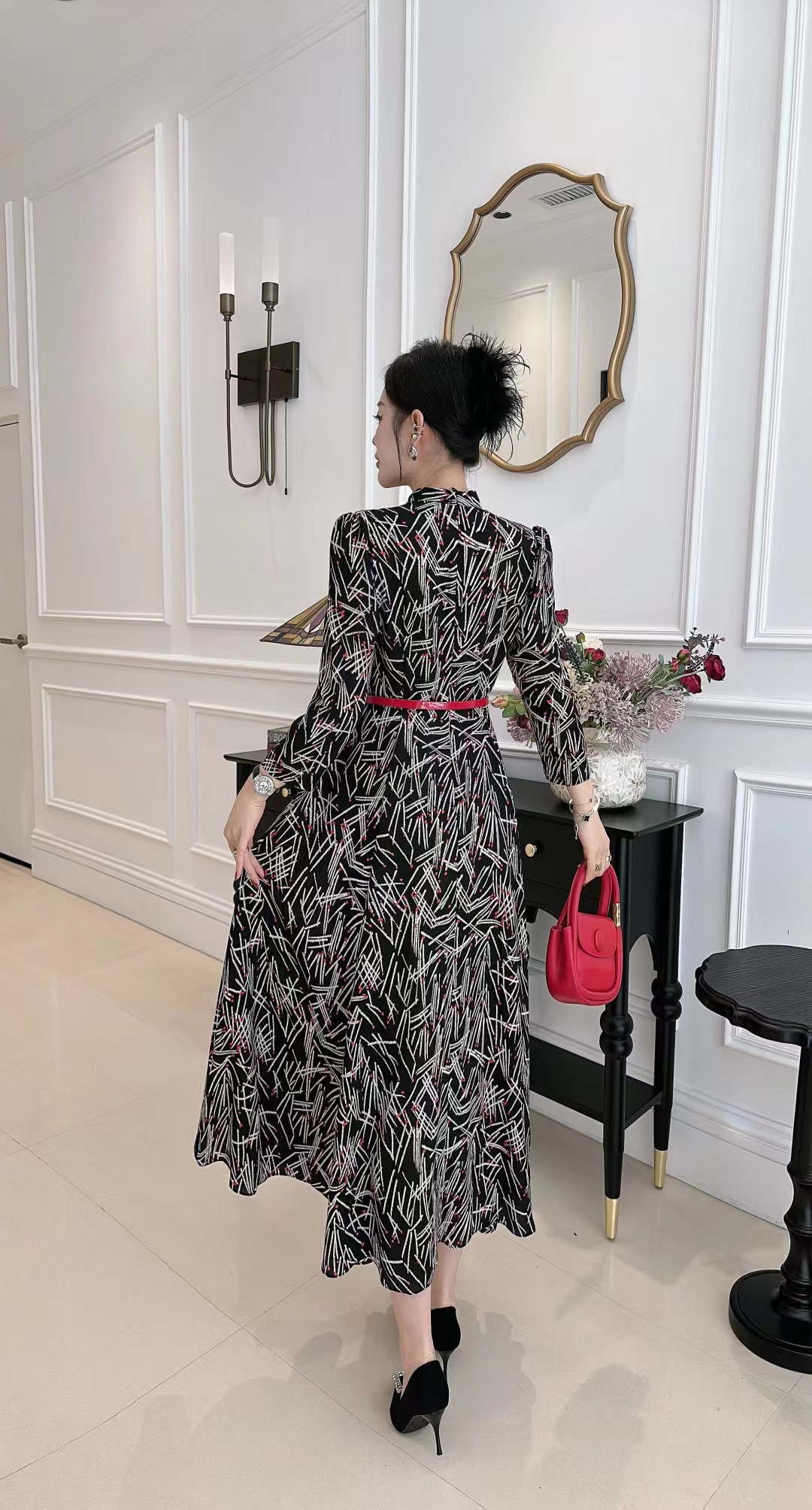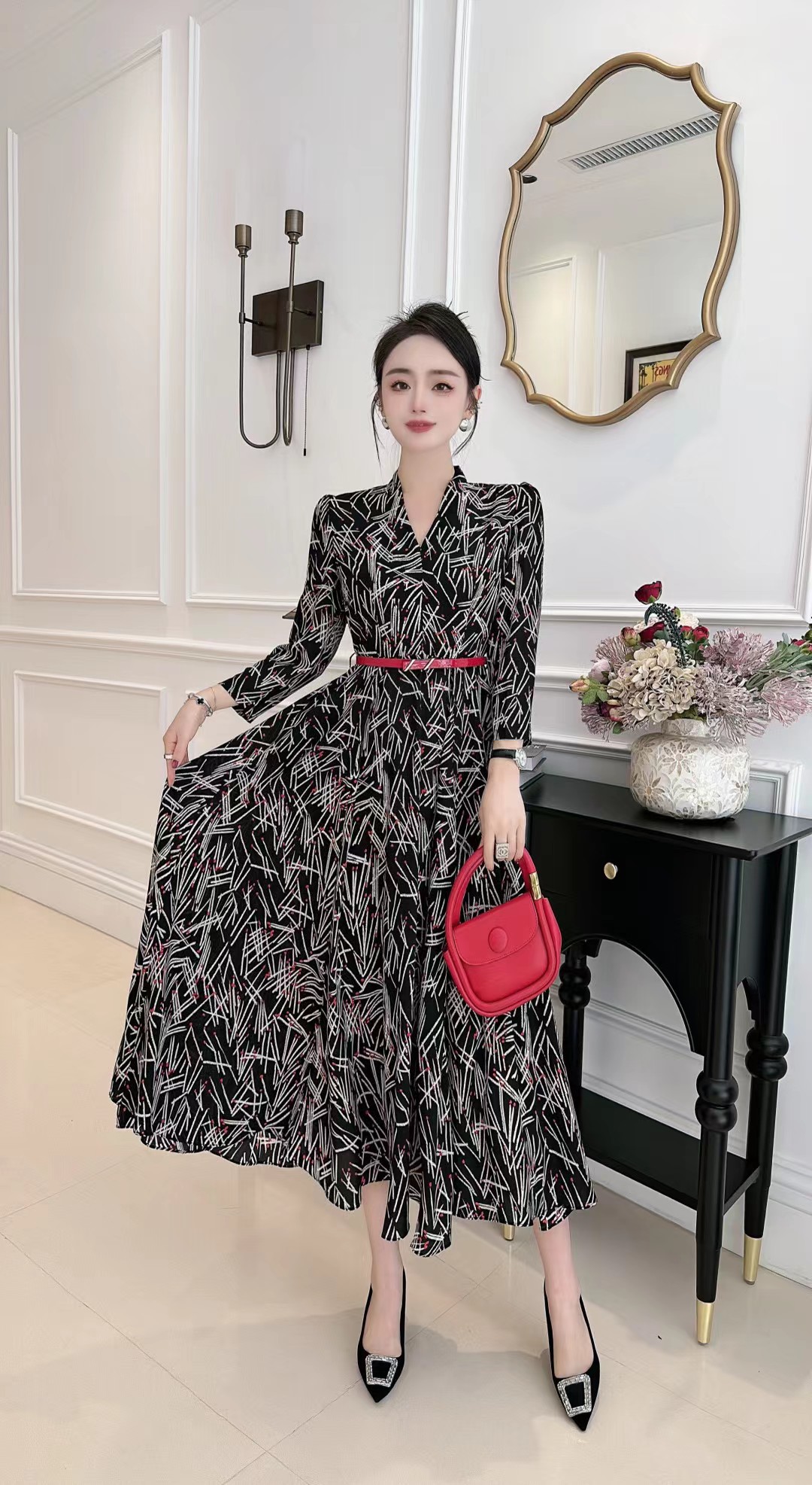HJ1S67_胭脂色_连衣裙_秋冬_复古西装领 V 领线条印花收腰腰带_高级女装_BERNIEELEN 伯妮斯茵