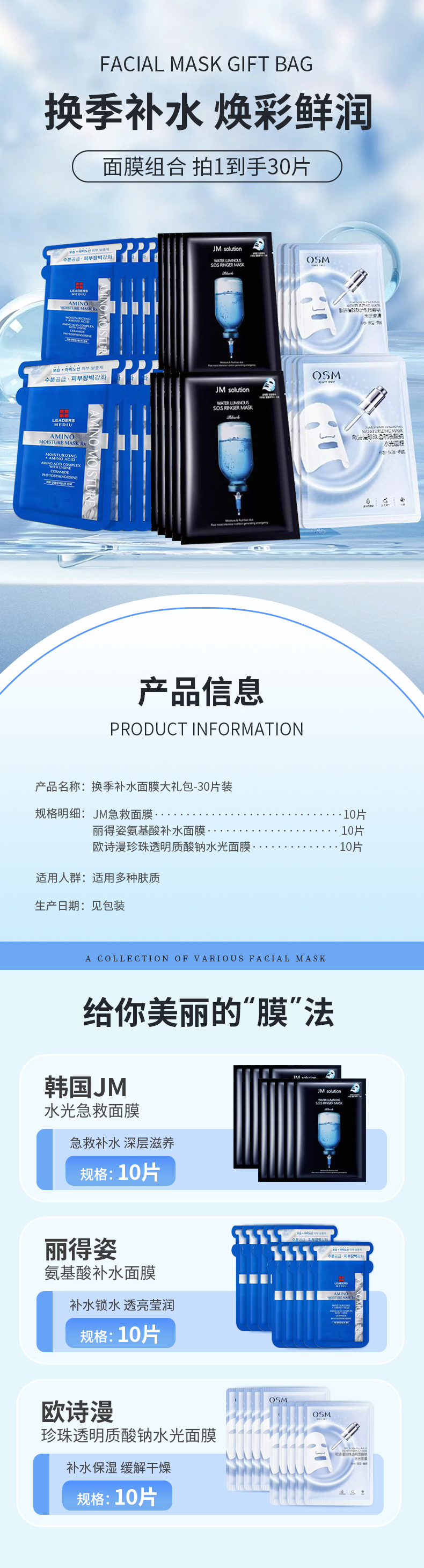 【一次到手30片面膜!】面膜大礼包 JM急救面膜10片+丽得姿面膜10片+欧诗漫水光面膜10片 精选三款品牌经典面膜 让你一次体验~