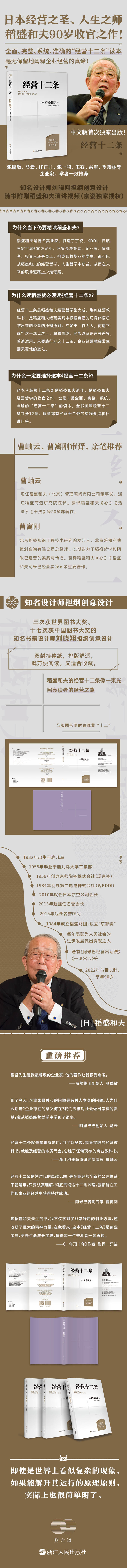 稻盛和夫90岁收官之作!中文版首次独家出版!全面、完整、系统、准确的“经营十二条”读本!一部经营教科书,既是经营哲学,又是人生指南!即使是世界上看似复杂的现象,如果能解开其运行的原理原则,实际上也很简单明了。日本经营之圣、人生之师稻盛和夫从数十年的实践经验中,总结出了经营者必须贯彻的12条法则!“经营十二条”是在经营一线的过程中诞生的,被稻盛和夫定位为“经营的真谛”。经营者应该想什么,做什么?本书将毫无保留地阐述企业经营的精髓。书中包括稻盛和夫有关经营十二条的要点和补讲问答,这些内容将帮助读者进一步加深对稻盛和夫经营哲学的理解。
