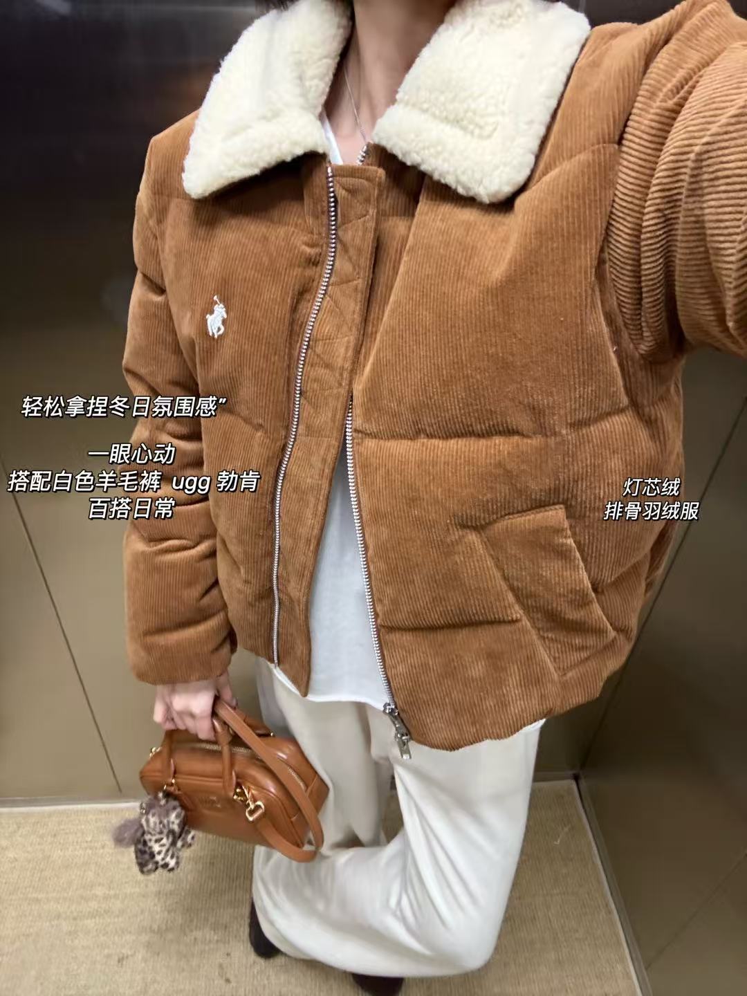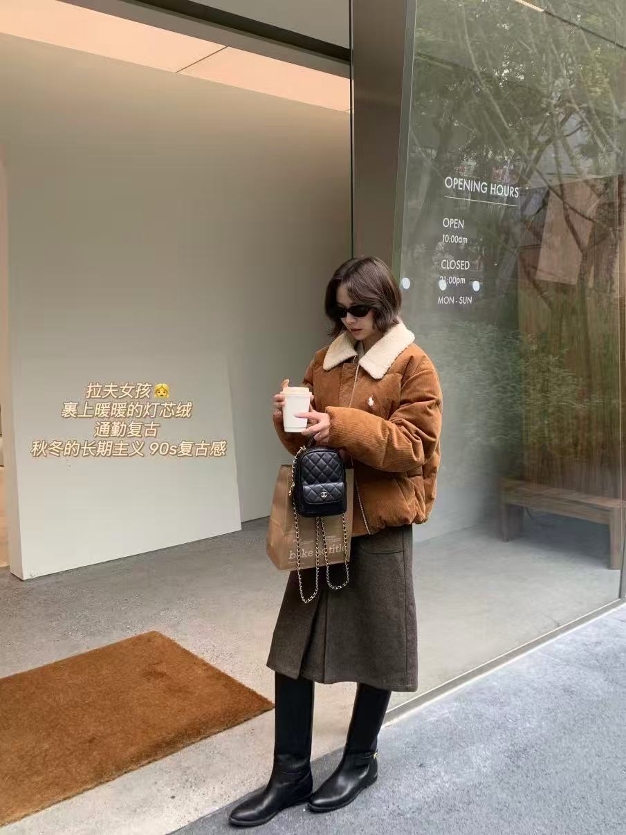焦糖色灯芯绒自带秋冬氛围感,羊羔毛领的撞色温柔又显贵气,复古老钱的代表。