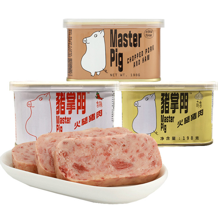 猪掌门是由一家名叫宏业的肉类加工公司生产的。这家肉类加工厂,创建在1954年,是真的老牌了,他们家生产的多个系列的午餐肉,都远销海外,并且创造了令同行追赶的高水平午餐肉标准,所以不是随便的网红产品哦。猪掌门为了保证罐头的肉质口感,选择了淮南猪和定远猪这两种优质黑猪种的猪后腿肉,这两种猪的特点是肉质香,瘦肉率高,而猪后腿肉部位皮厚、瘦肉多、筋多、胶质重,脂肪含量十分少,因此属于高蛋白、低脂肪且是高维生素的猪肉。相比于普通午餐肉,猪掌门火腿猪肉里的蛋白质含量更高,脂肪含量更低,卡路里也更低。