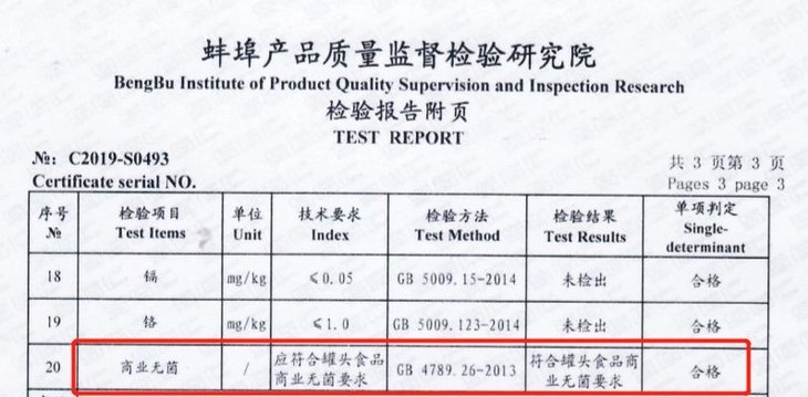 权威检测报告显示,淀粉含量低于了标准值3.5%,仅有3.2%,而且总体的滋味和气味,都达到了火腿猪肉罐头所应具备的。(国际规定:火腿猪肉罐头猪肉含量不得低于85%)