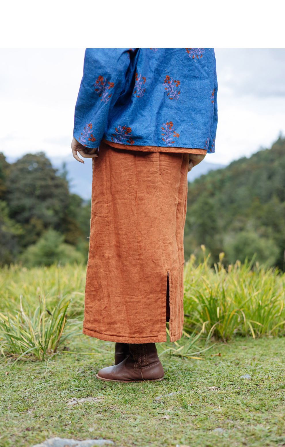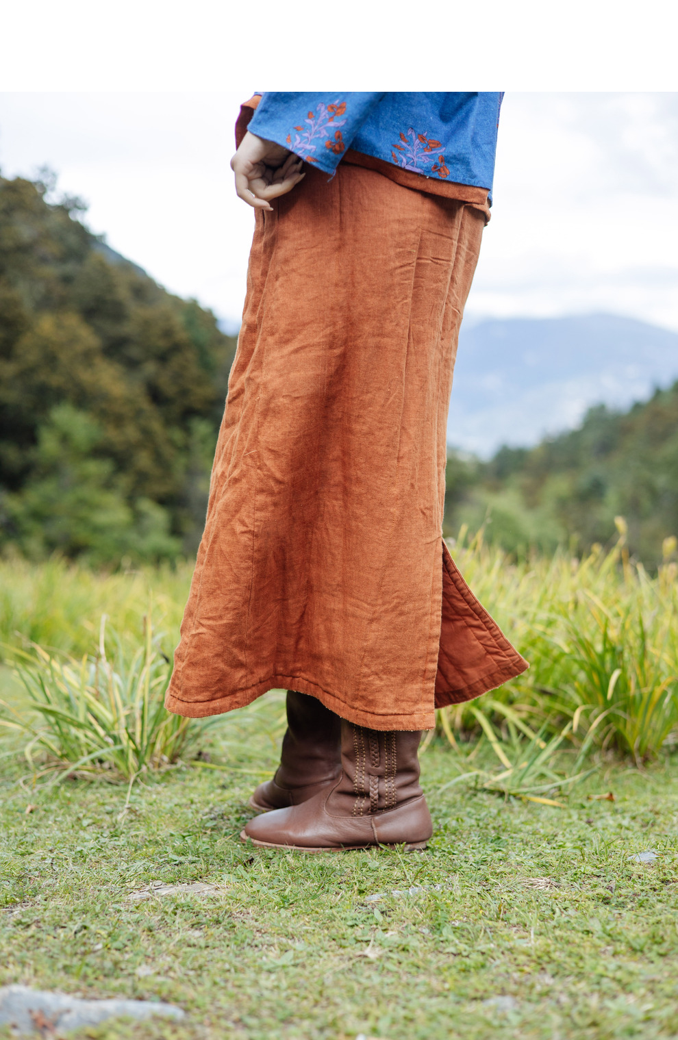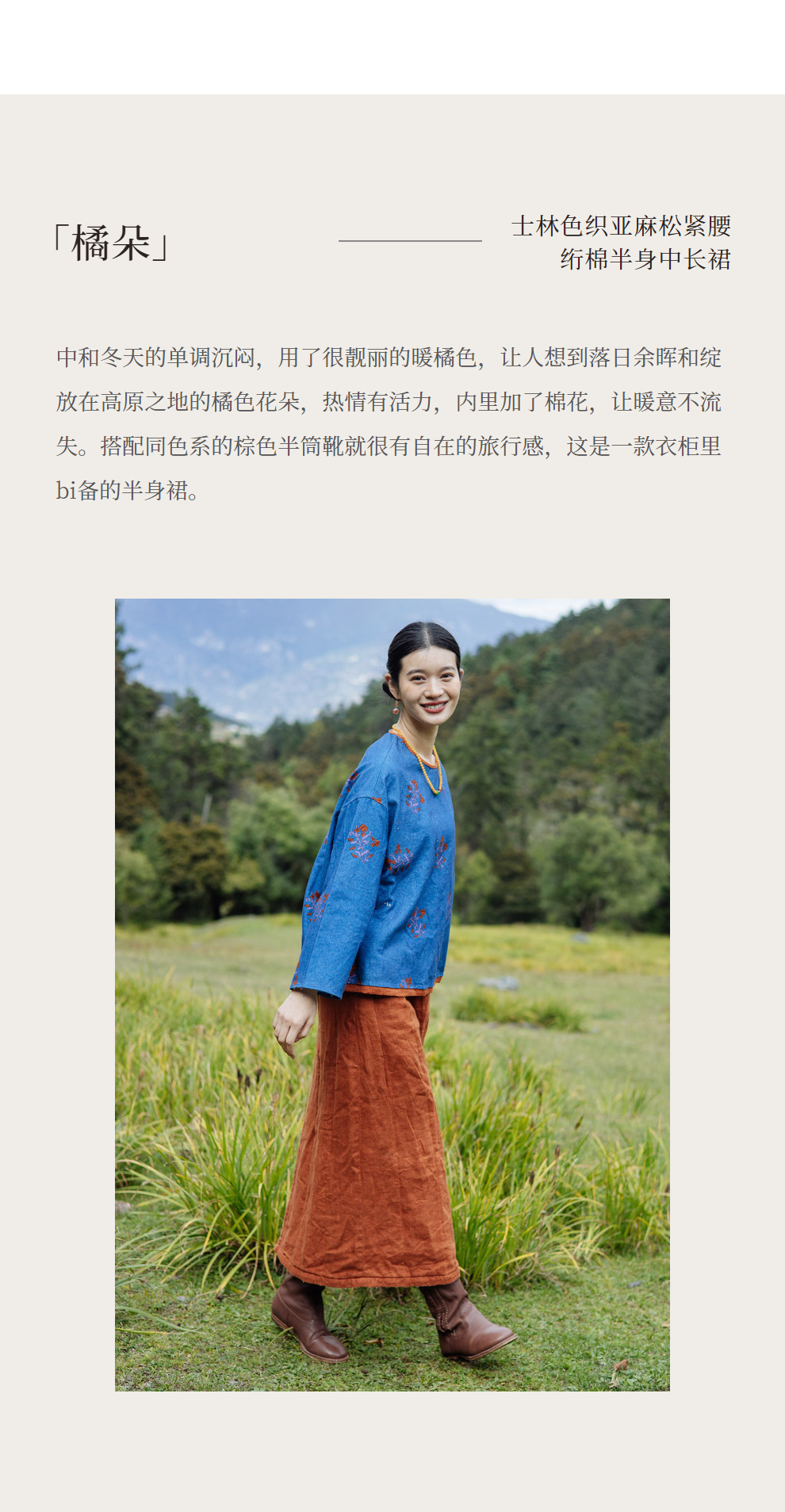 绽放旅行女装785朵/冬季士林色织亚麻松紧腰绗棉百搭半身中长裙
