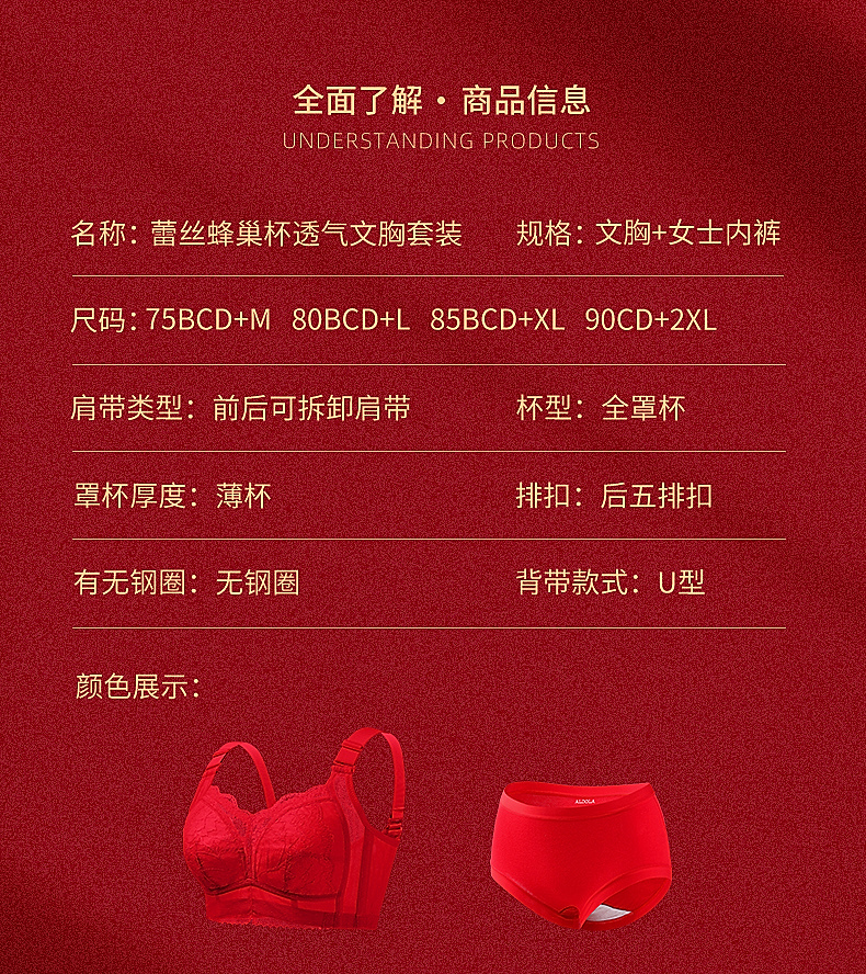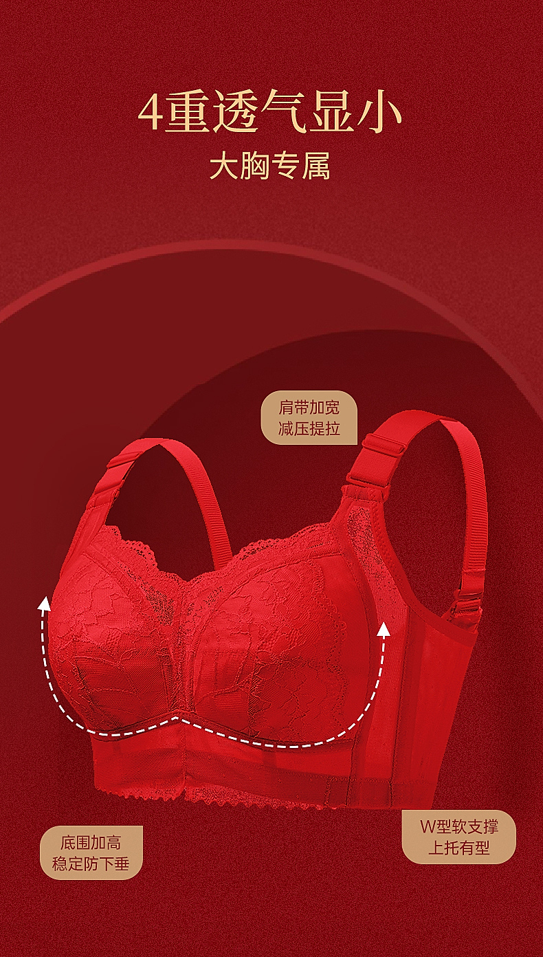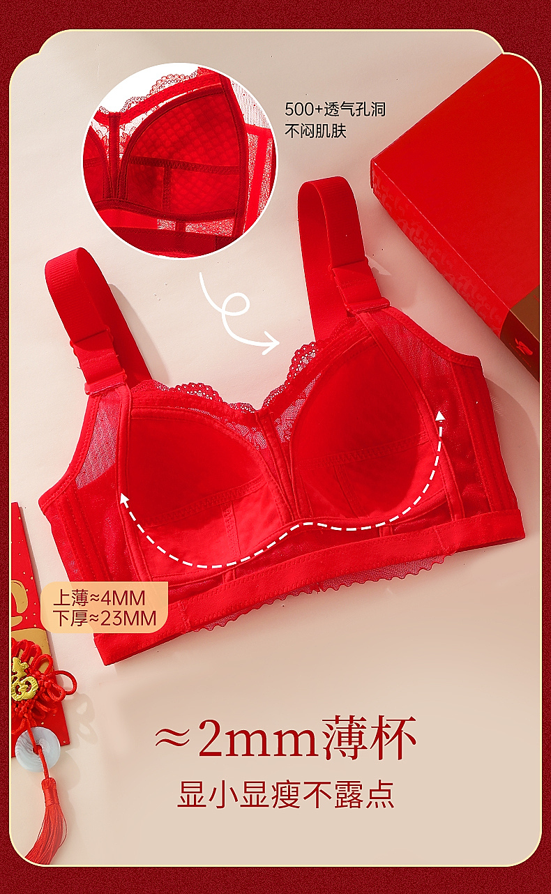 雅黛俪女士文胸大胸显小显瘦本命年红色内衣内裤套装性感蕾丝提拉胸罩