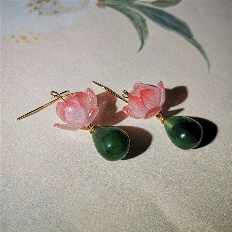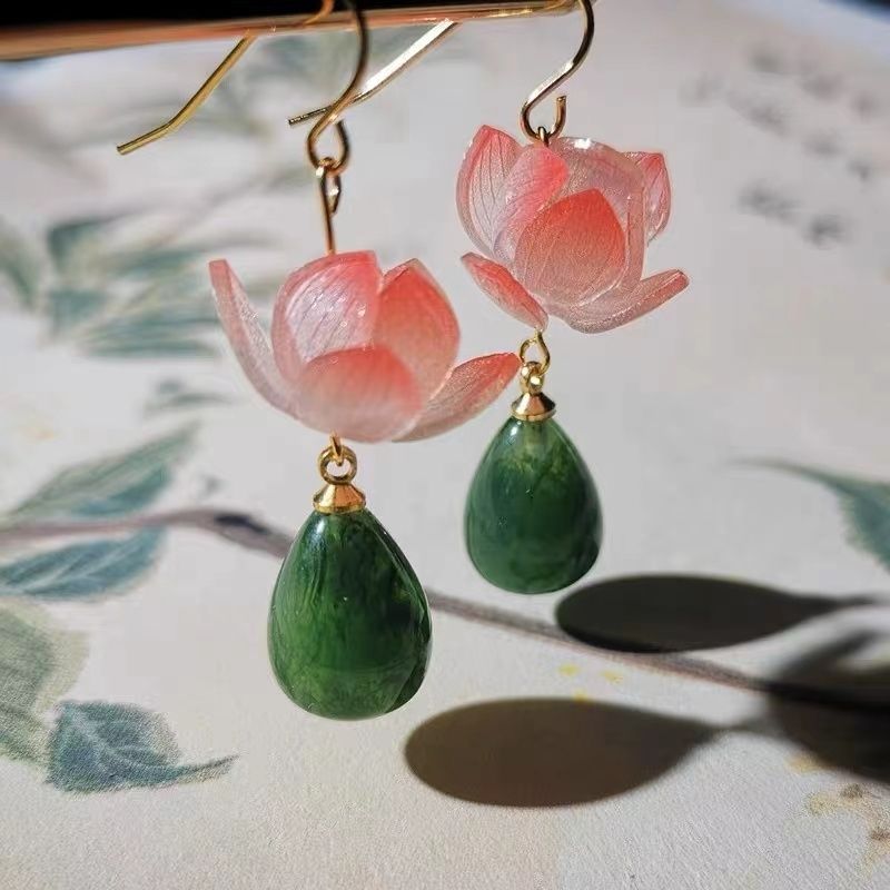 莲花耳坠粉色花朵绿色水滴耳环耳夹中式小众原创设计超仙女风耳饰