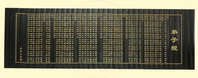 【产品文化】: 弟子规是清朝康熙年间,一位名叫李毓秀(1662-1722)的秀才根据中国儒家经典《论语》里孔子的一句话为纲要把宋朝朱熹朱夫子编的《小学》改编创作成的一本书,论语的原文是这样的:“弟子入则孝,出则悌,谨而信,泛爱众,而亲仁,行有余力,则以学文”。作者把这句话的意思分为了七个部分,以三字一句、两句一韵的方式进行阐述,编成一本书。后来,这本书经过清朝人贾存仁的修订和改编,易名为《弟子规》,成为从那以后相当长一段时期学龄前孩童奠定人生态度并依教奉行一生的一本经典读物。这本书被儒家学者认为是中国优秀传统文化的根基。 【《弟子规》内容】: 总 叙 弟子规 圣人训 首孝弟 次谨信 泛爱众 而亲仁 有余力 则学文 入 则 孝 父母呼 应勿缓 父母命 行勿懒 父母教 须敬听 父母责 须顺承 冬则温 夏则凊 晨则省 昏则定 出必告 反必面 居有常 业无变 事虽小 勿擅为 苟擅为 子道亏 物虽小 勿私藏 苟私藏 亲心伤 亲所好 力为具 亲所恶 谨为去 身有伤 贻亲忧 德有伤 贻亲羞 亲爱我 孝何难 亲憎我 孝方贤 亲有过 谏使更 怡吾色 柔吾声 谏不入 悦复谏 号泣随 挞无怨 亲有疾 药先尝 昼夜侍 不离床 丧三年 常悲咽 居处变 酒肉绝 丧尽礼 祭尽诚 事死者 如事生 出 则 弟 兄道友 弟道恭 兄弟睦 孝在中 财物轻 怨何生 言语忍 忿自泯 或饮食 或坐走 长者先 幼者后 长呼人 即代叫 人不在 己即到 称尊长 勿呼名 对尊长 勿见能 路遇长 疾趋揖 长无言 退恭立 骑下马 乘下车 过犹待 百步余 长者立 幼勿坐 长者坐 命乃坐 尊长前 声要低 低不闻 却非宜 进必趋 退必迟 问起对 视勿移 事诸父 如事父 事诸兄 如事兄 谨 朝起早 夜眠迟 老易至 惜此时 晨必盥 兼漱口 便溺回 辄净手 冠必正 纽必结 袜与履 俱紧切 置冠服 有定位 勿乱顿 致污秽 衣贵洁 不贵华 上循分 下称家 对饮食 勿拣择 食适可 勿过则 年方少 勿饮酒 饮酒醉 最为丑 步从容 立端正 揖深圆 拜恭敬 勿践阈 勿跛倚 勿箕踞 勿摇髀 缓揭帘 勿有声 宽转弯 勿触棱 执虚器 如执盈 入虚室 如有人 事勿忙 忙多错 勿畏难 勿轻略 斗闹场 绝勿近 邪僻事 绝勿问 将入门 问孰存 将上堂 声必扬 人问谁 对以名 吾与我 不分明 用人物 须明求 倘不问 即为偷 借人物 及时还 后有急 借不难 信 凡出言 信为先 诈与妄 奚可焉 话说多 不如少 惟其是 勿佞巧 奸巧语 秽污词 市井气 切戒之 见未真 勿轻言 知未的 勿轻传 事非宜 勿轻诺 苟轻诺 进退错 凡道字 重且舒 勿急疾 勿模糊 彼说长 此说短 不关己 莫闲管 见人善 即思齐 纵去远 以渐跻 见人恶 即内省 有则改 无加警 唯德学 唯才艺 不如人 当自砺 若衣服 若饮食 不如人 勿生戚 闻过怒 闻誉乐 损友来 益友却 闻誉恐 闻过欣 直谅士 渐相亲 无心非 名为错 有心非 名为恶 过能改 归于无 倘掩饰 增一辜 泛 爱 众 凡是人 皆须爱 天同覆 地同载 行高者 名自高 人所重 非貌高 才大者 望自大 人所服 非言大 己有能 勿自私 人所能 勿轻訾 勿谄富 勿骄贫 勿厌故 勿喜新 人不闲 勿事搅 人不安 勿话扰 人有短 切莫揭 人有私 切莫说 道人善 即是善 人知之 愈思勉 扬人恶 即是恶 疾之甚 祸且作 善相劝 德皆建 过不规 道两亏 凡取与 贵分晓 与宜多 取宜少 将加人 先问己 己不欲 即速已 恩欲报 怨欲忘 报怨短 报恩长 待婢仆 身贵端 虽贵端 慈而宽 势服人 心不然 理服人 方无言 亲 仁 同是人 类不齐 流俗众 仁者希 果仁者 人多畏 言不讳 色不媚 能亲仁 无限好 德日进 过日少 不亲仁 无限害 小人进 百事坏 余 力 学 文 不力行 但学文 长浮华 成何人 但力行 不学文 任己见 昧理真 读书法 有三到 心眼口 信皆要 方读此 勿慕彼 此未终 彼勿起 宽为限 紧用功 工夫到 滞塞通 心有疑 随札记 就人问 求确义 房室清 墙壁净 几案洁 笔砚正 墨磨偏 心不端 字不敬 心先病 列典籍 有定处 读看毕 还原处 虽有急 卷束齐 有缺坏 就补之 非圣书 屏勿视 蔽聪明 坏心志 勿自暴 勿自弃 圣与贤 可驯致 命自我作 福自我求 心好命又好 富贵直到老 命好心不好 福变为祸兆 心好命不好 祸转为福报 心命俱不好 遭殃且贫夭 心可挽乎命 最要存仁道 命实造於心 吉凶惟人召 信命不修心 阴阳恐虚矫 修心一听命 天地自相保 【悬挂方法】: 1、竹简两端的竹片背面有绳子,可直接挂在墙上的钉子或者挂钩上; 2、还可以如书法作品一样加画框装裱,更显庄严; 3、如不挂墙上,可直接展开,靠在橱窗或墙壁上。 |