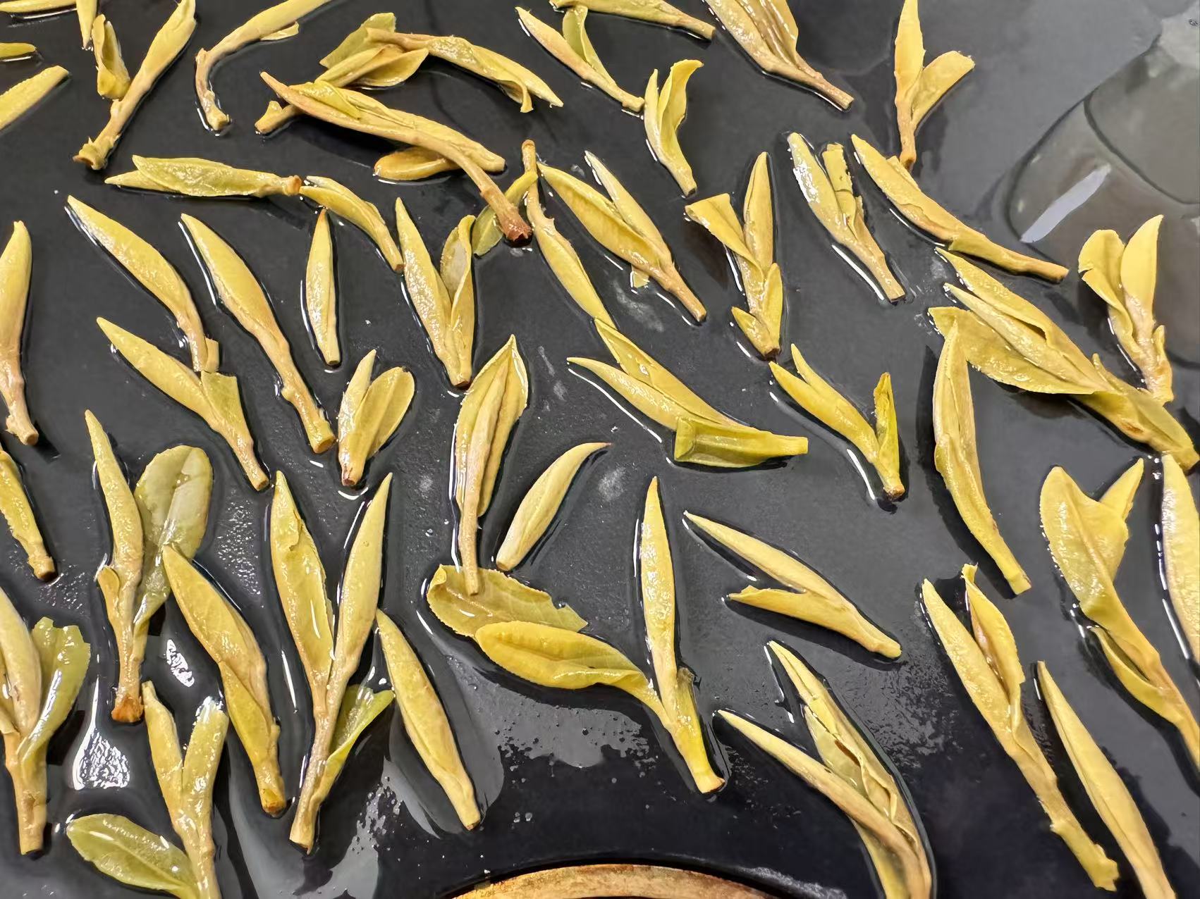 几乎每一个叶片,都带着鱼叶,个别是烘焙前的分筛弄掉了。这是头采的正要证据,无法作假。