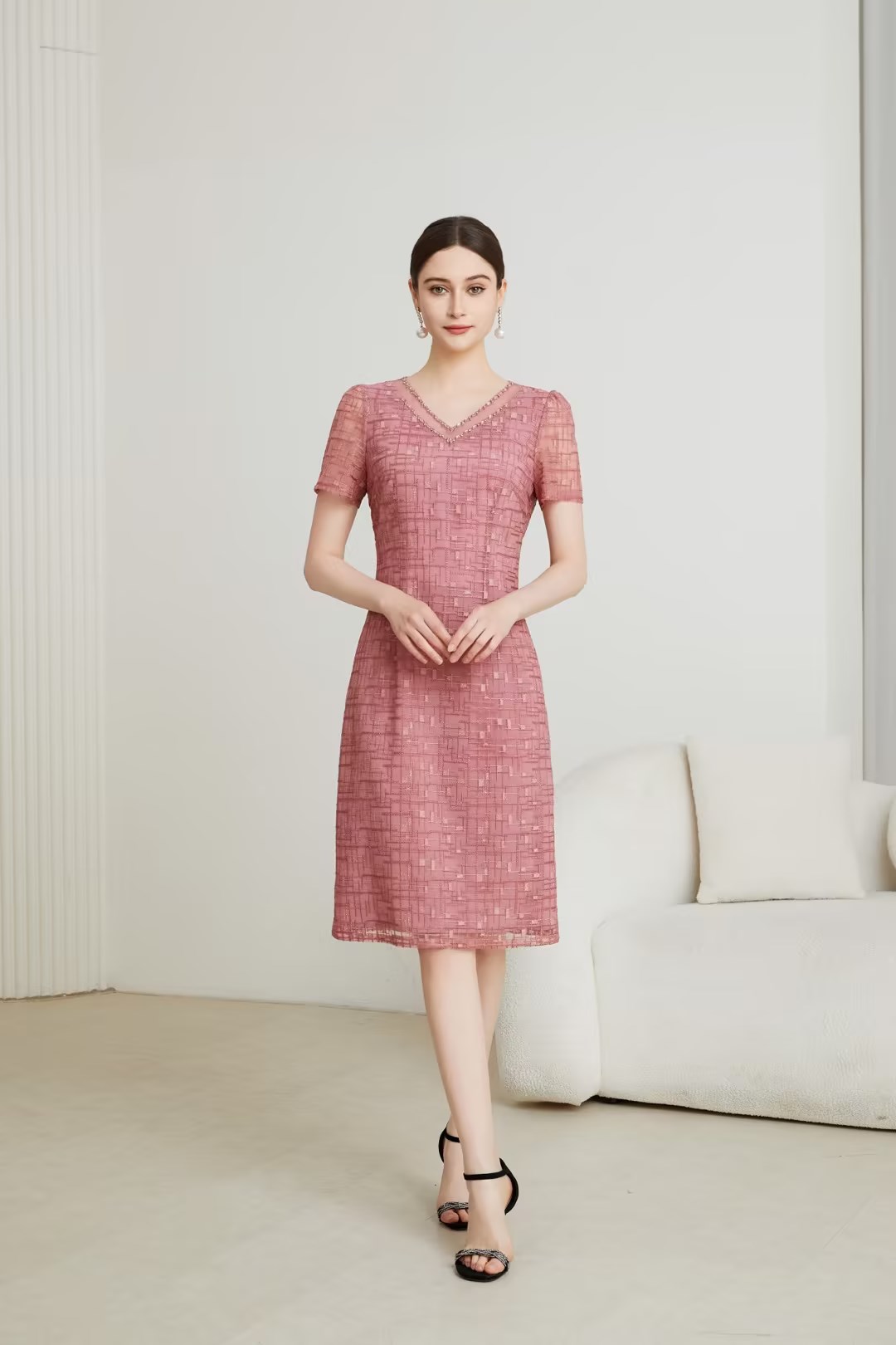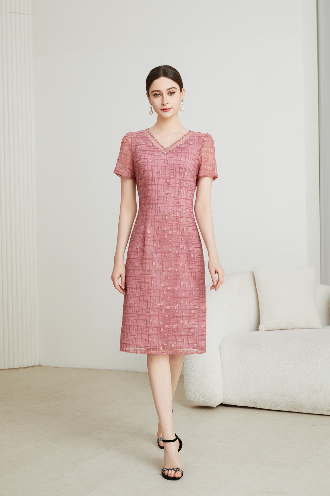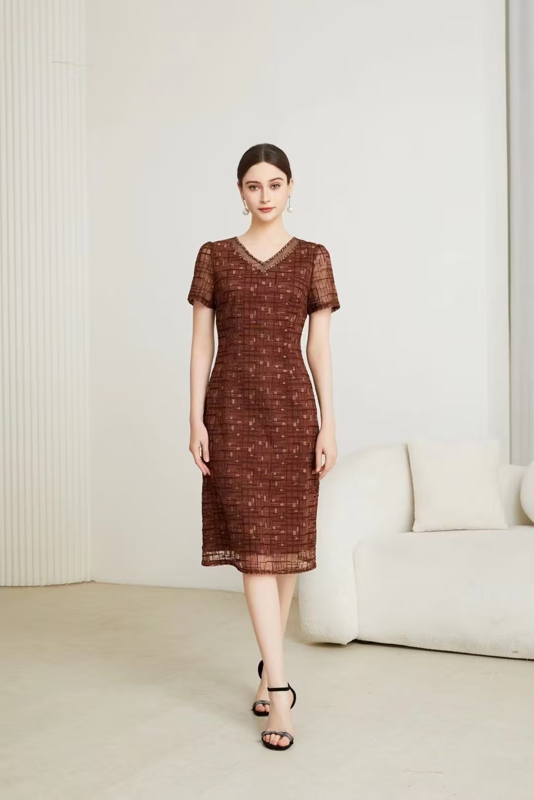 HJ1S90_十样锦 / 栗壳色_连衣裙_四季_气质优雅 V 领蕾丝提花收腰显瘦百搭连衣裙_高级女装_BERNIEELEN 伯妮斯茵