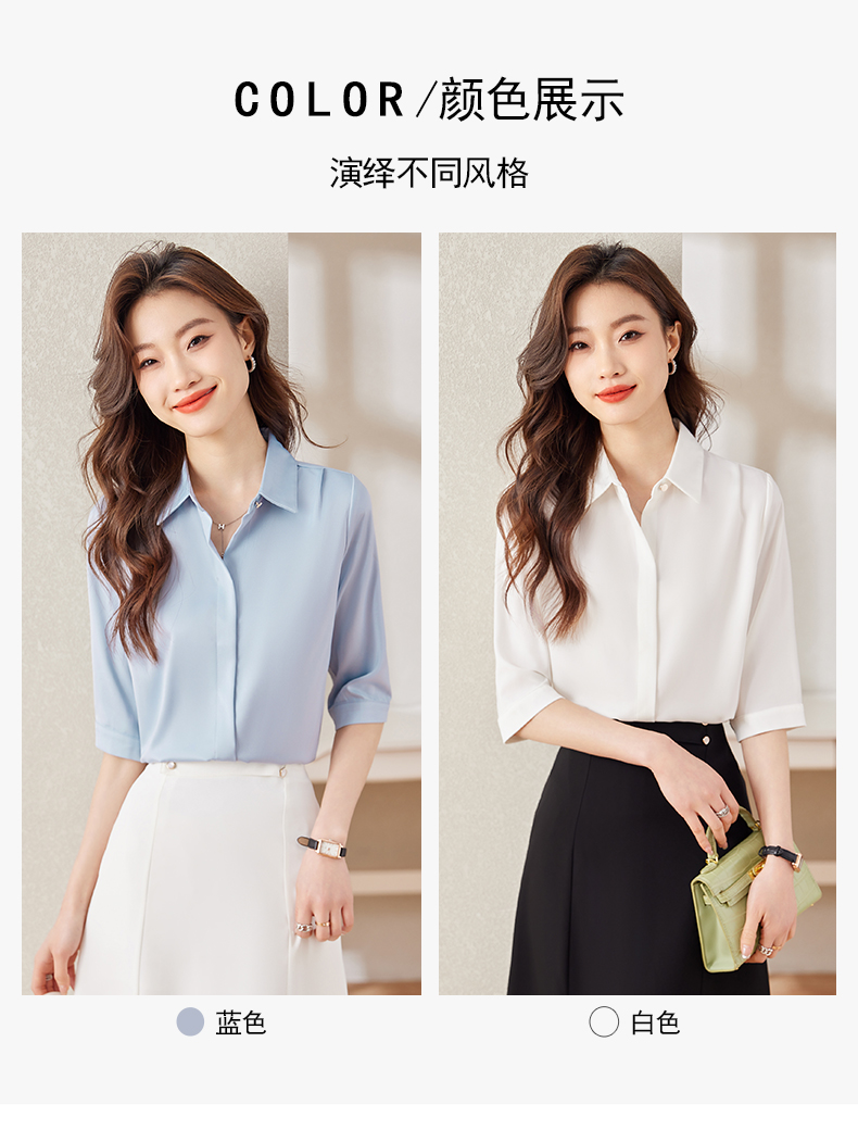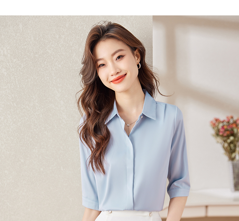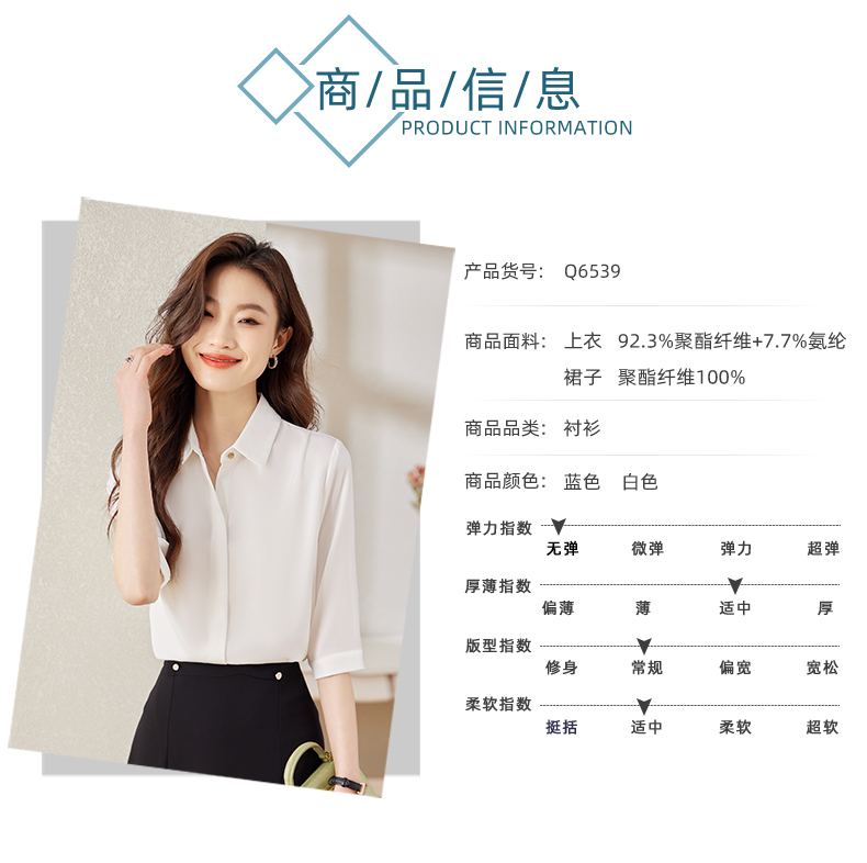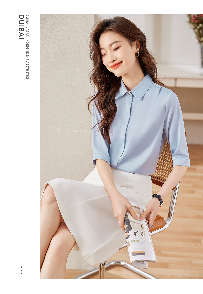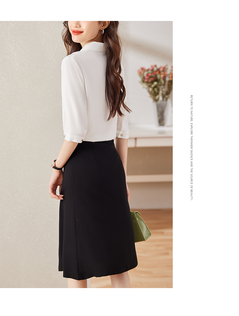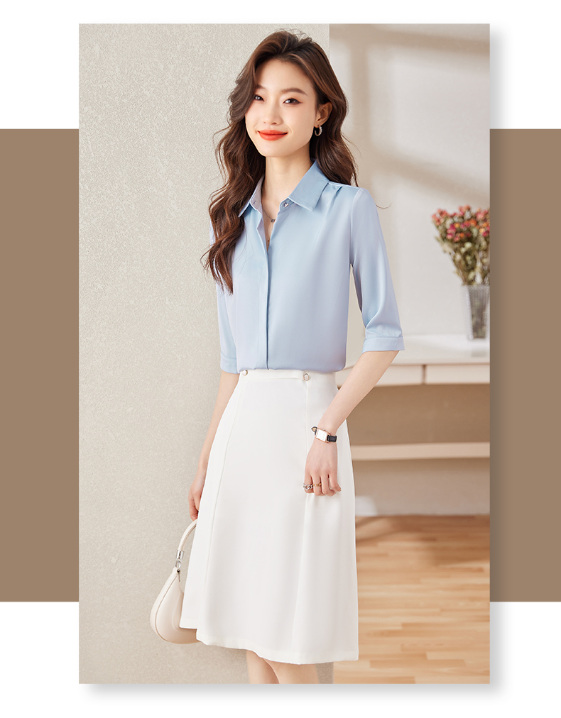 五分袖缎面职业时尚衬衫高腰A字半身裙子两件套