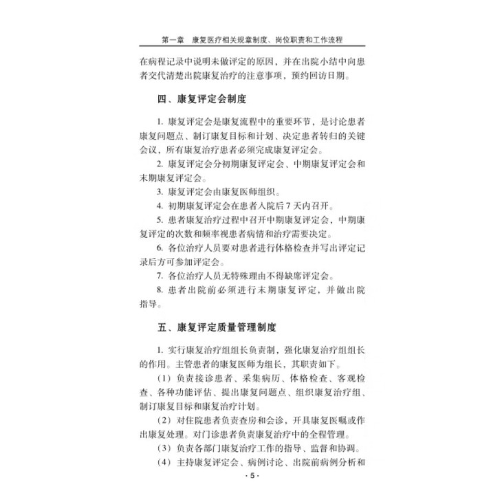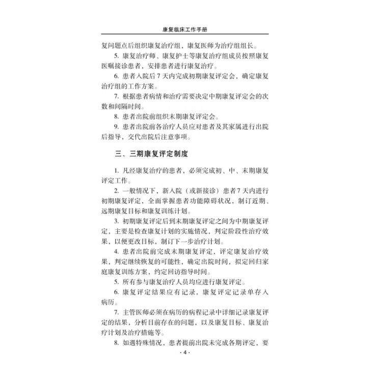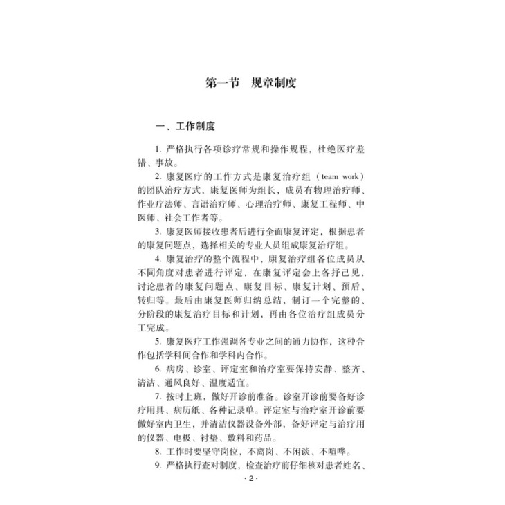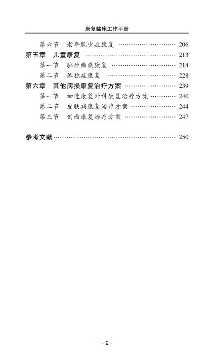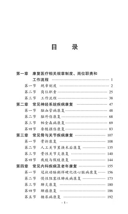 手册分六章。第一章康复医疗相关规章制度、岗位职责和工作流程,介绍满足康复医疗工作需要的相关规章制度、岗位职责和工作流程。第二章常见神经系统疾病康复,介绍脑血管病康复、脑外伤康复、帕金森病康复、脊髓损伤康复。第三章常见骨与关节疾病康复,介绍骨折康复、人工关节置换术后康复、骨性关节炎康复、截肢与假肢康复。第四章常见内科疾病及老年康复,介绍冠状动脉粥样硬化性心脏病康复、慢性阻塞性肺疾病康复、肺炎康复、肺癌康复、糖尿病康复、老年肌少症康复。第五章儿童康复,介绍脑性瘫痪、孤独症康复。第六章其他病损康复治疗方案,介绍加速康复外科康复治疗方案、皮肤病康复治疗方案、创面康复治疗方案等内容。