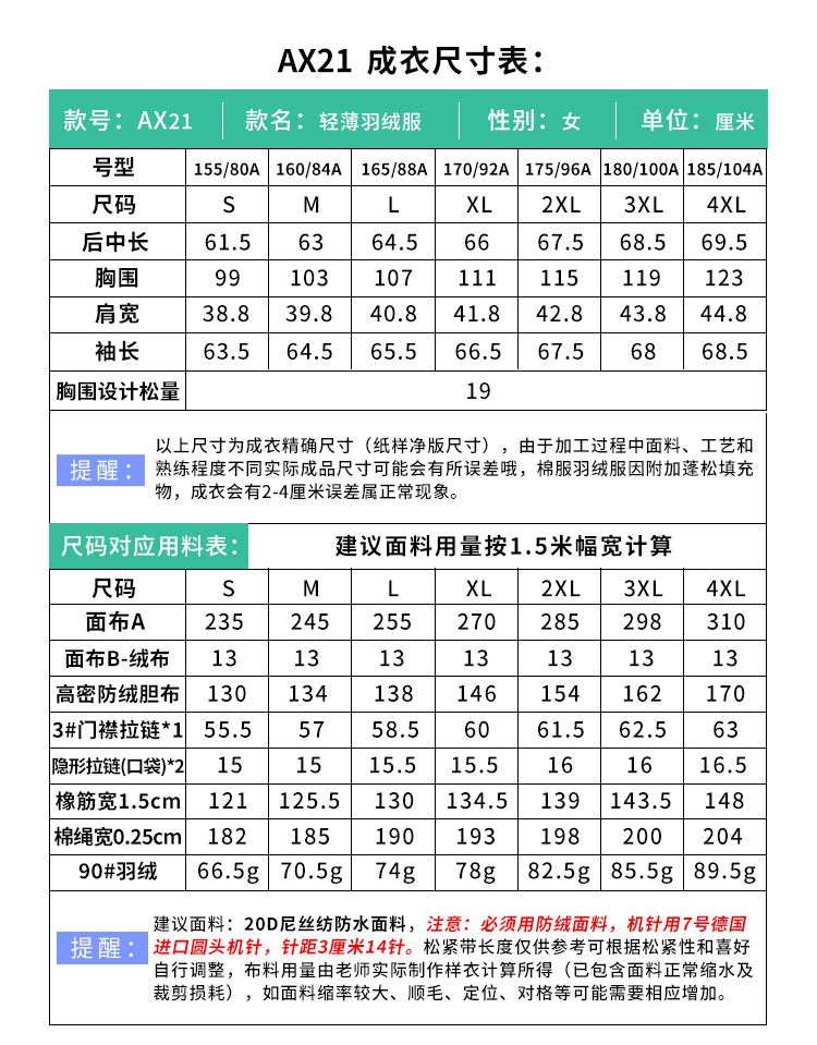 裁缝学苑AX21轻薄羽绒服纸样女装短款立领修身外套服装打板裁剪图