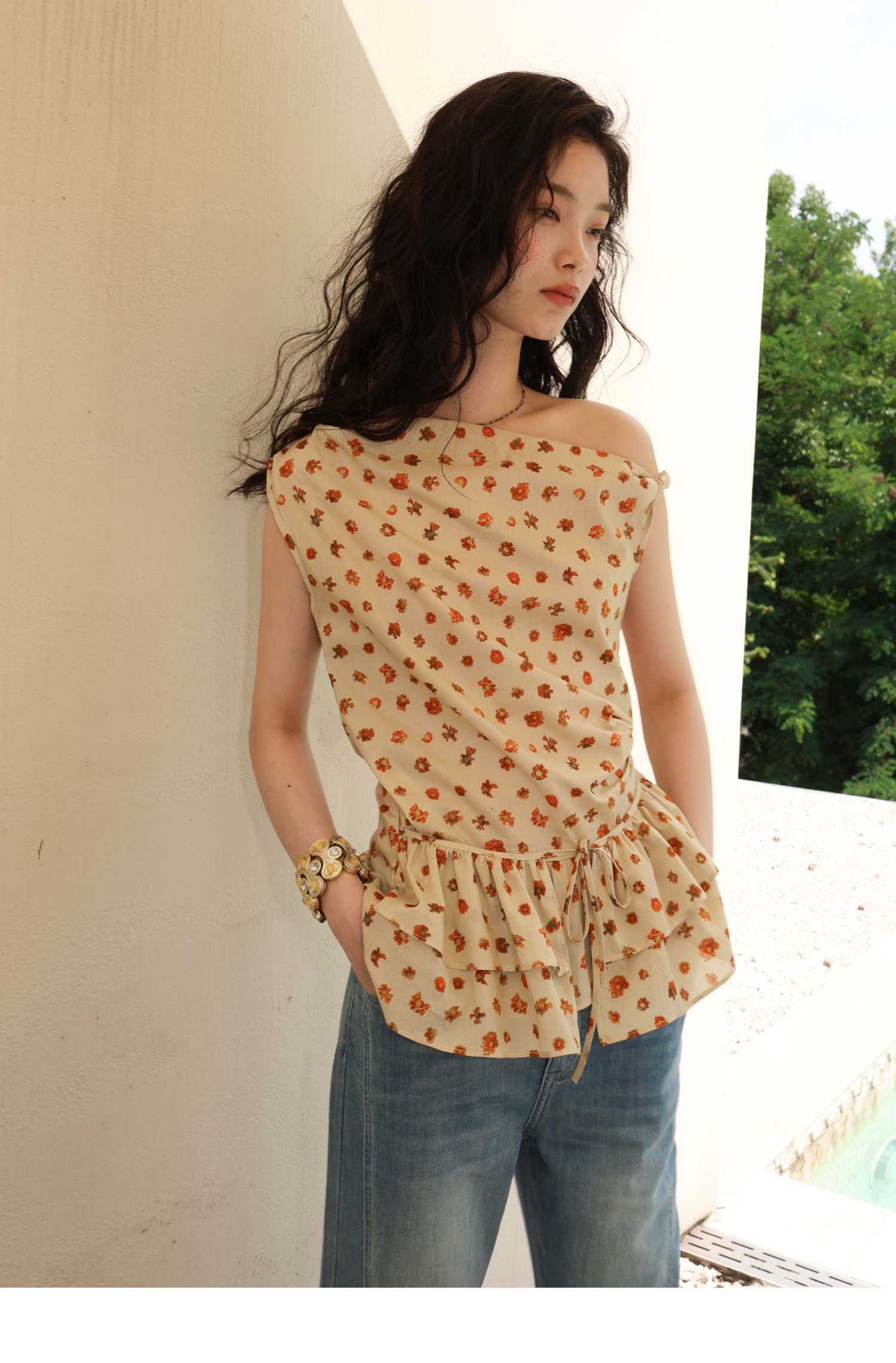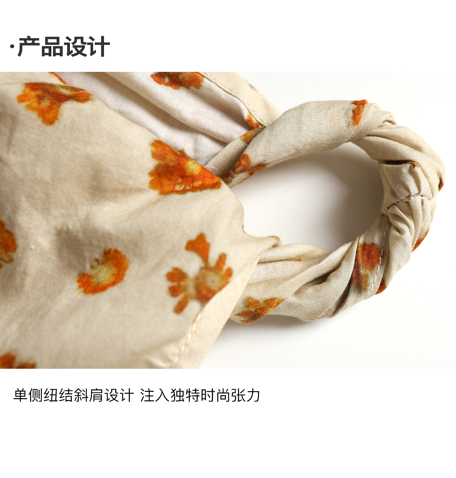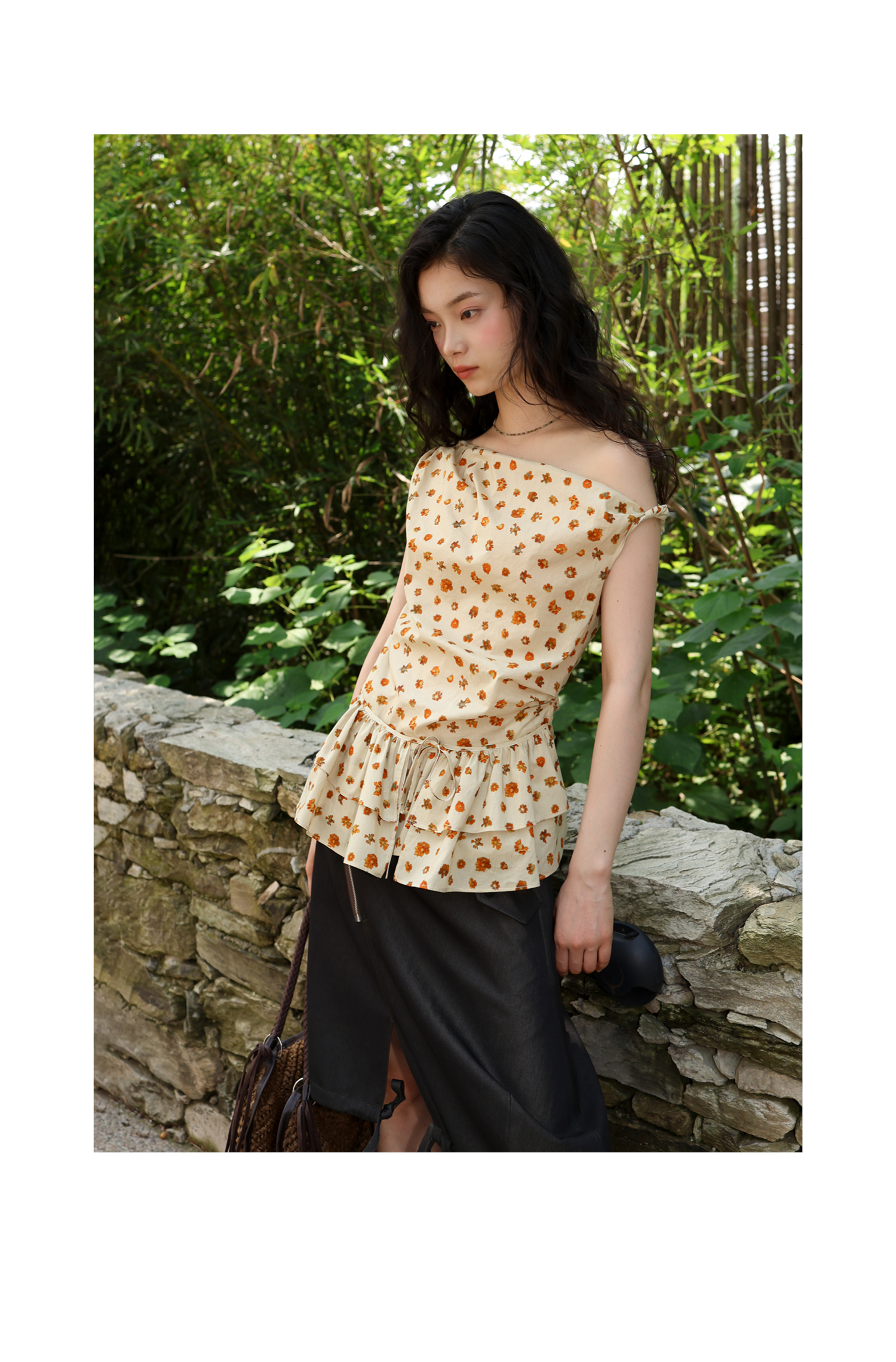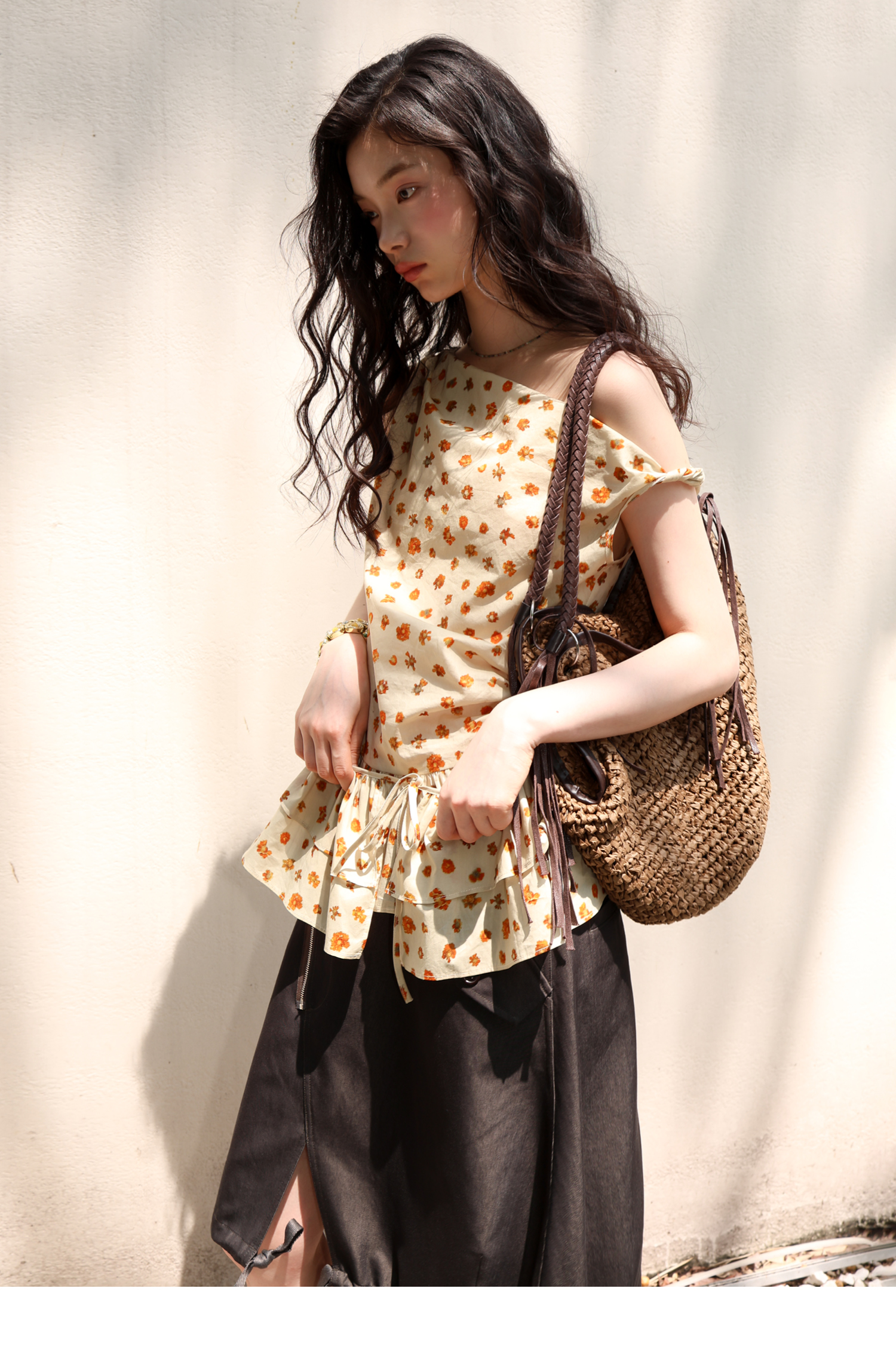 素舶 纯棉轻薄透气橘色花朵印花斜肩下摆花边肩部扭结收腰上衣