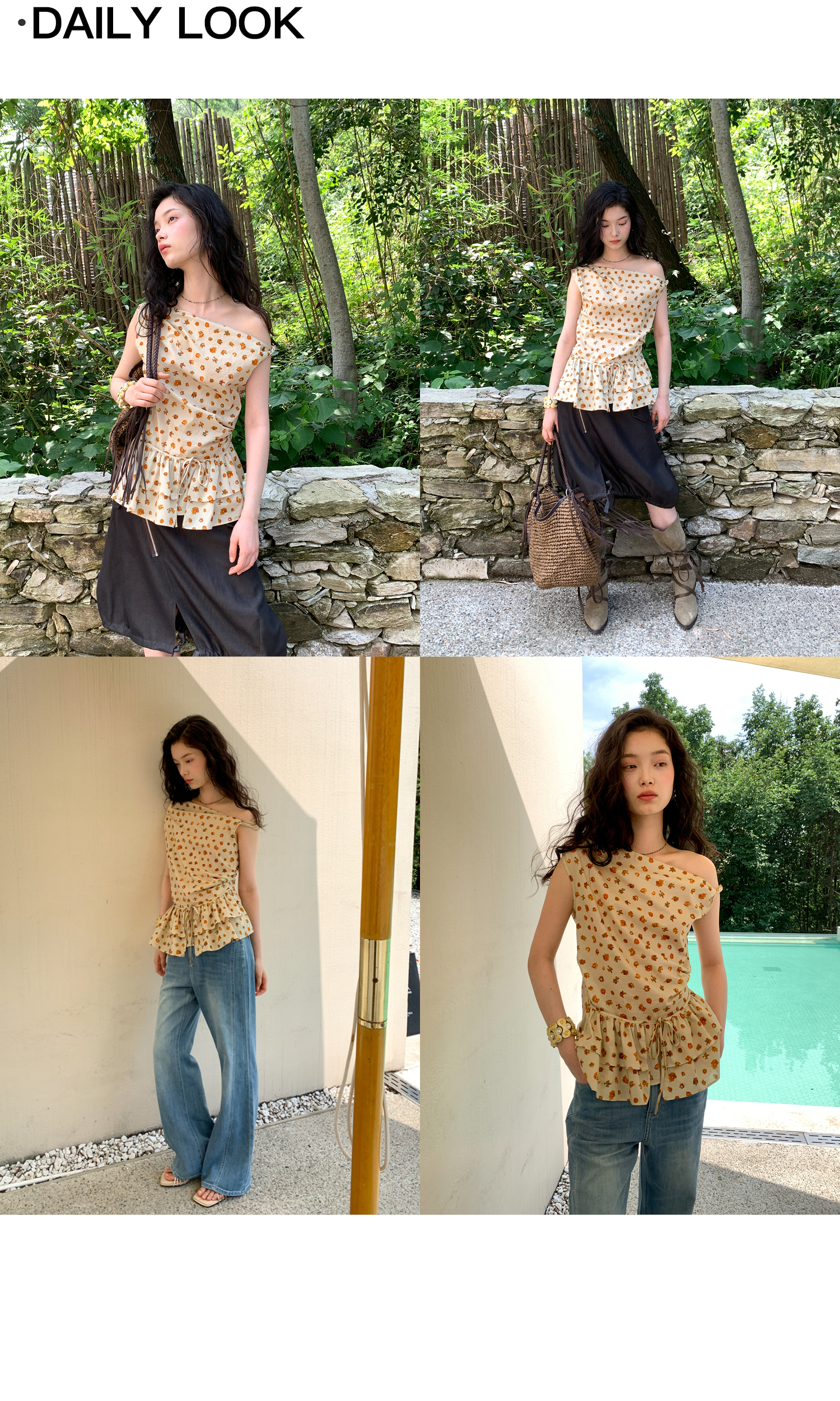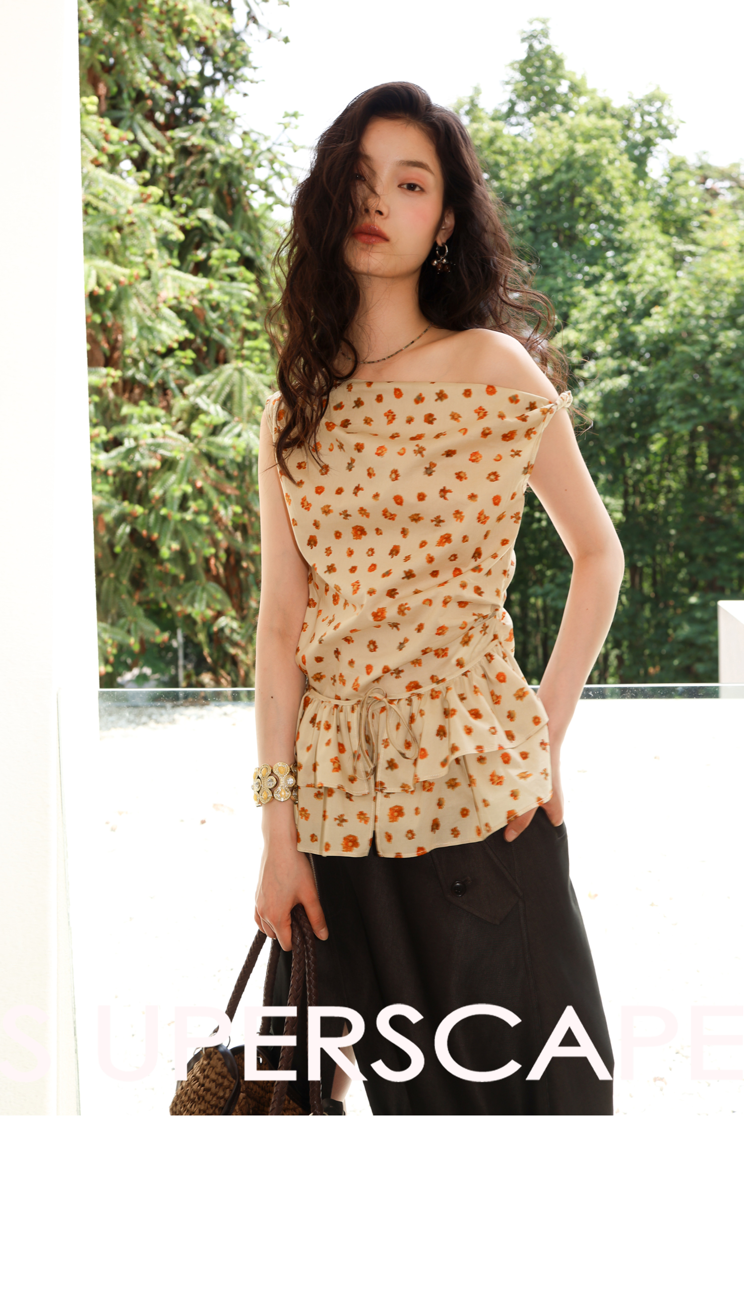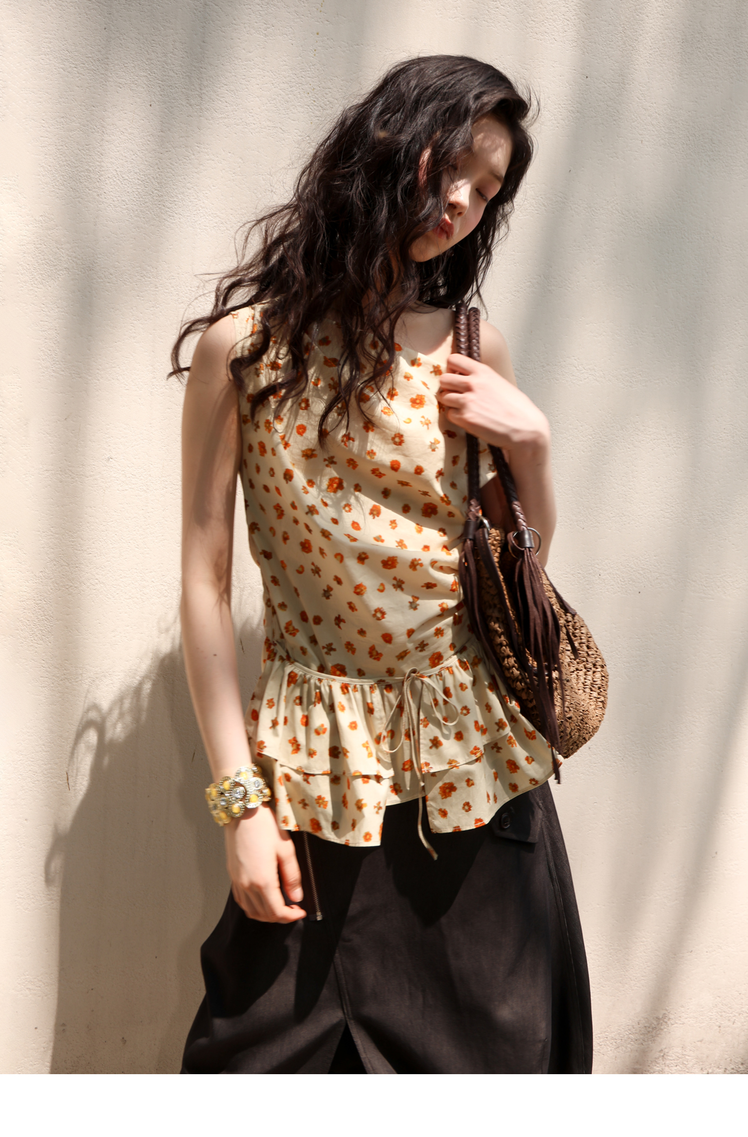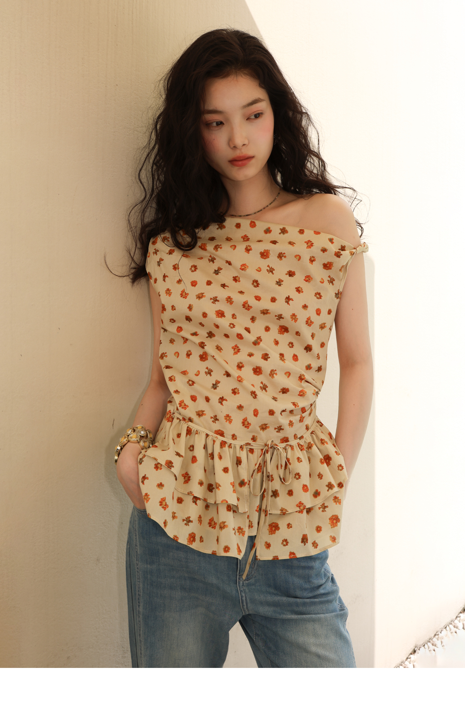 素舶 纯棉轻薄透气橘色花朵印花斜肩下摆花边肩部扭结收腰上衣
