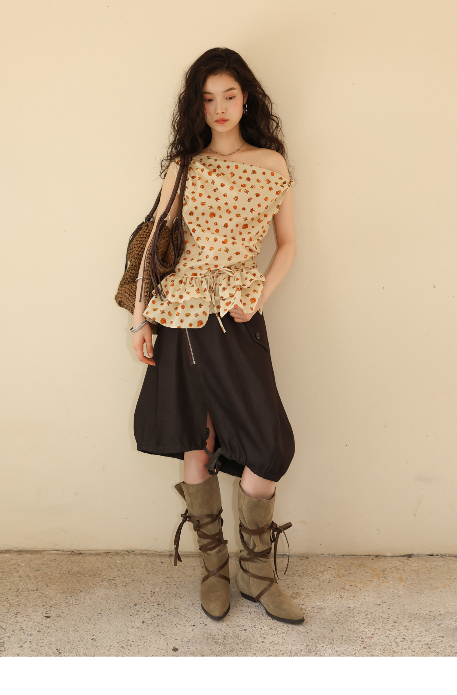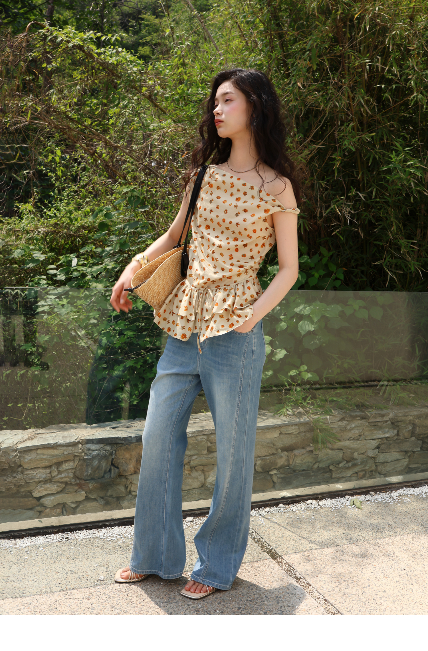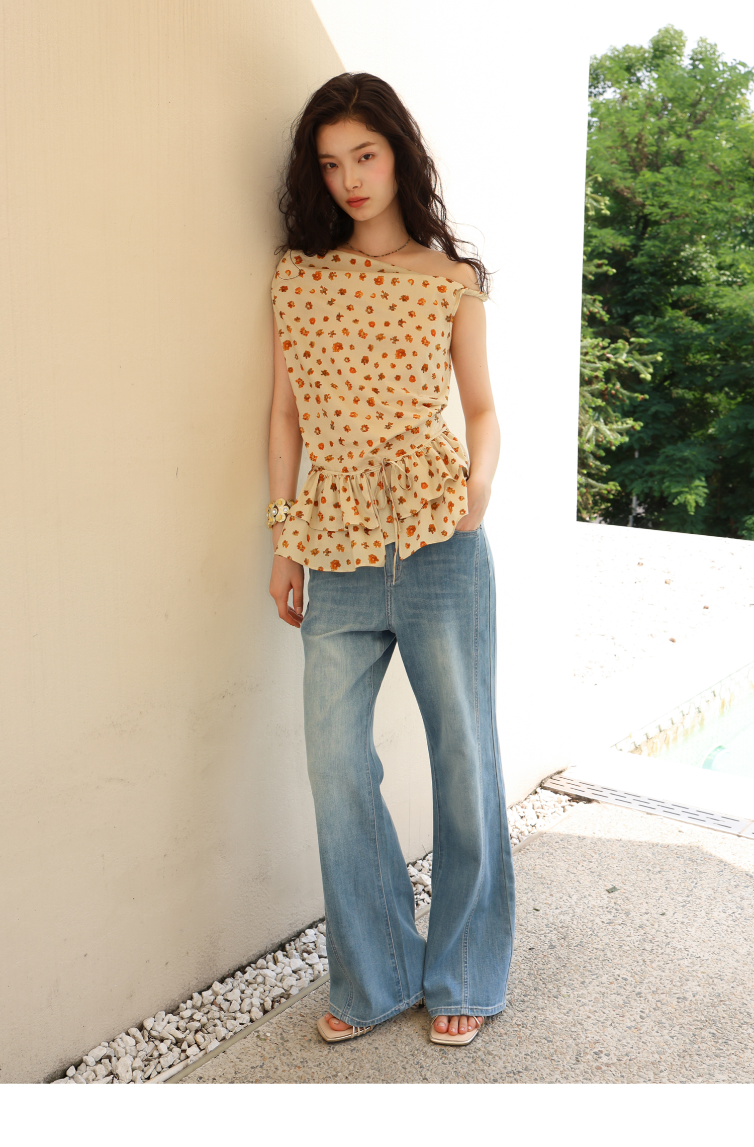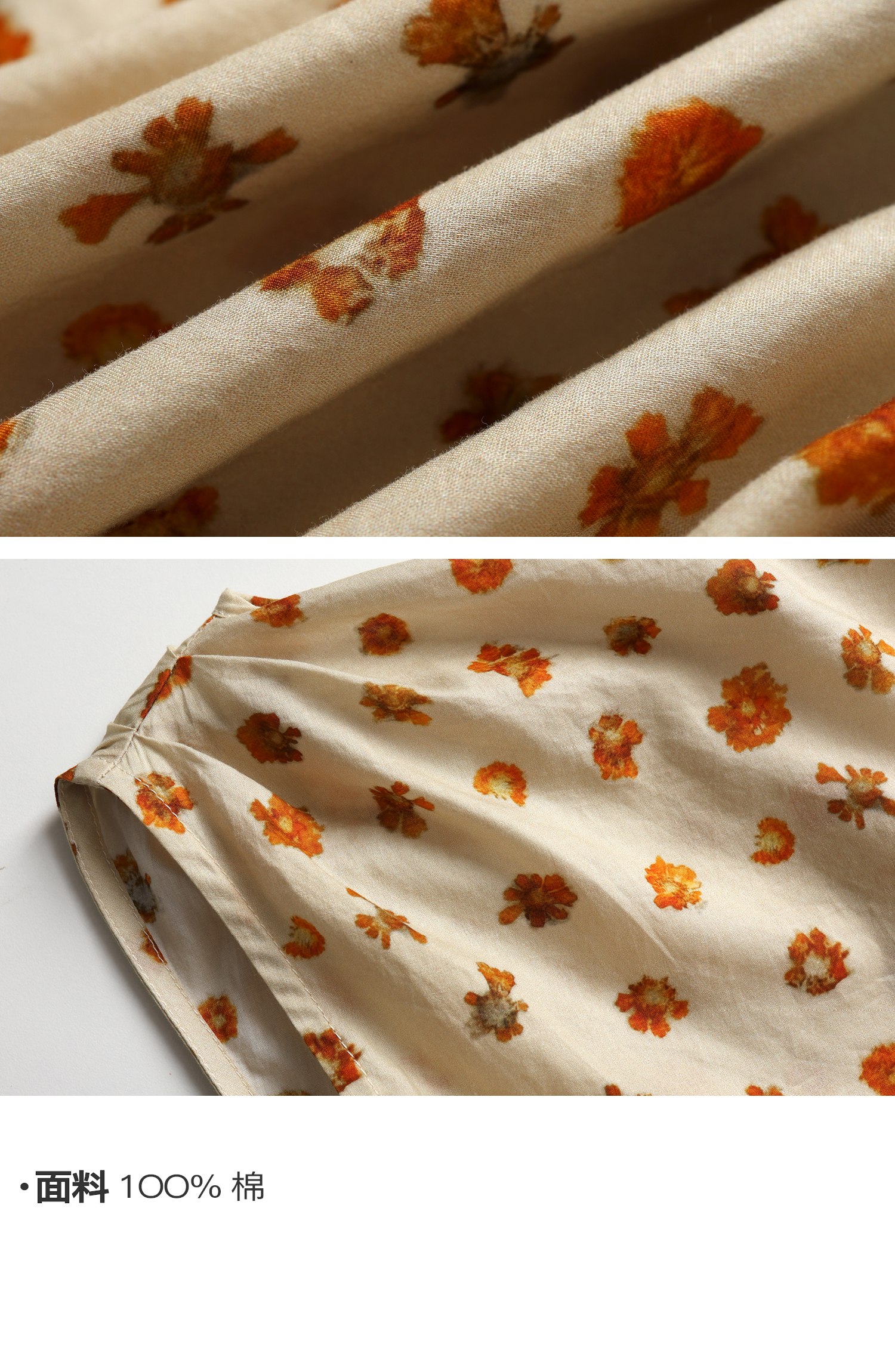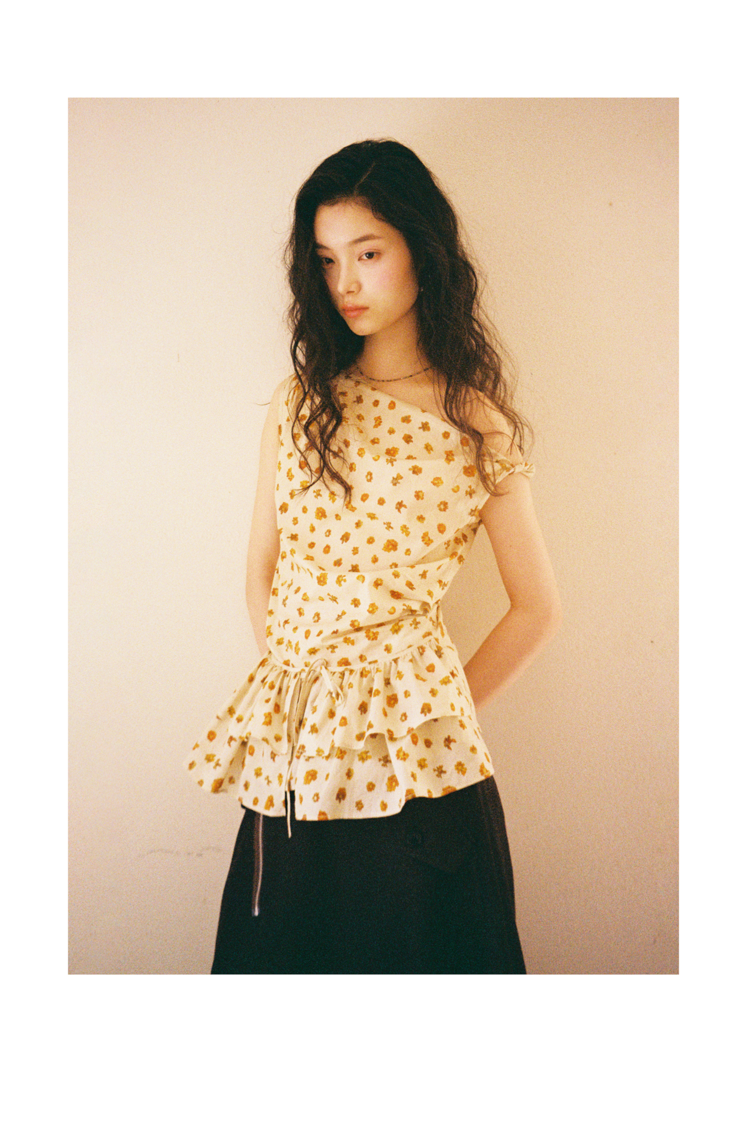 素舶 纯棉轻薄透气橘色花朵印花斜肩下摆花边肩部扭结收腰上衣