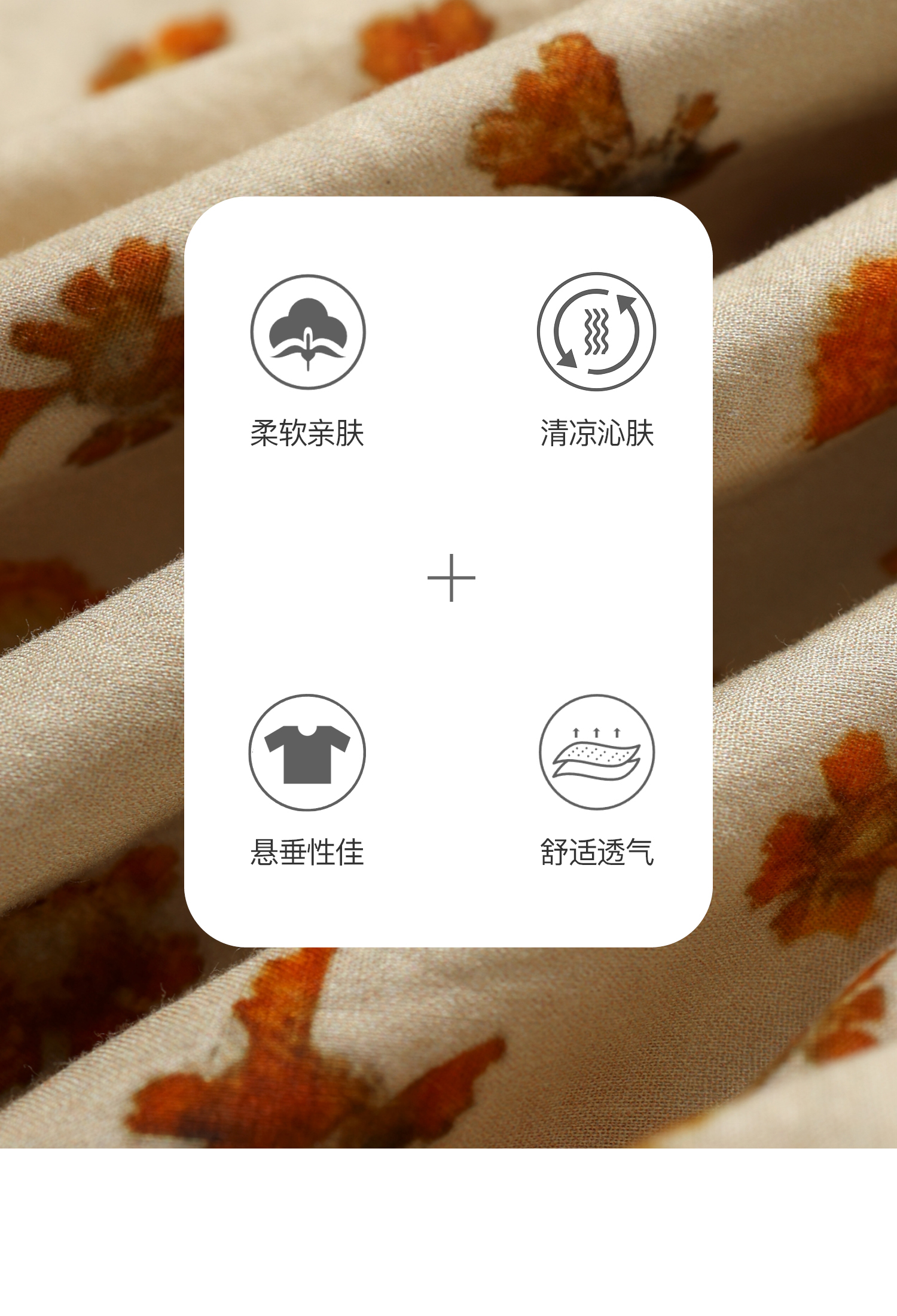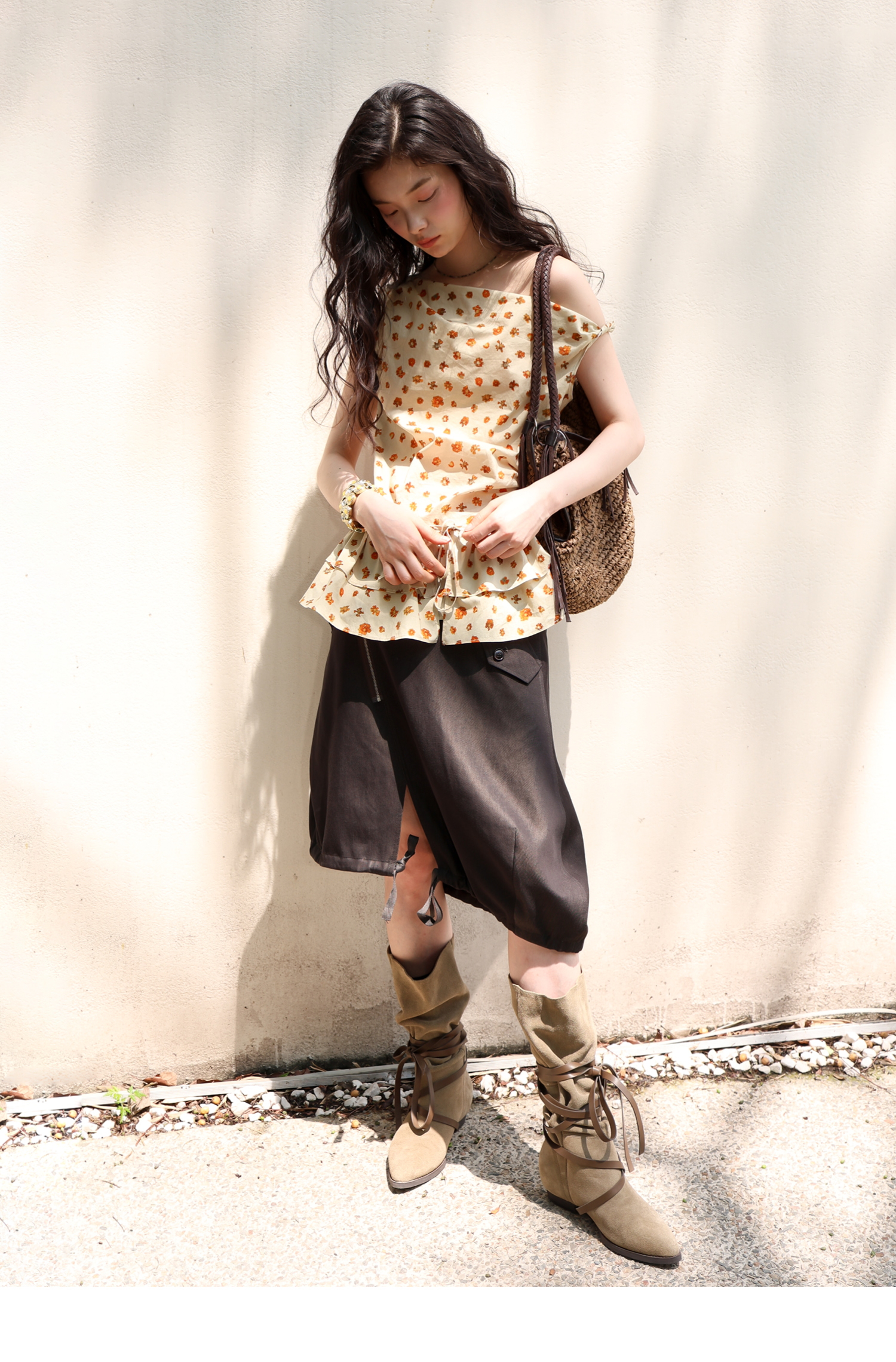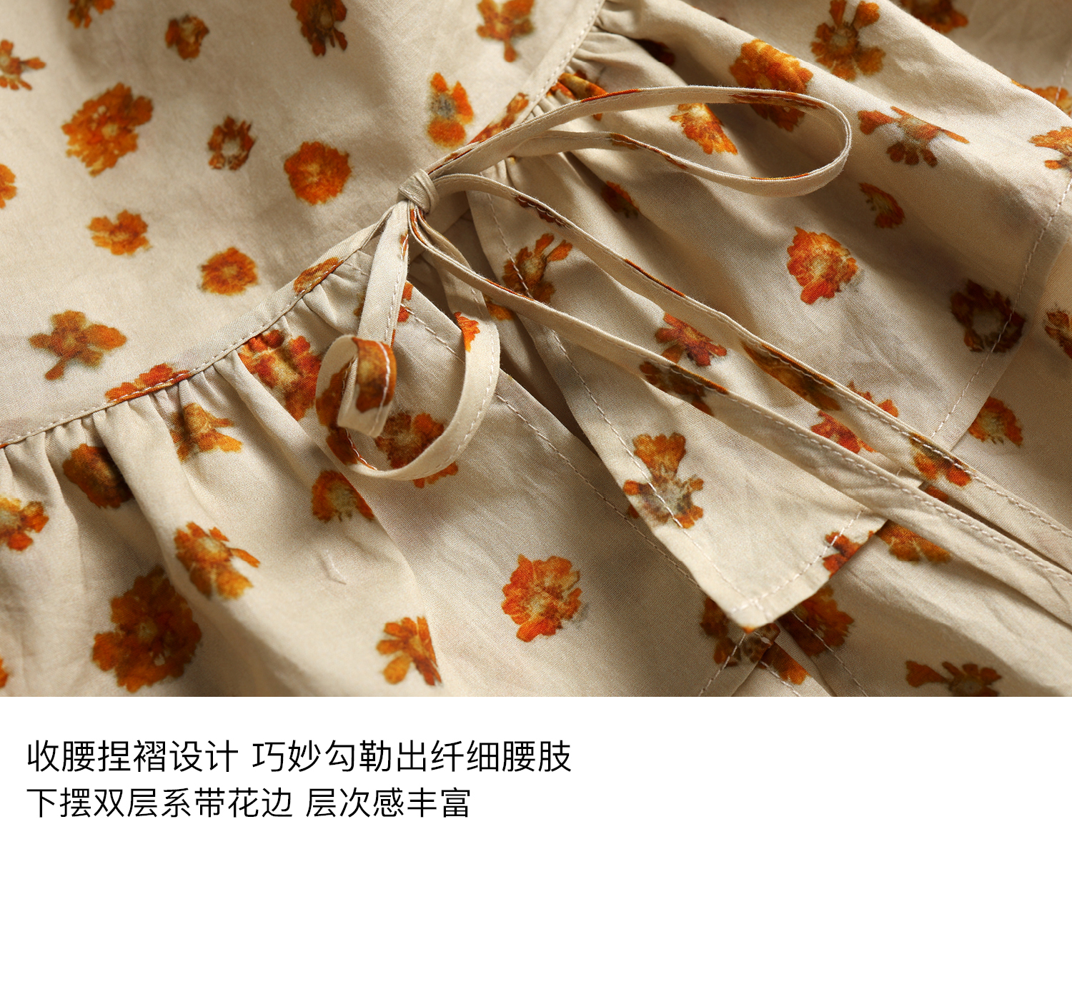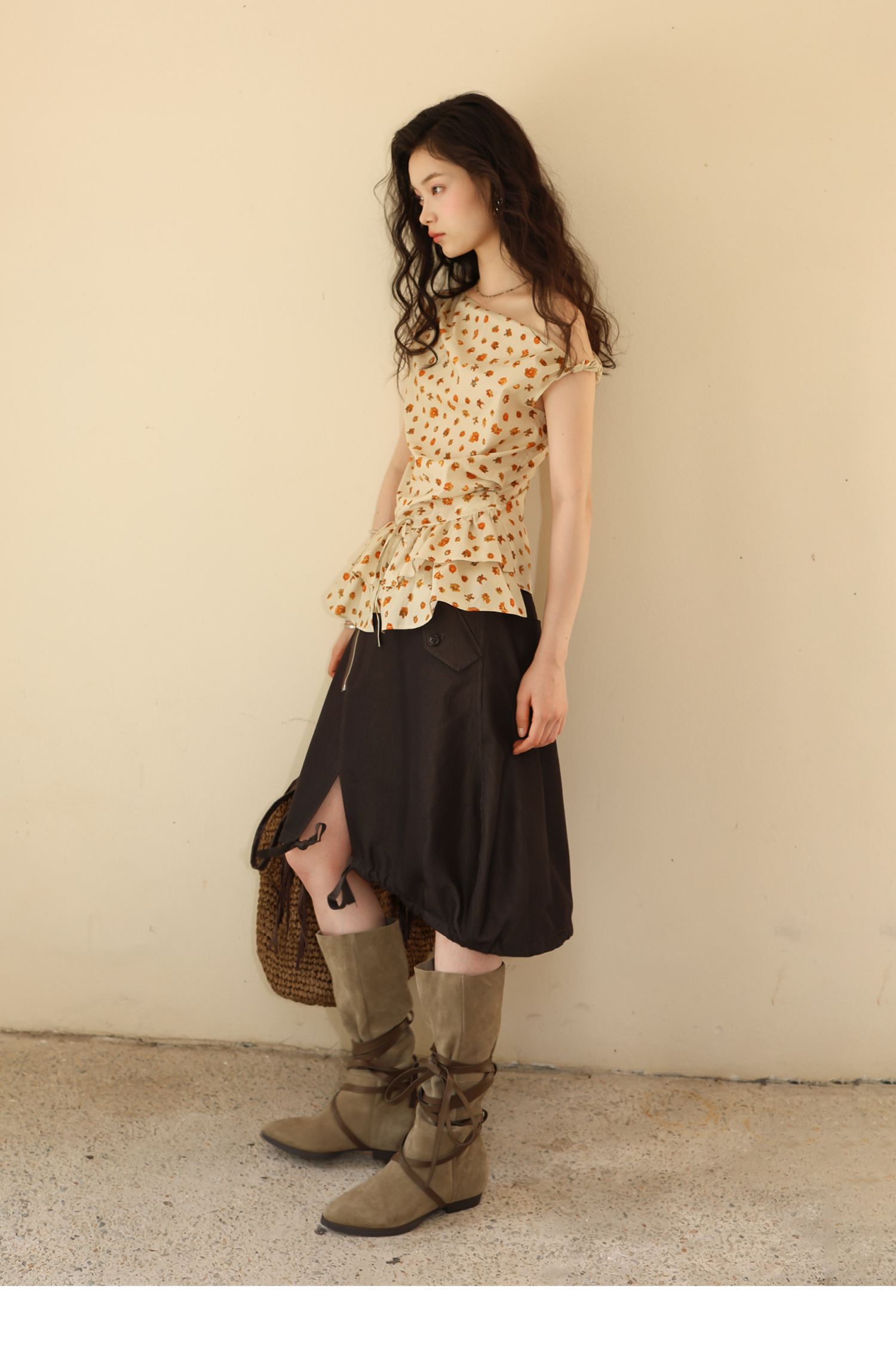 素舶 纯棉轻薄透气橘色花朵印花斜肩下摆花边肩部扭结收腰上衣