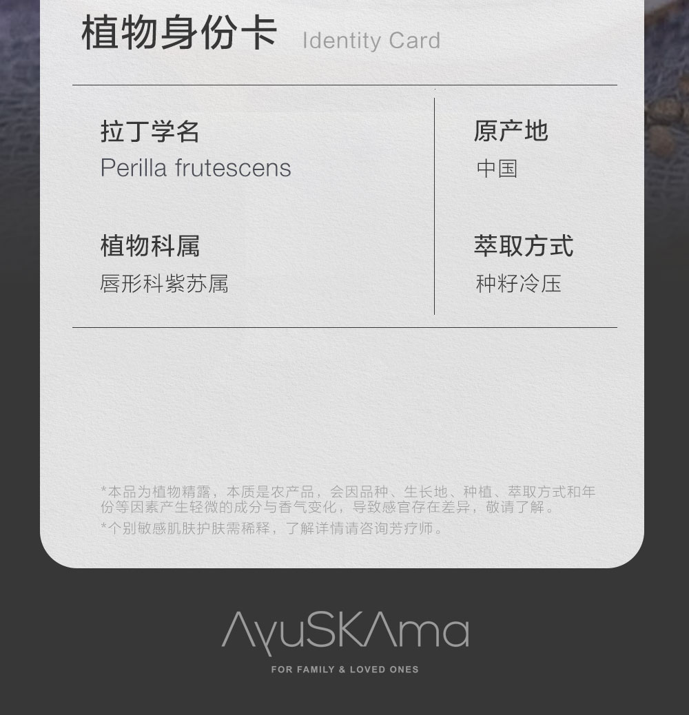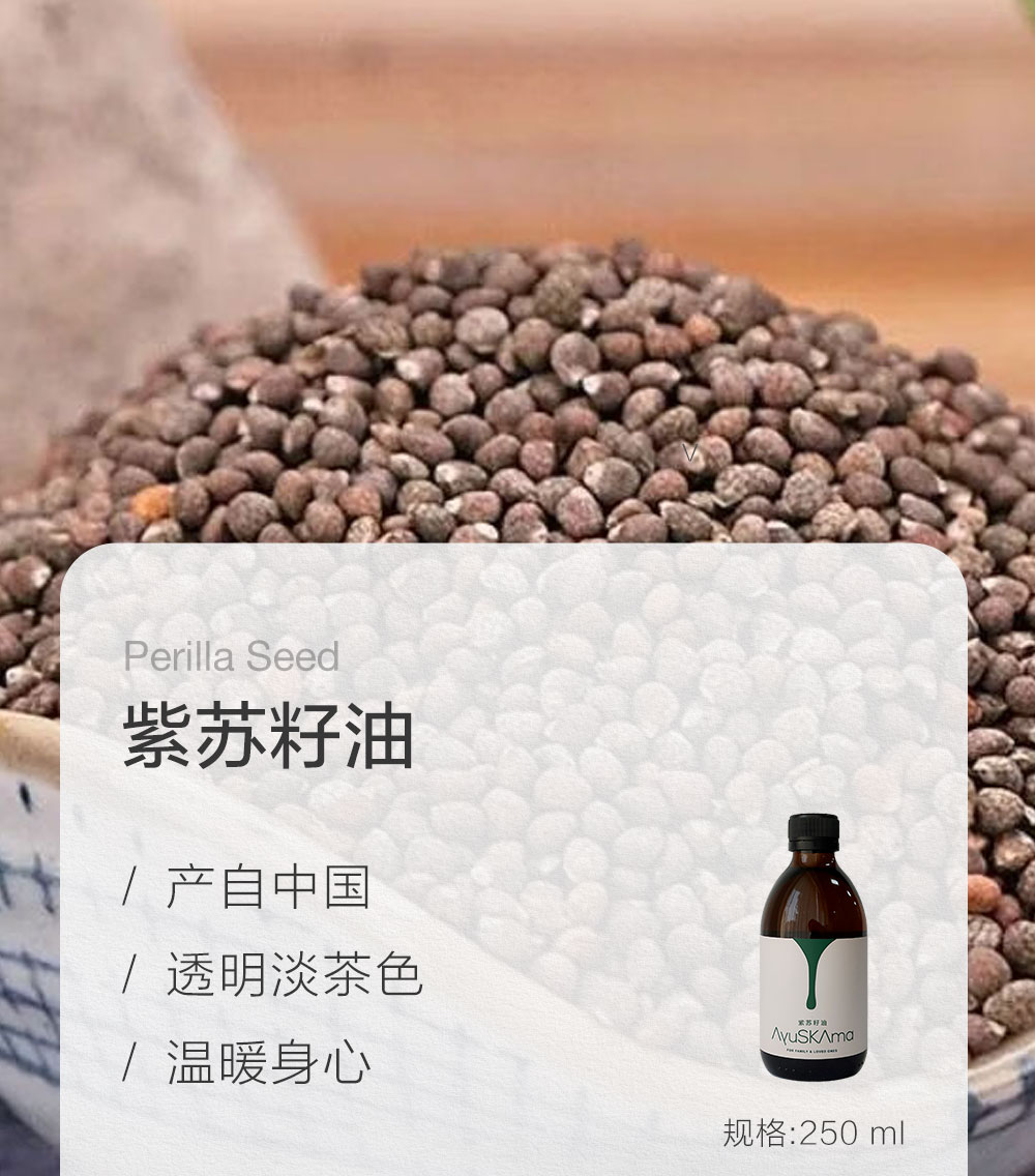 紫苏(学名:Perilla frutescens)是唇形科植物,最早在中国甘肃、陕西的田埂间生长。早在古代,《本经逢原》中就提到"诸香皆燥,唯苏子独润,为虚劳咳嗽之专药"。现代药理学研究也证实了苏子油具有明显的镇咳与平喘作用,对于呼吸道疾病有着良好的辅助治疗效果。Ayu精选优质紫苏籽采用冷压工艺萃取,每一滴油脂都完整保留了种子中的活性营养,让α-亚麻酸(60%)、亚油酸(15%)、油酸(12%)等核心成分得以完美留存。
