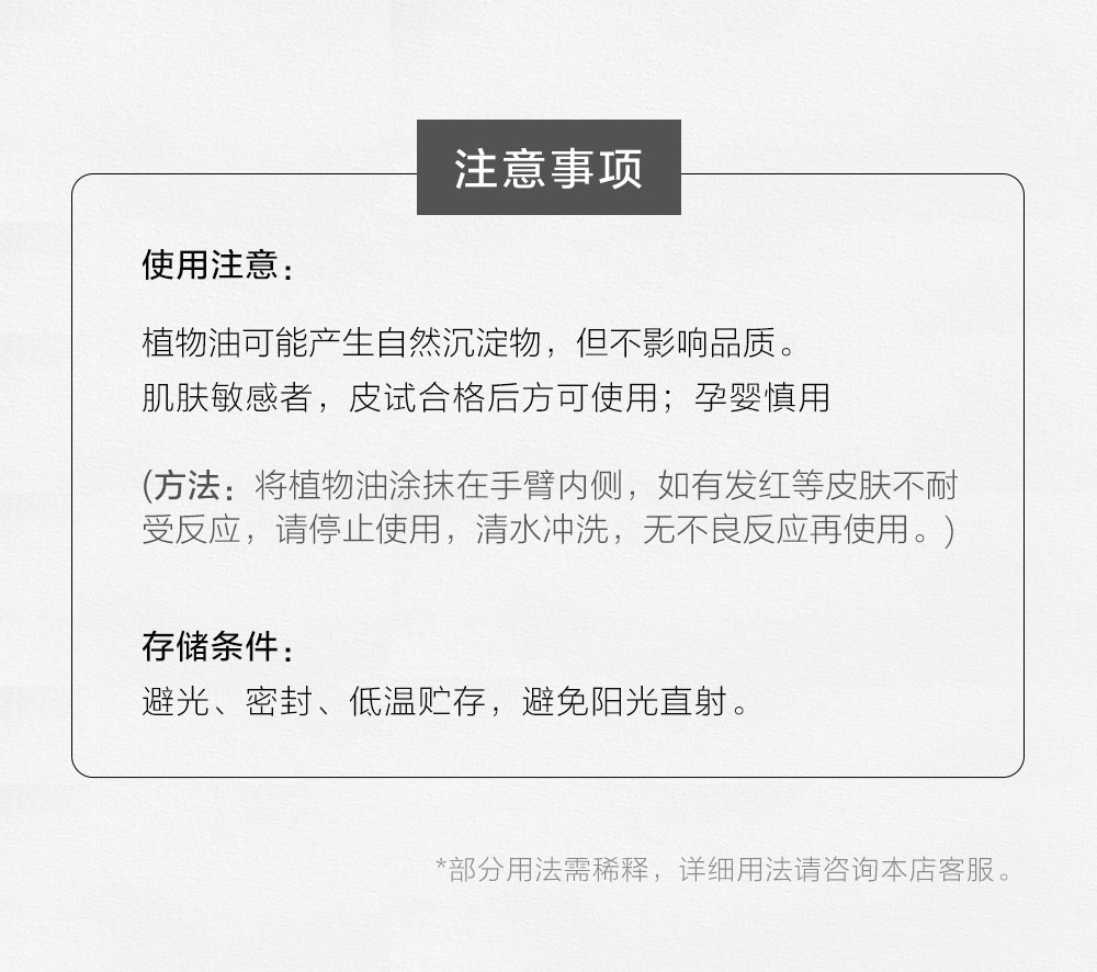 护肤保养:可作为脸部油浴油,也可以做按摩油使用。推荐每日洗澡后,全身涂抹按摩至吸收,坚持使用,有极佳抗氧化抗衰的效果。调配合适的精油和其它植物油使用,效果更佳。