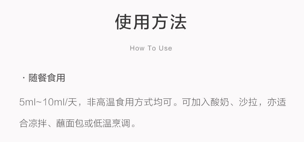 保养心血管系统、脑部与眼睛:5ml~10ml/天。随餐食用,非高温食用方式均可。可加入酸奶、沙拉,亦适合凉拌、蘸面包或低温烹调。