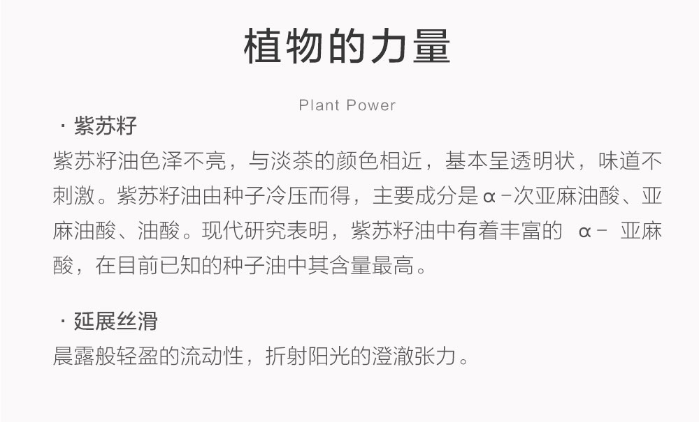 紫苏籽油由种子冷压而得,主要成分是α-次亚麻油酸 60%、亚麻油酸 15%、油酸12%。口服可以保养心血管系统、脑部与眼睛,外用则是可以作为熟龄与敏感肌肤的日常保养用油,长时间使用可以抚平细纹、消炎、抗过敏,稳定皮肤状态,具有降低胆固醇、抗癌、提高免疫力、止咳平喘、改善情绪等生理功能。