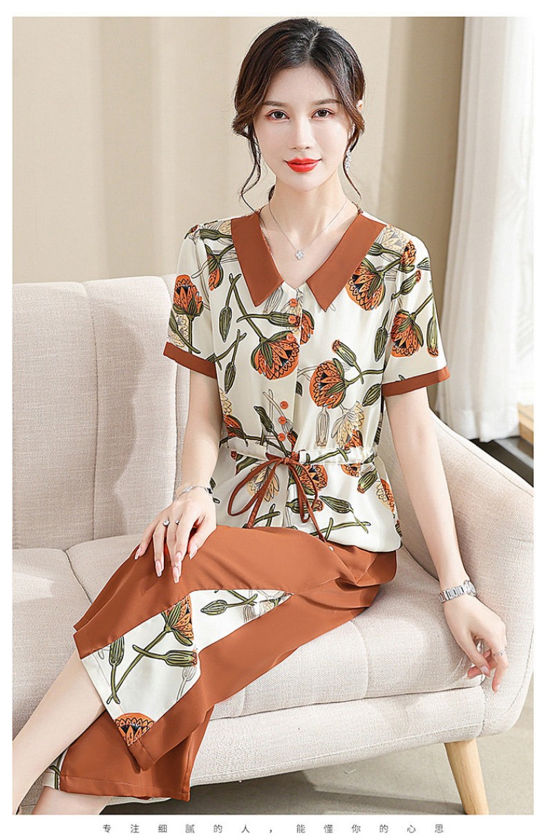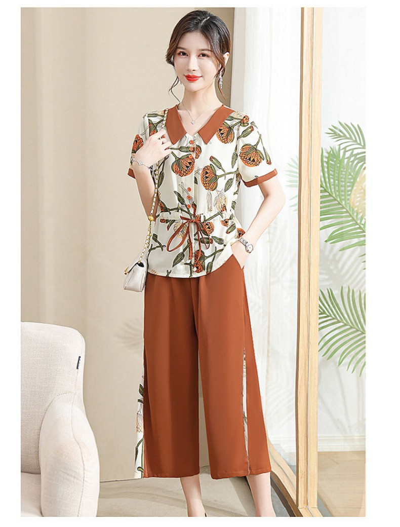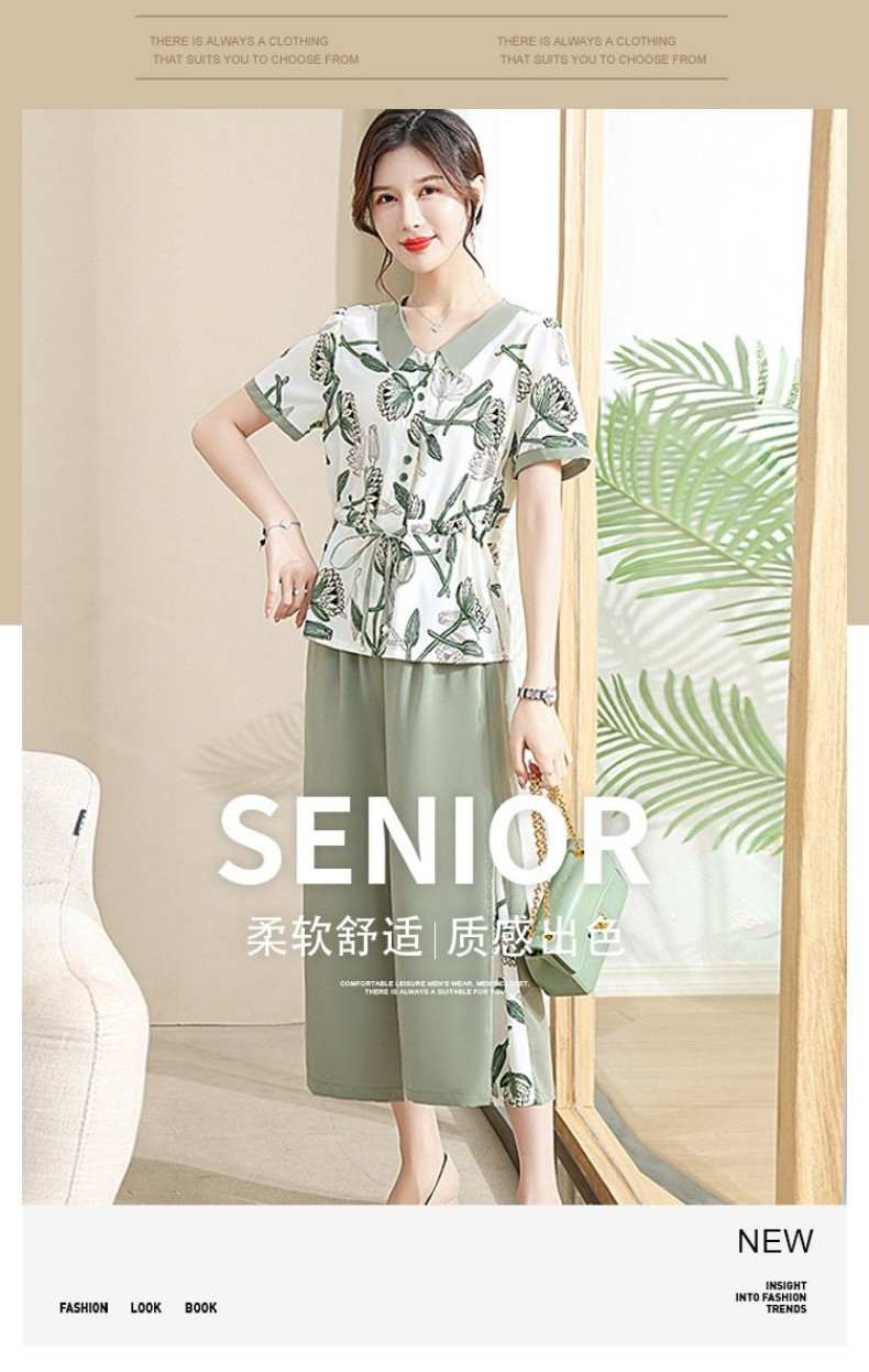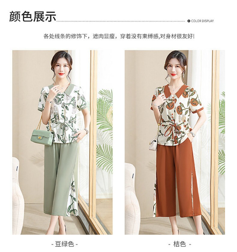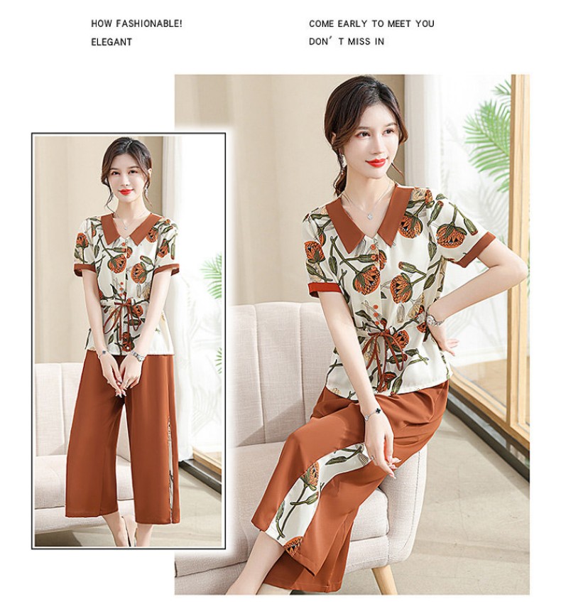 对音夏款舒适透气大码妈妈装V领收腰花卉衫+阔腿裤套装JK-Z2351 商品图2
