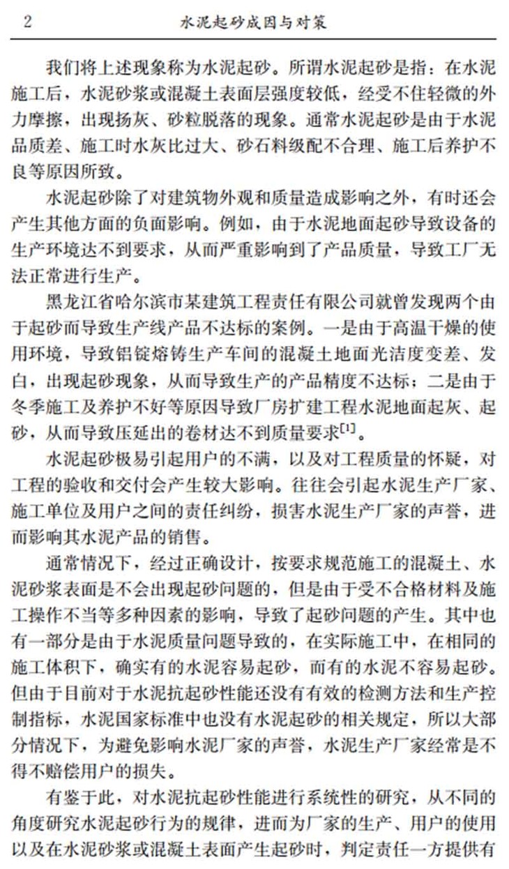 水泥起砂是用户投诉最多的水泥质量问题之一,其成因多种多样。到目前为止,国内外学者对水泥起砂的研究,还主要从实际施工经验出发,对水泥起砂现象进行总结。虽然提出了不少水泥起砂的原因、预防和治理措施,但是这些研究绝大多数都集中在水泥的施工过程中,很少从水泥厂的生产角度,研究如何提高水泥的抗起砂性能。也很少从水泥生产环节和水泥水化微观结构角度进行研究,相关的水泥产品国家标准中也没有检测水泥抗起砂性能的方法及指标要求。为了研究水泥起砂的成因与影响因素,提高水泥的抗起砂性能,避免水泥混凝土产生起砂现象,必须要有一套可以定量的水泥抗起砂性能检验方法,并在此基础上进一步研究水泥起砂的影响因素,以达到消除或减轻发生水泥起砂现象的目的。