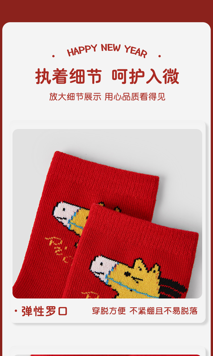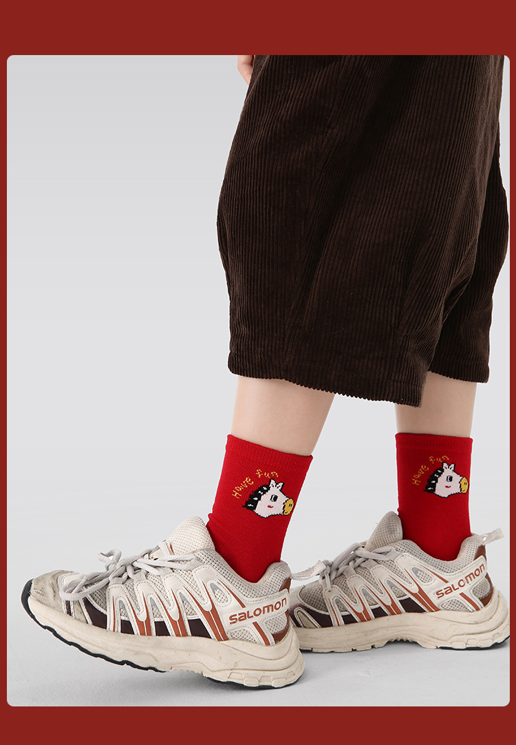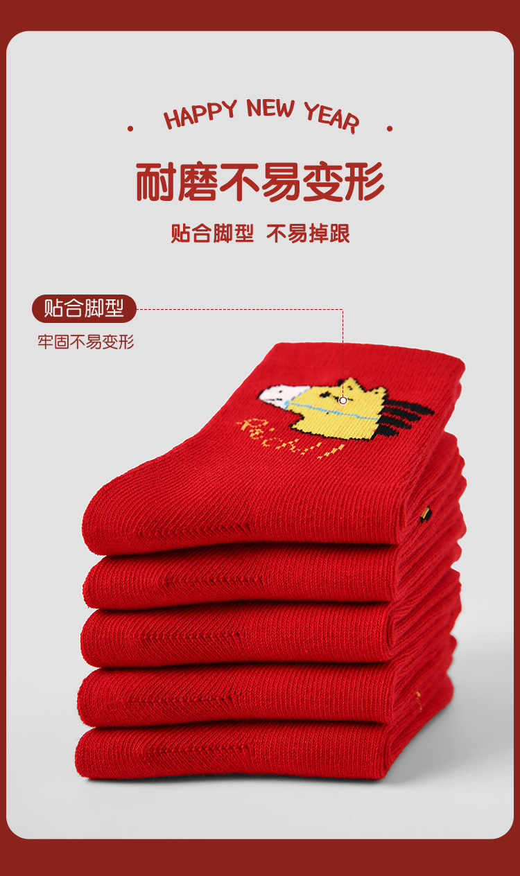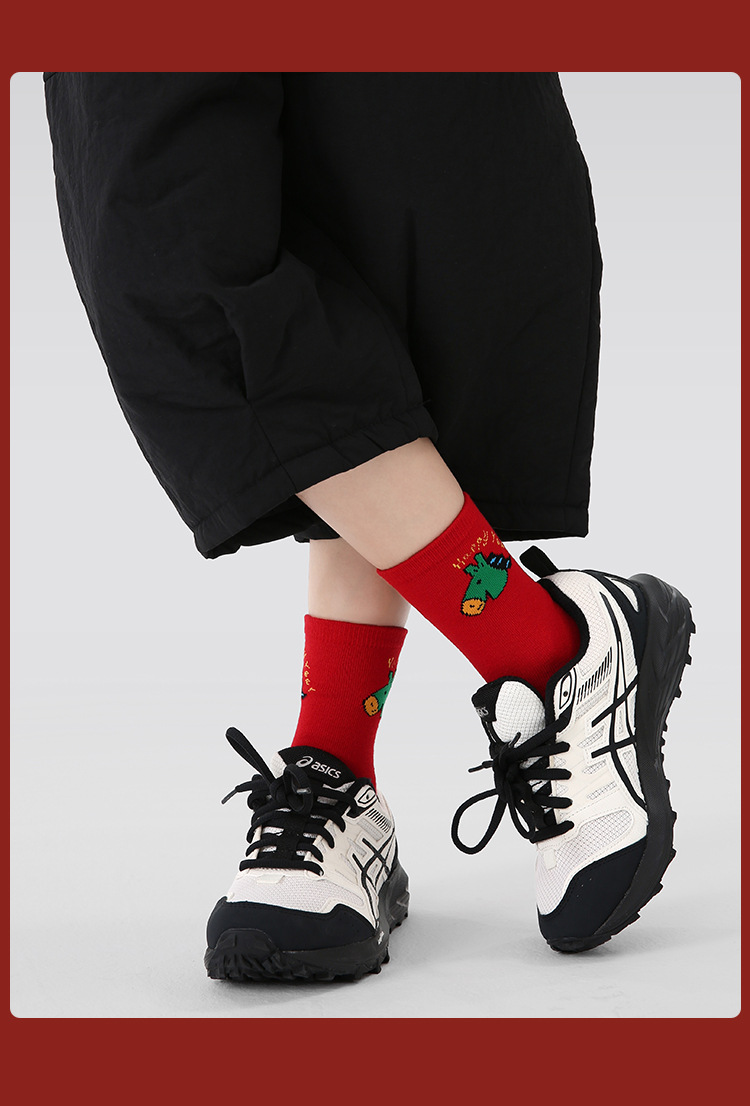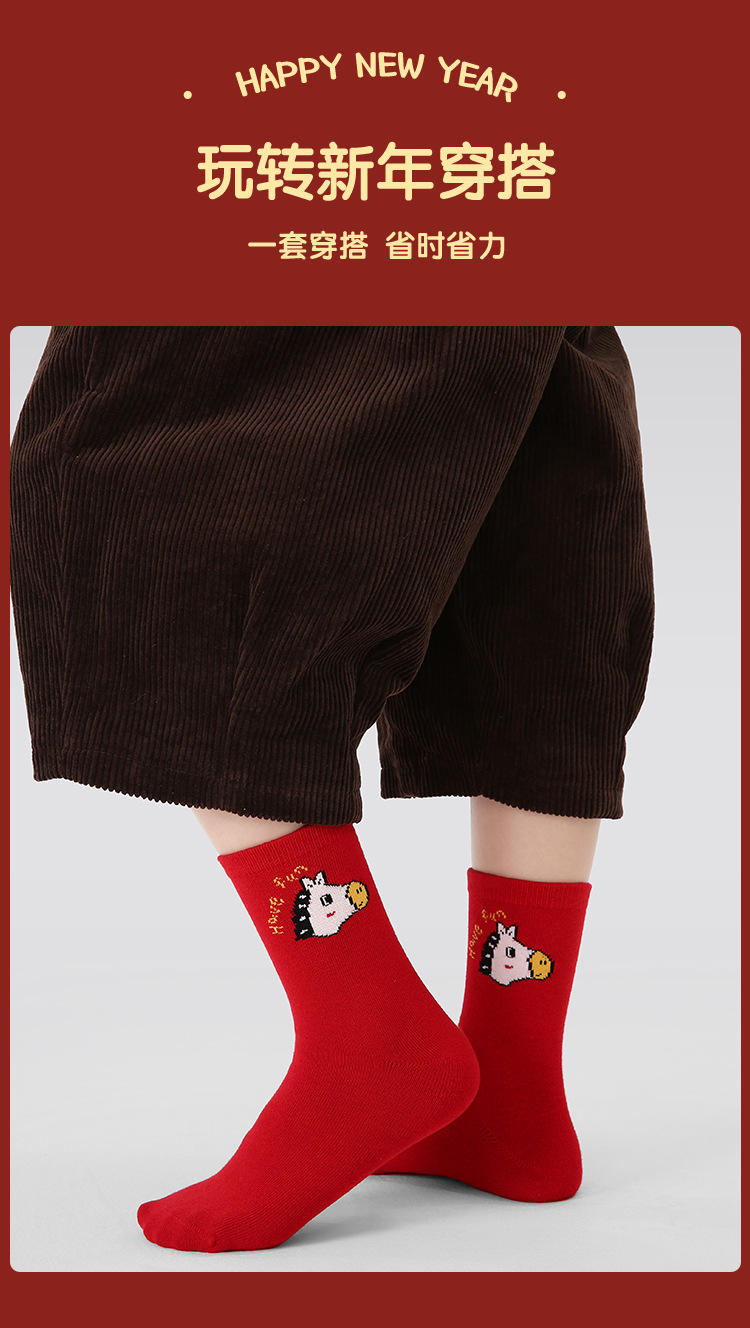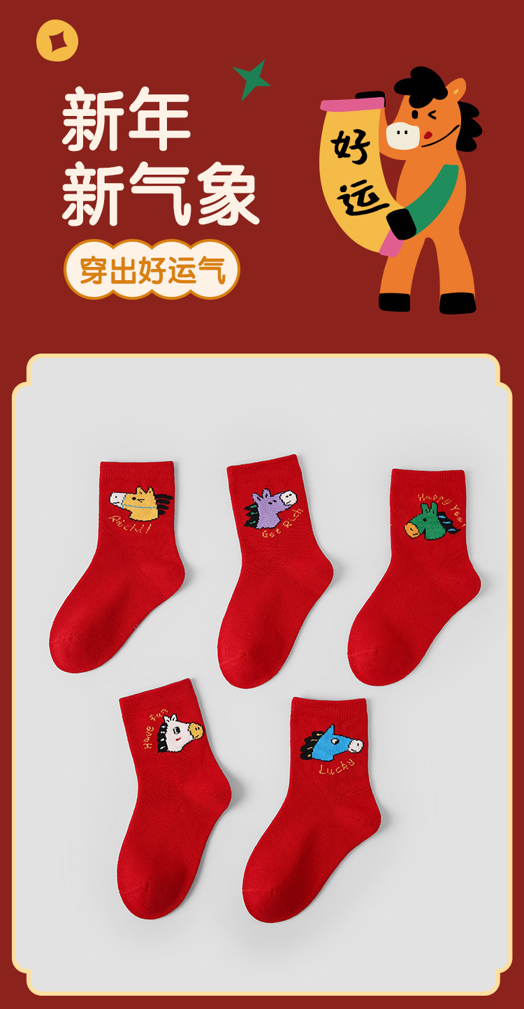 5双装!2026马年大红色幸运加马儿童袜 新年袜无骨卡通棉袜子中筒袜