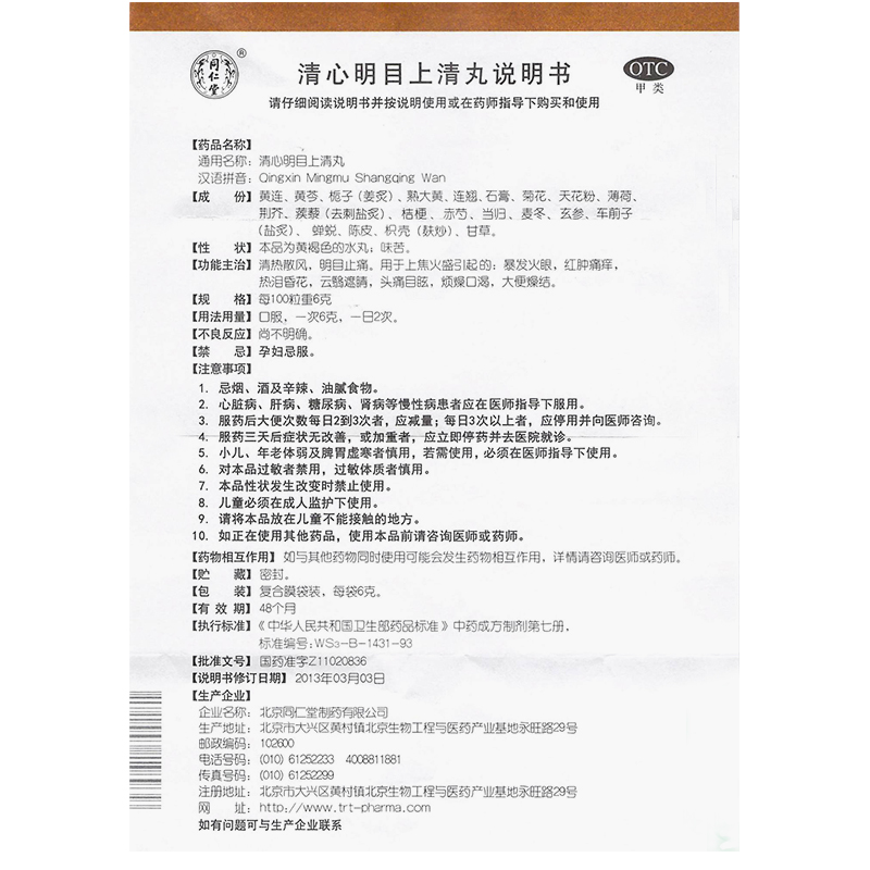 同仁堂清心明目上清丸12袋/盒眼睛红肿暴发火眼头痛目眩明目止痛