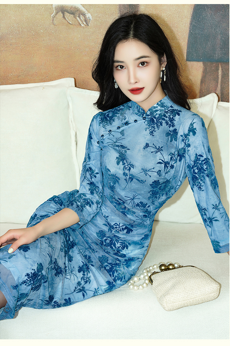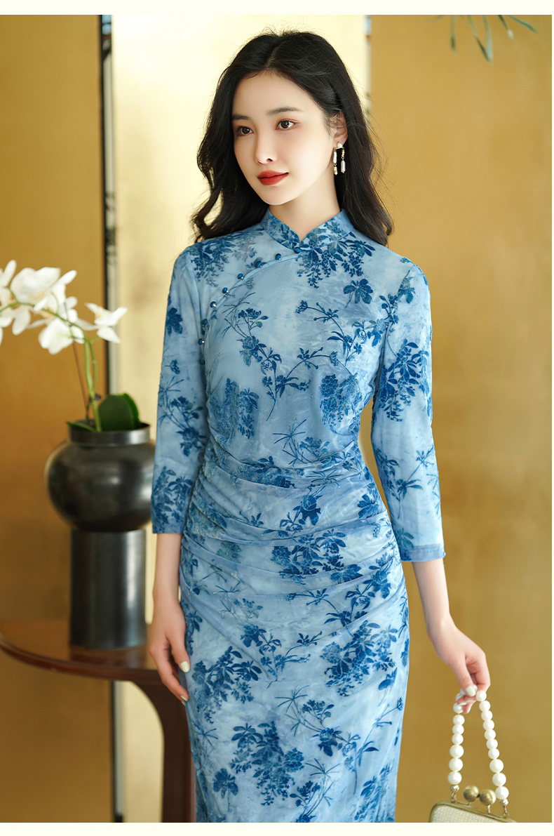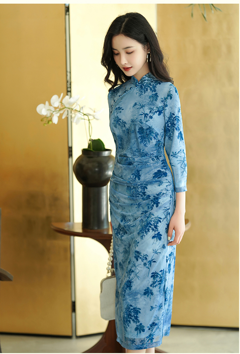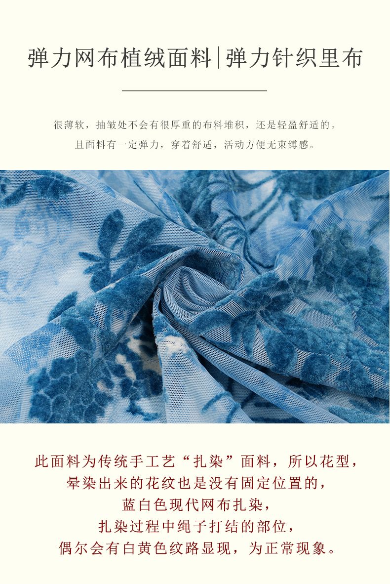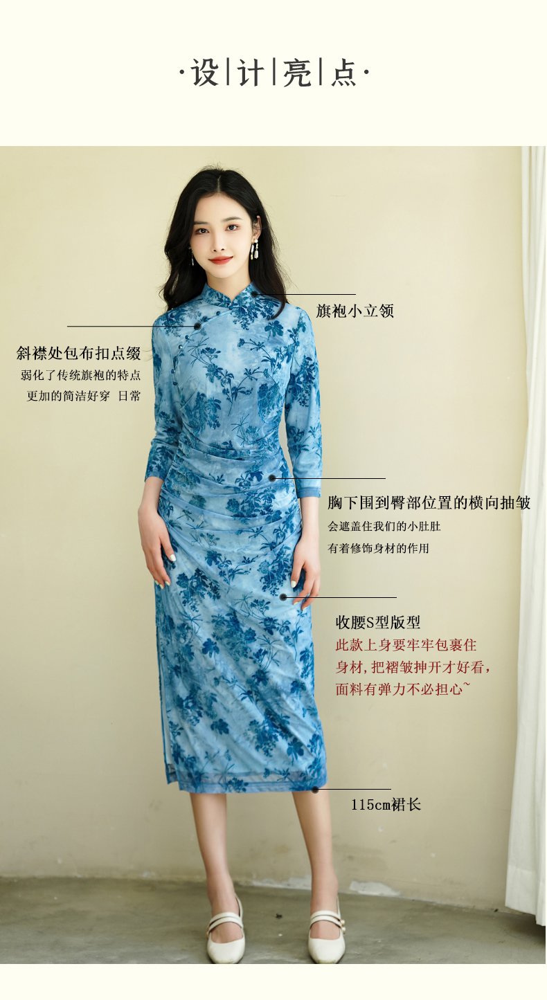 逸红颜卿柚2025年春季新款弹力网布植绒旗袍改良版连衣裙女中长款