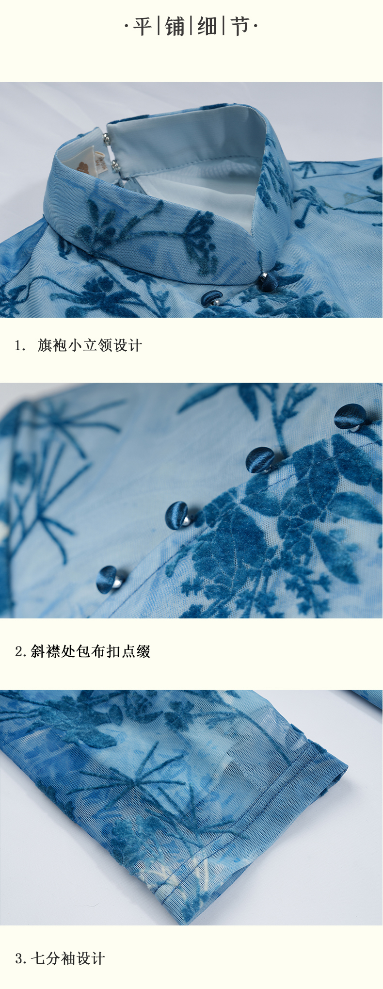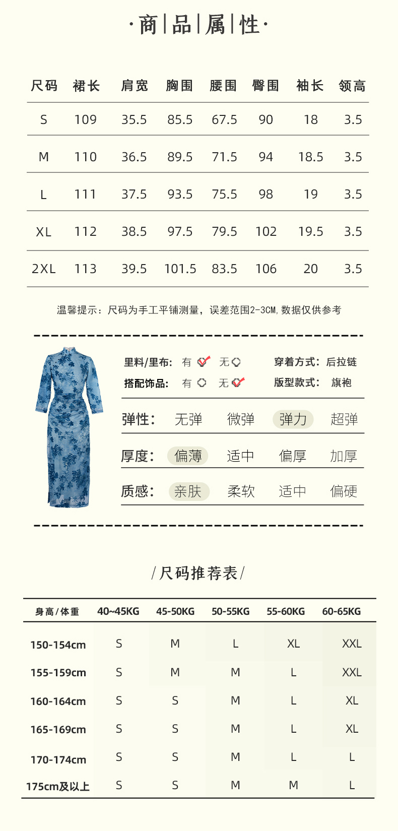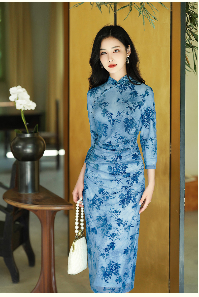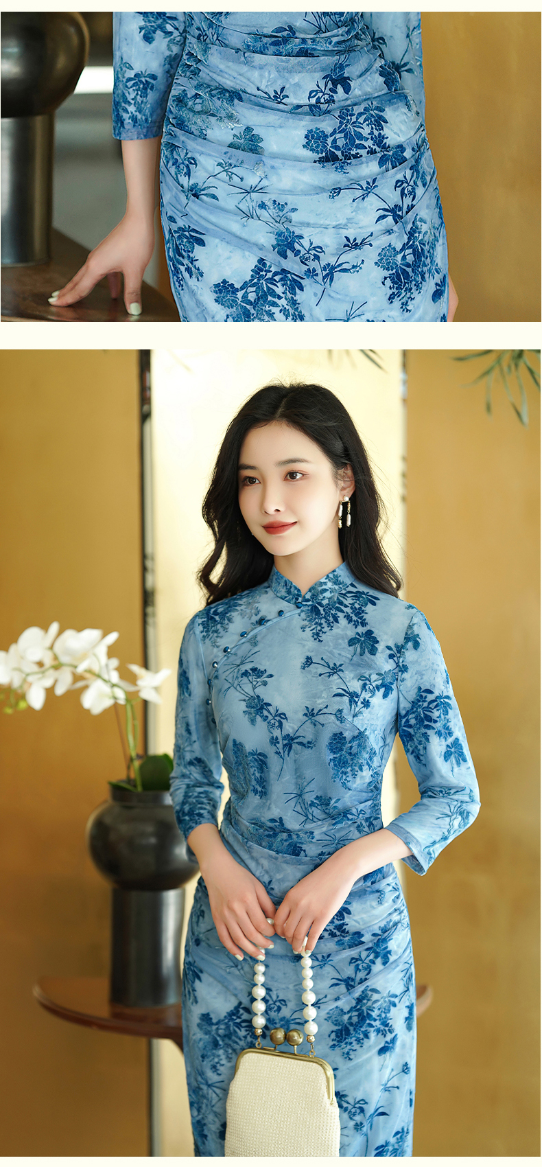 逸红颜卿柚2025年春季新款弹力网布植绒旗袍改良版连衣裙女中长款
