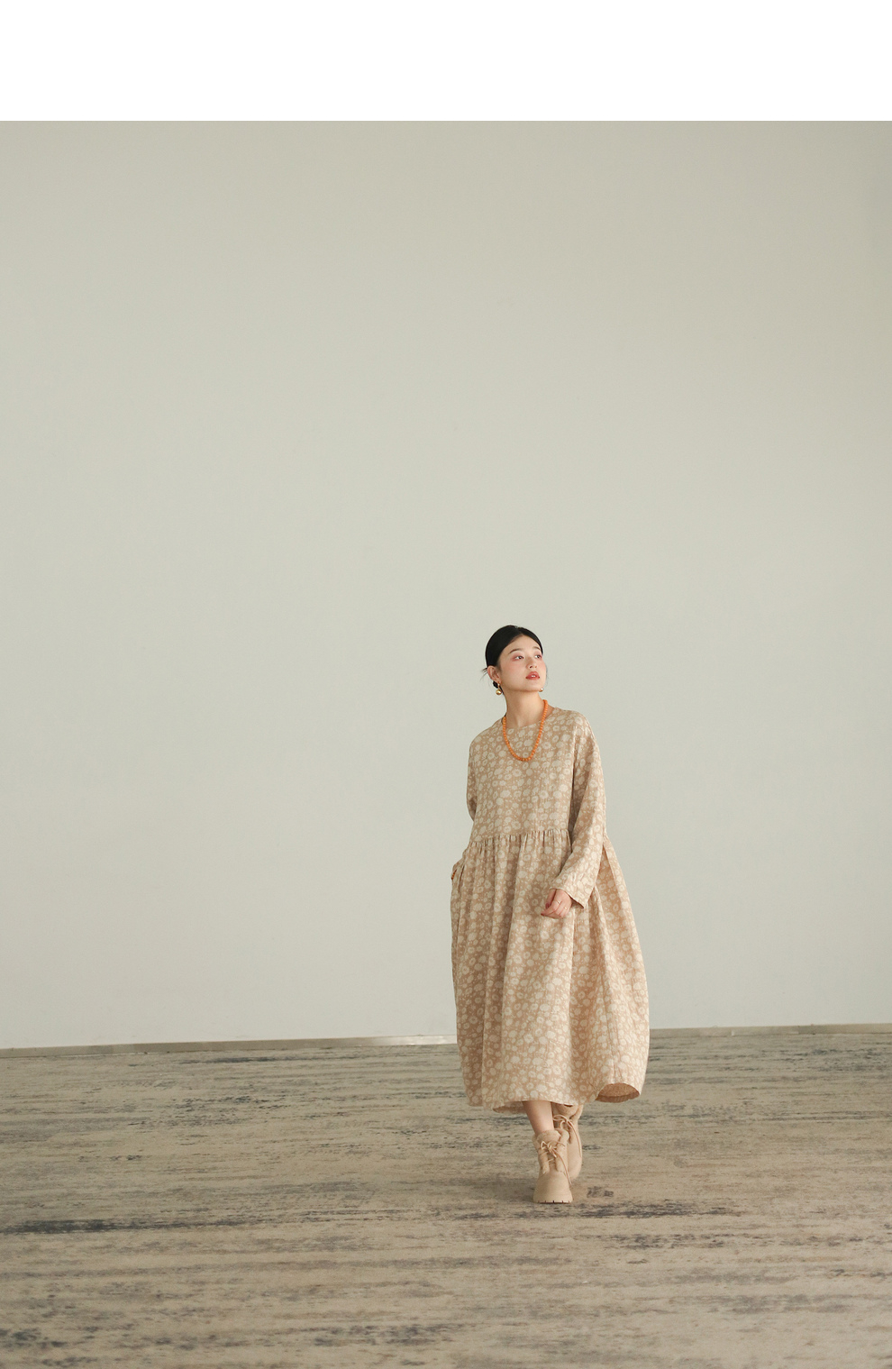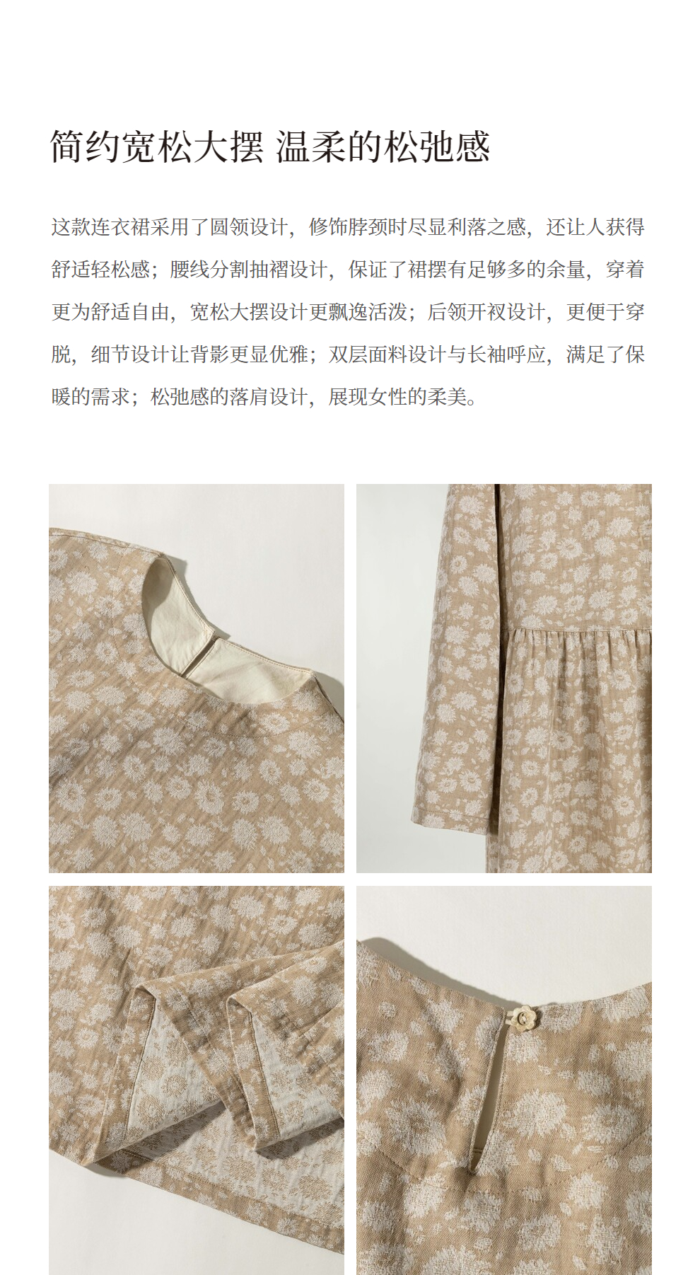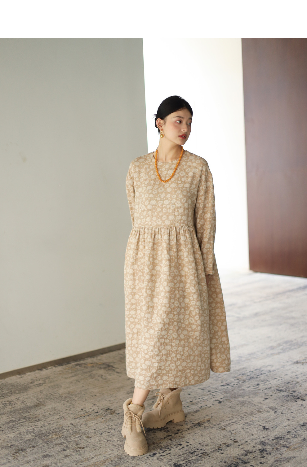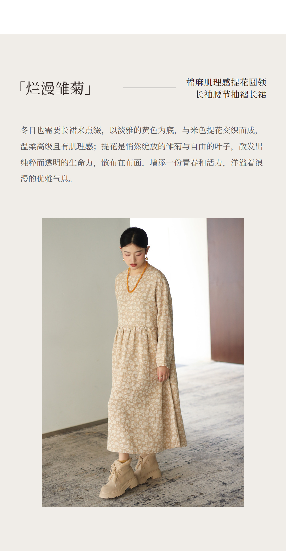 绽放027朵/米黄色雏菊叶子提花浪漫老钱风宽松长袖文艺棉麻连衣裙