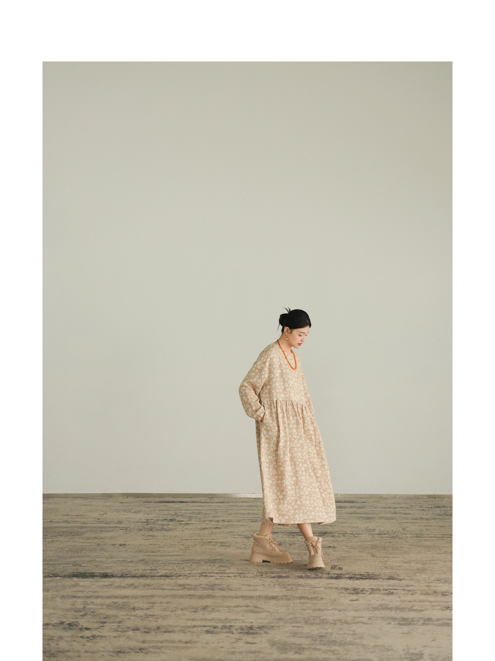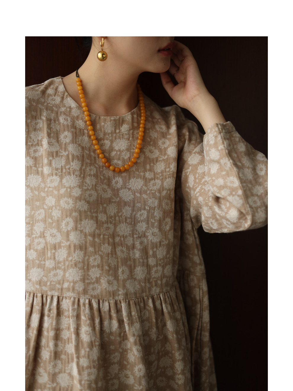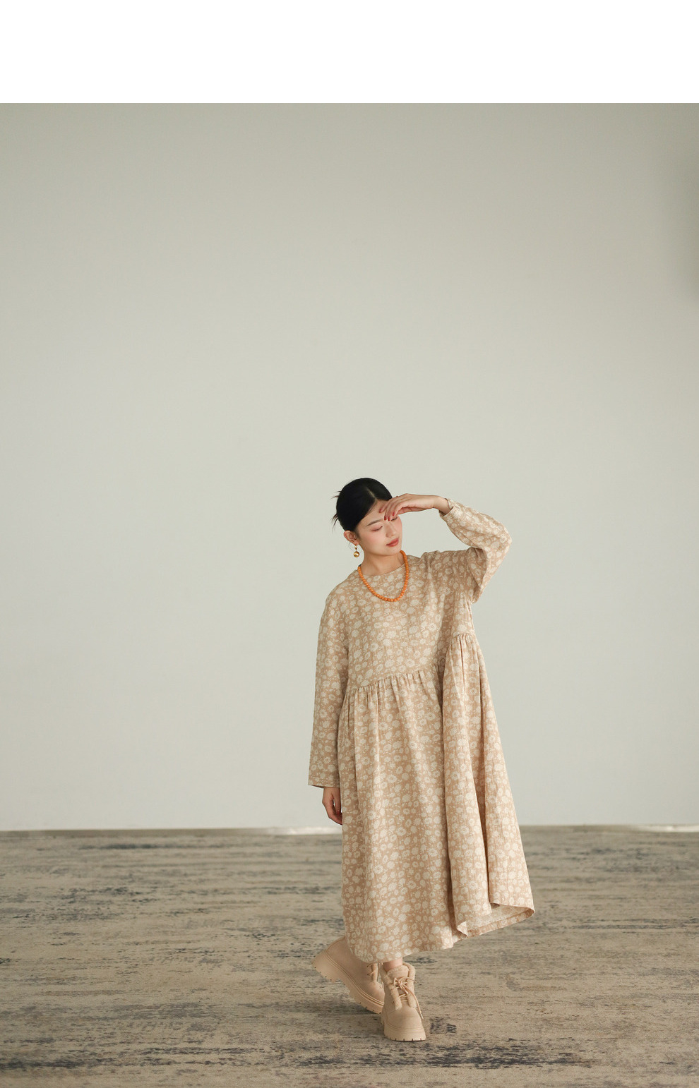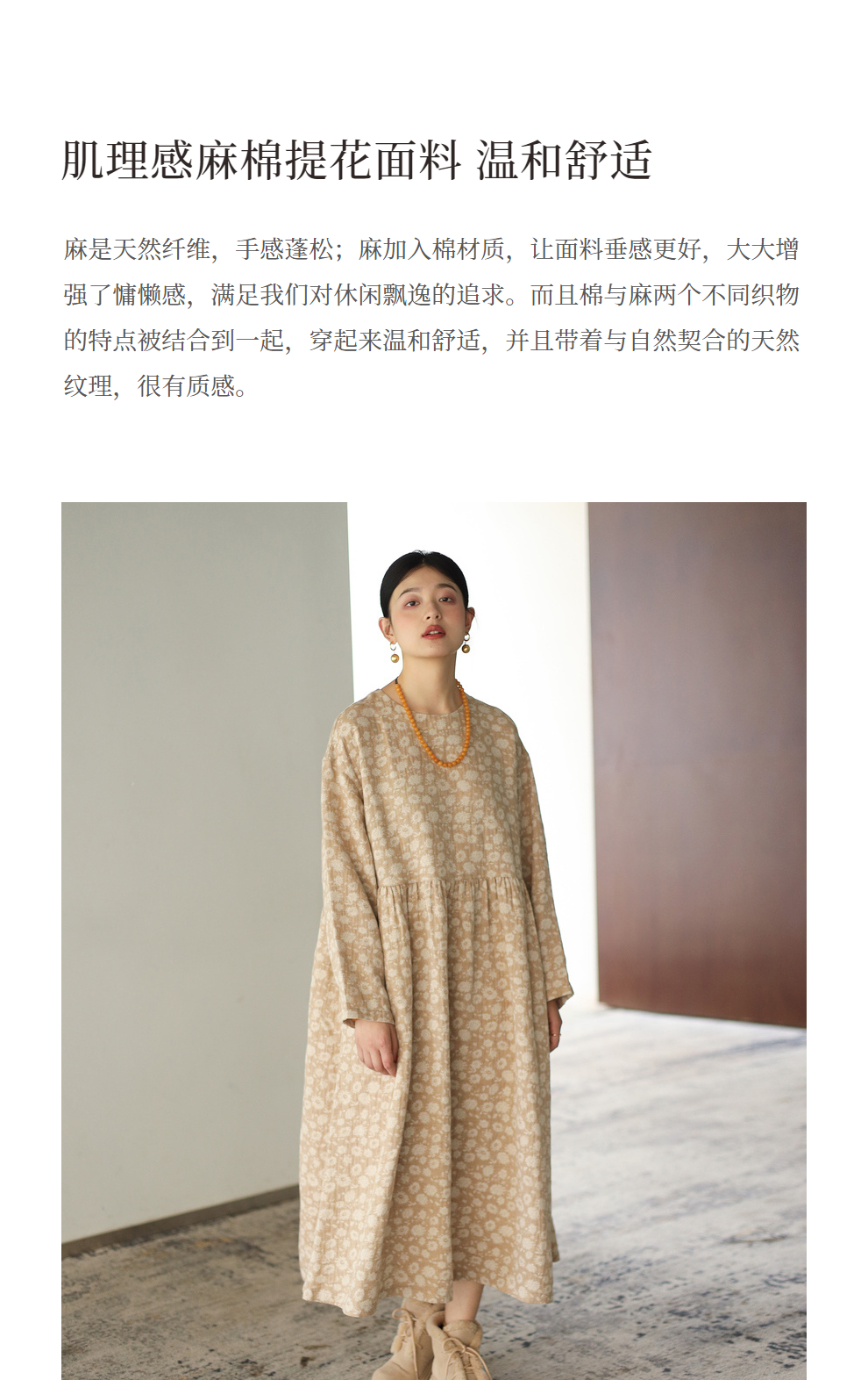 绽放027朵/米黄色雏菊叶子提花浪漫老钱风宽松长袖文艺棉麻连衣裙