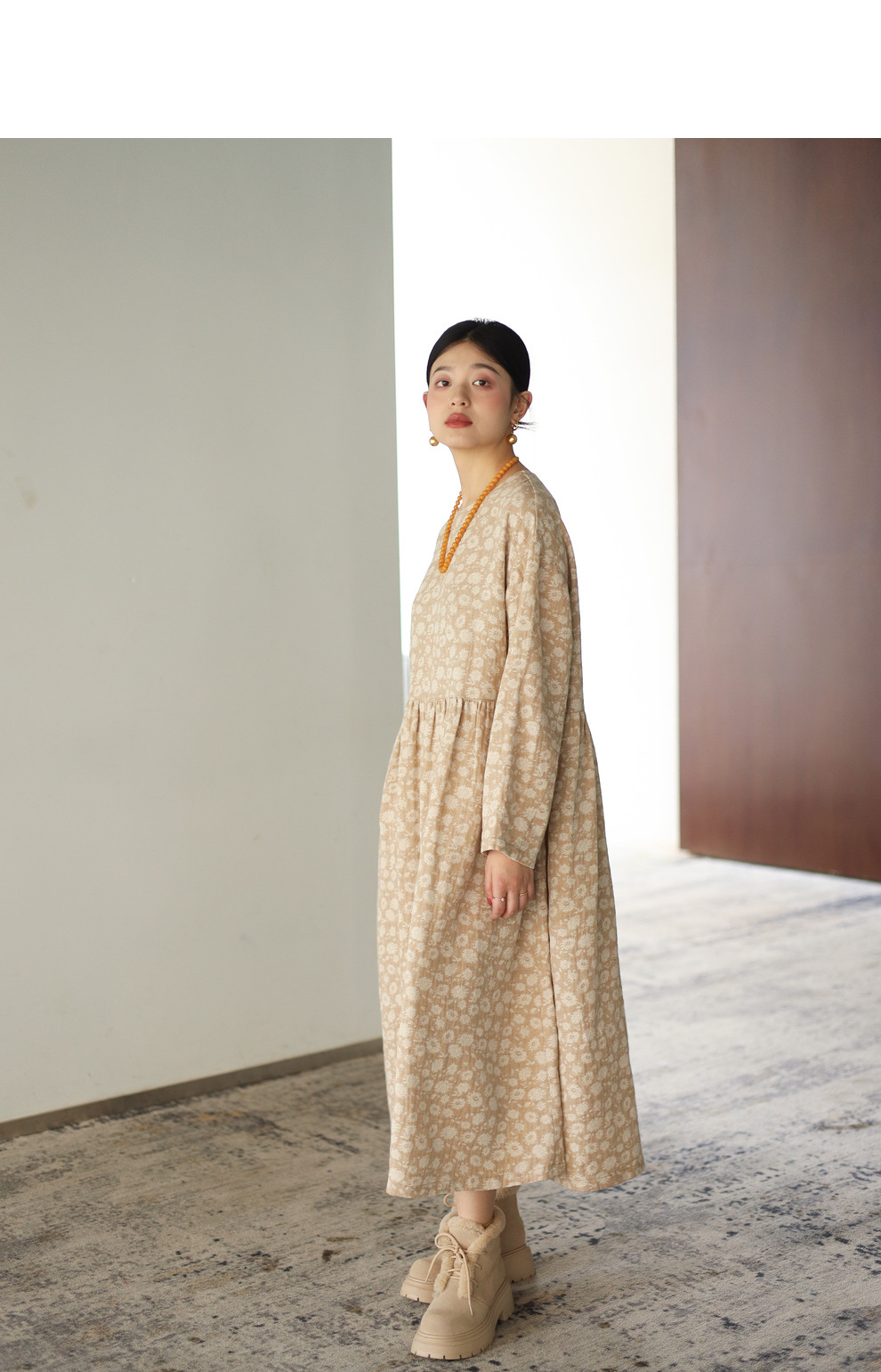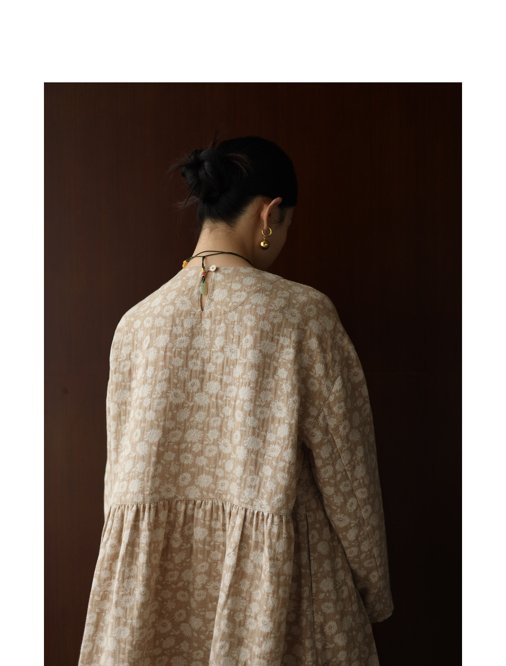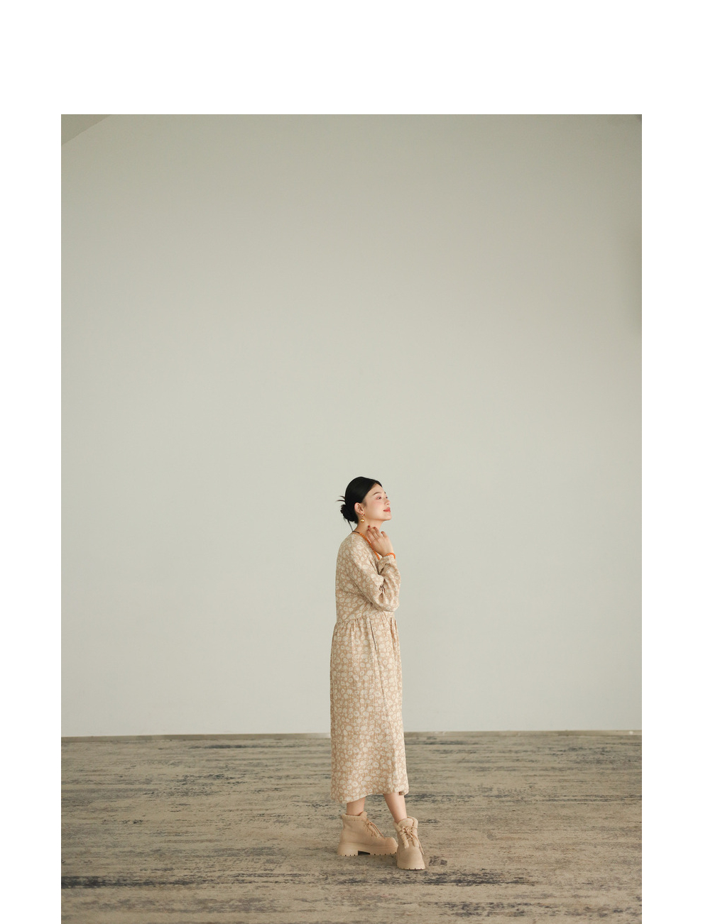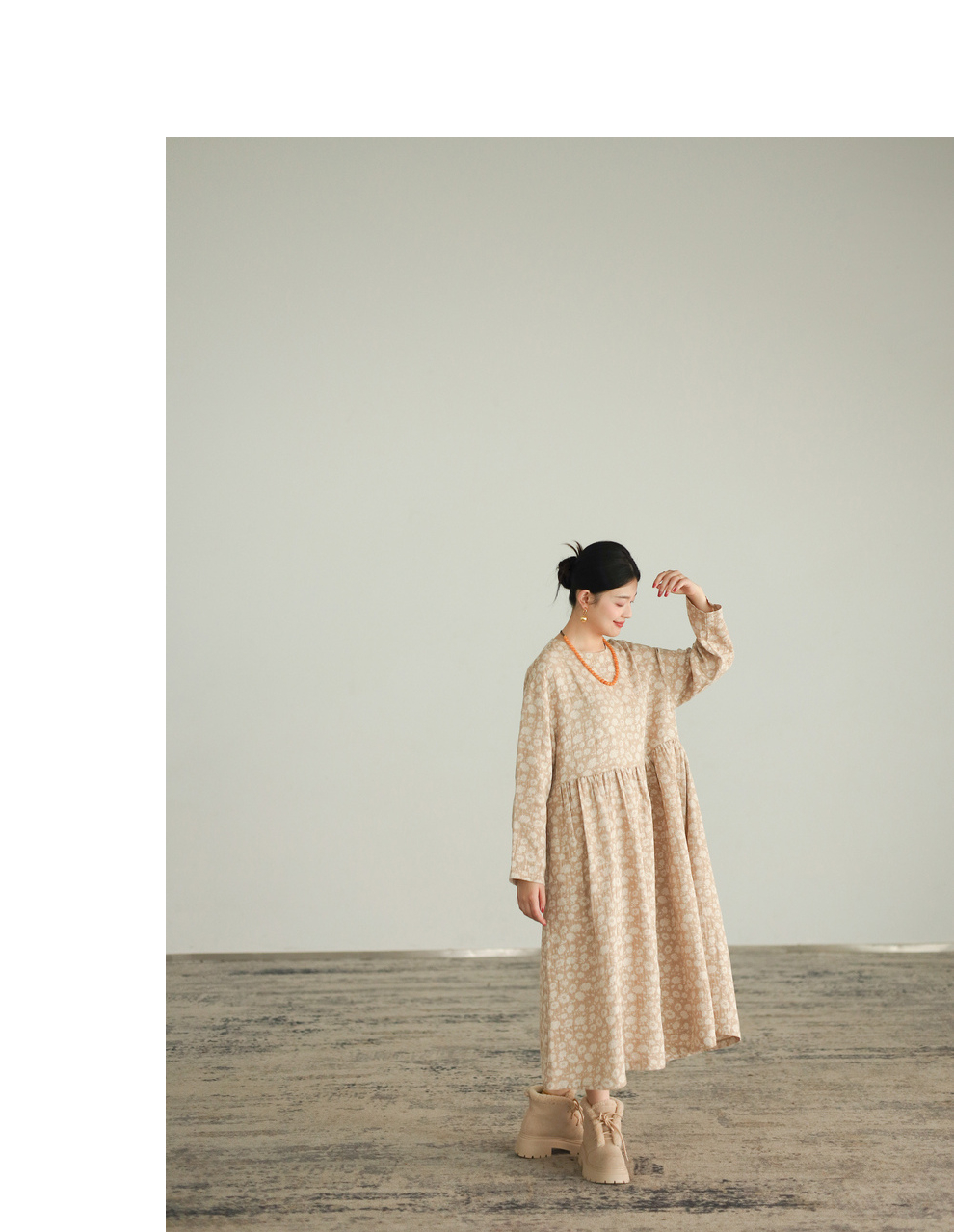 绽放027朵/米黄色雏菊叶子提花浪漫老钱风宽松长袖文艺棉麻连衣裙