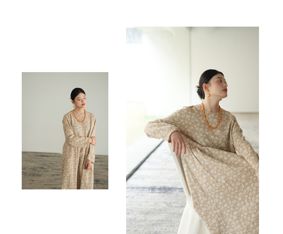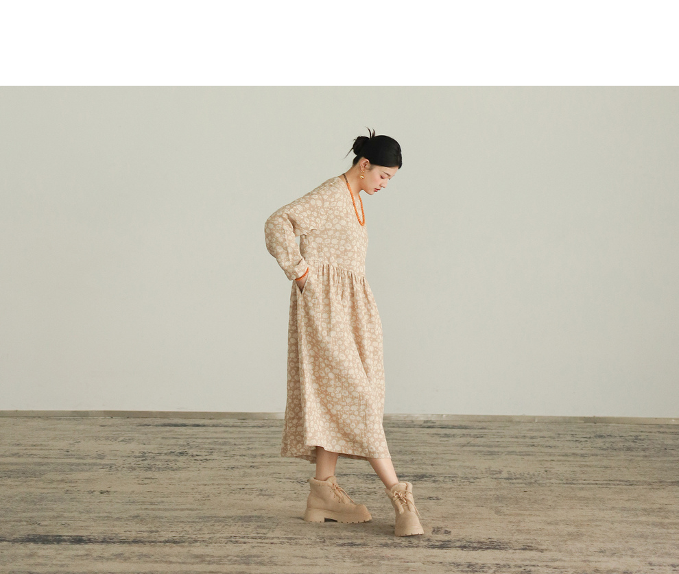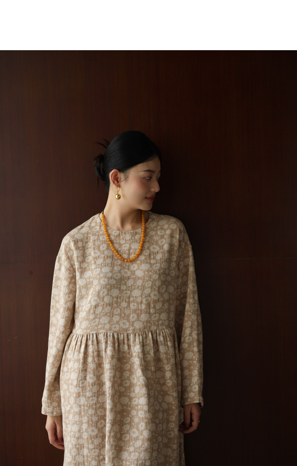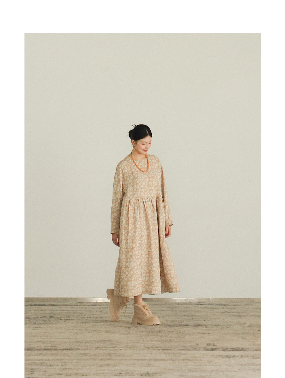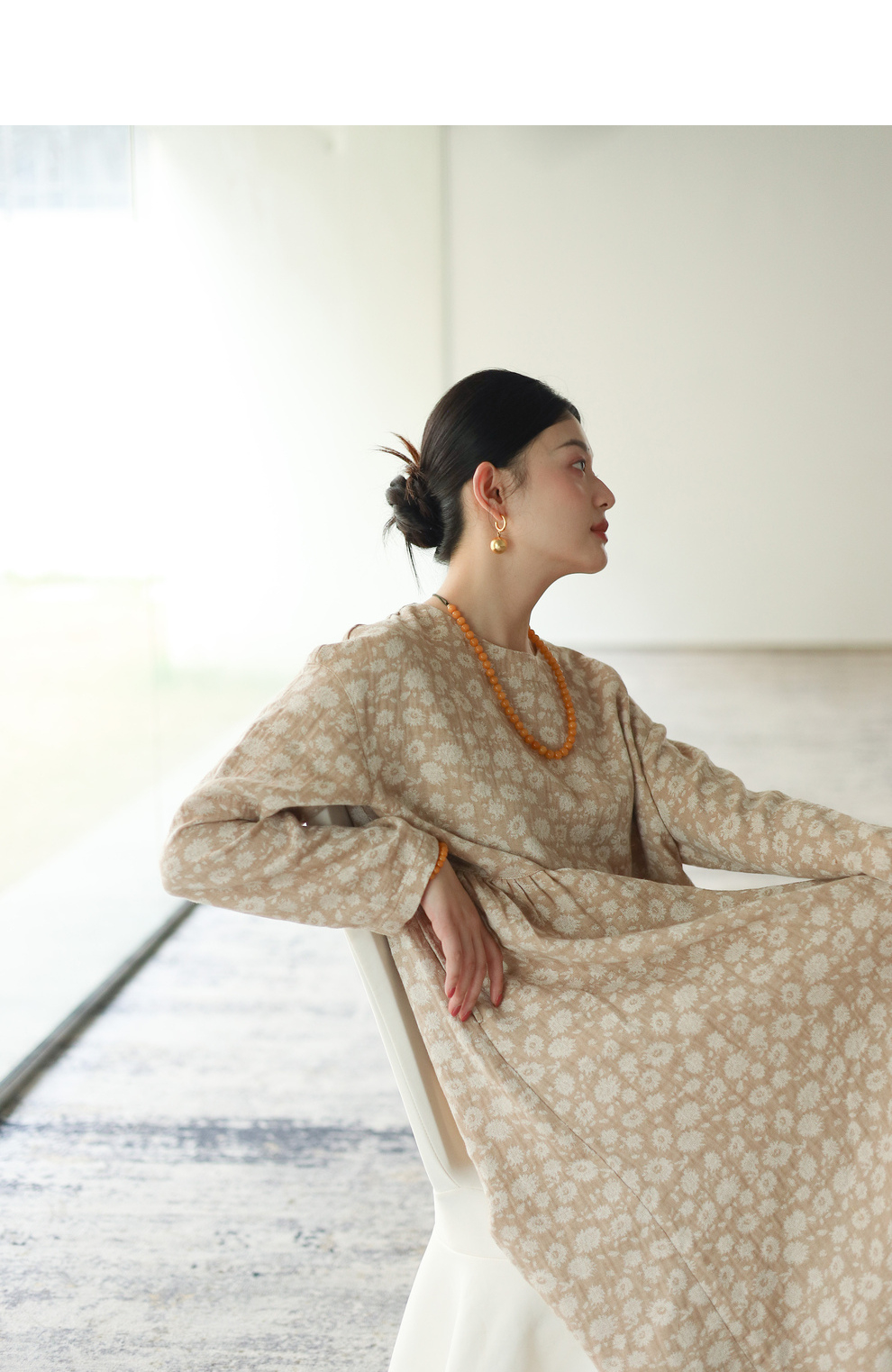 绽放027朵/米黄色雏菊叶子提花浪漫老钱风宽松长袖文艺棉麻连衣裙