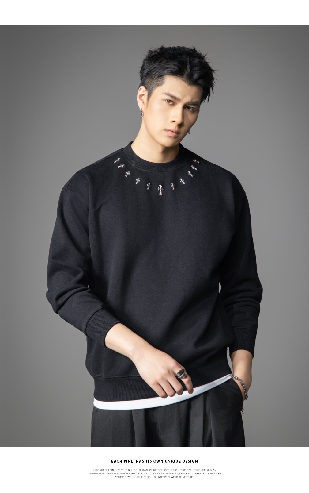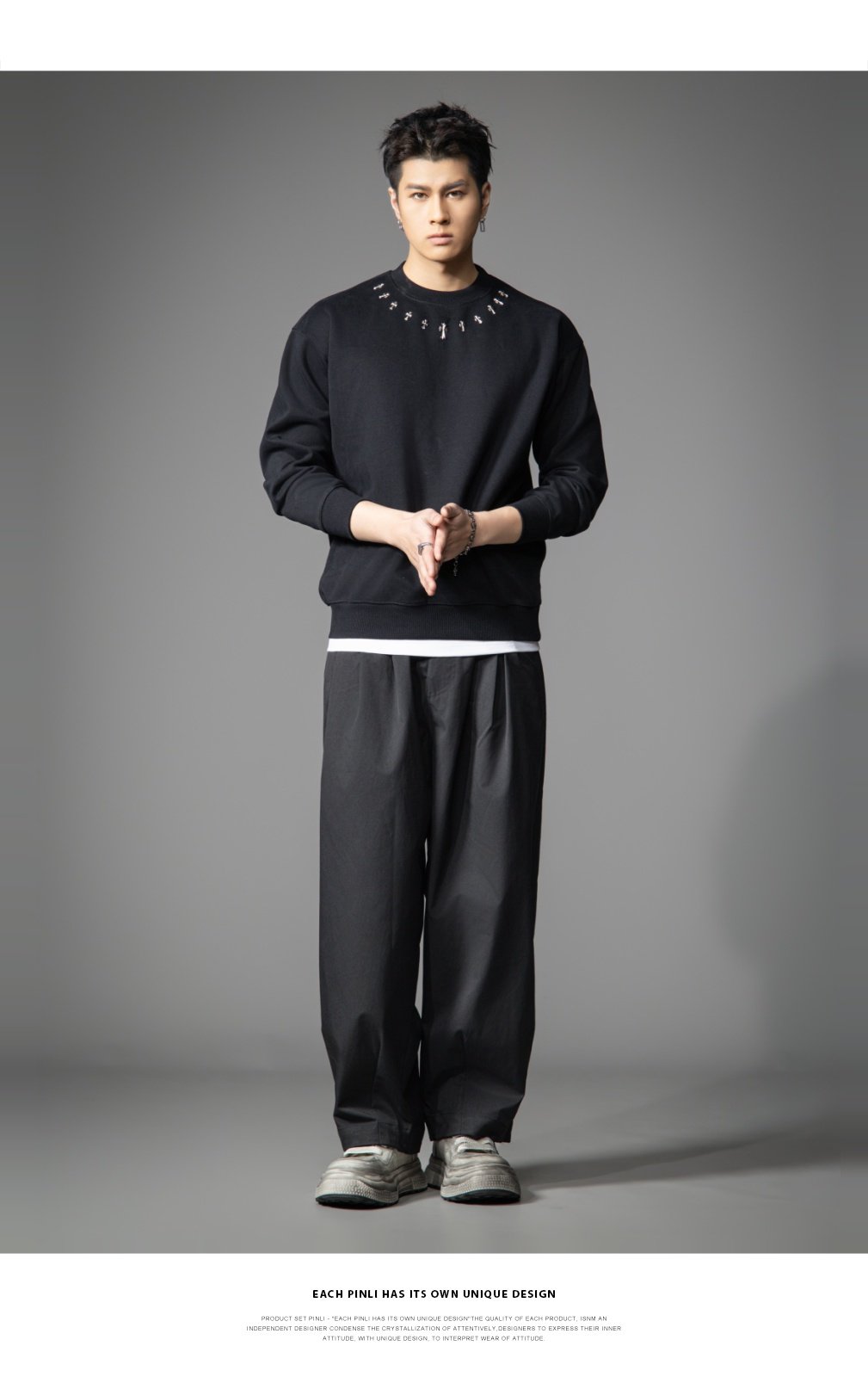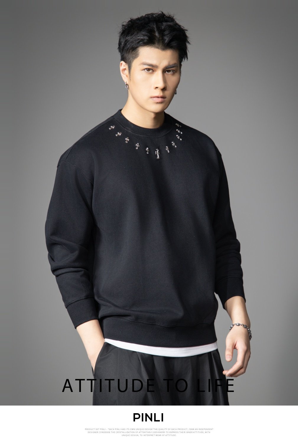 PINLI品立2026春季新款男士潮牌金属烫钻圆领落肩袖套头卫衣上衣BG262109002