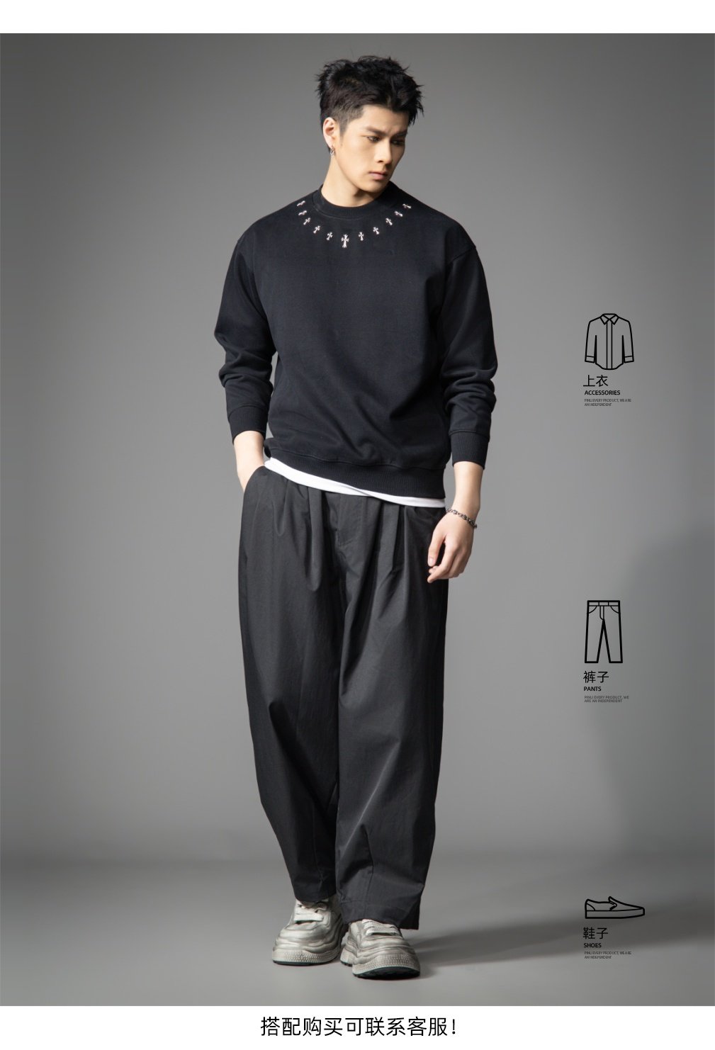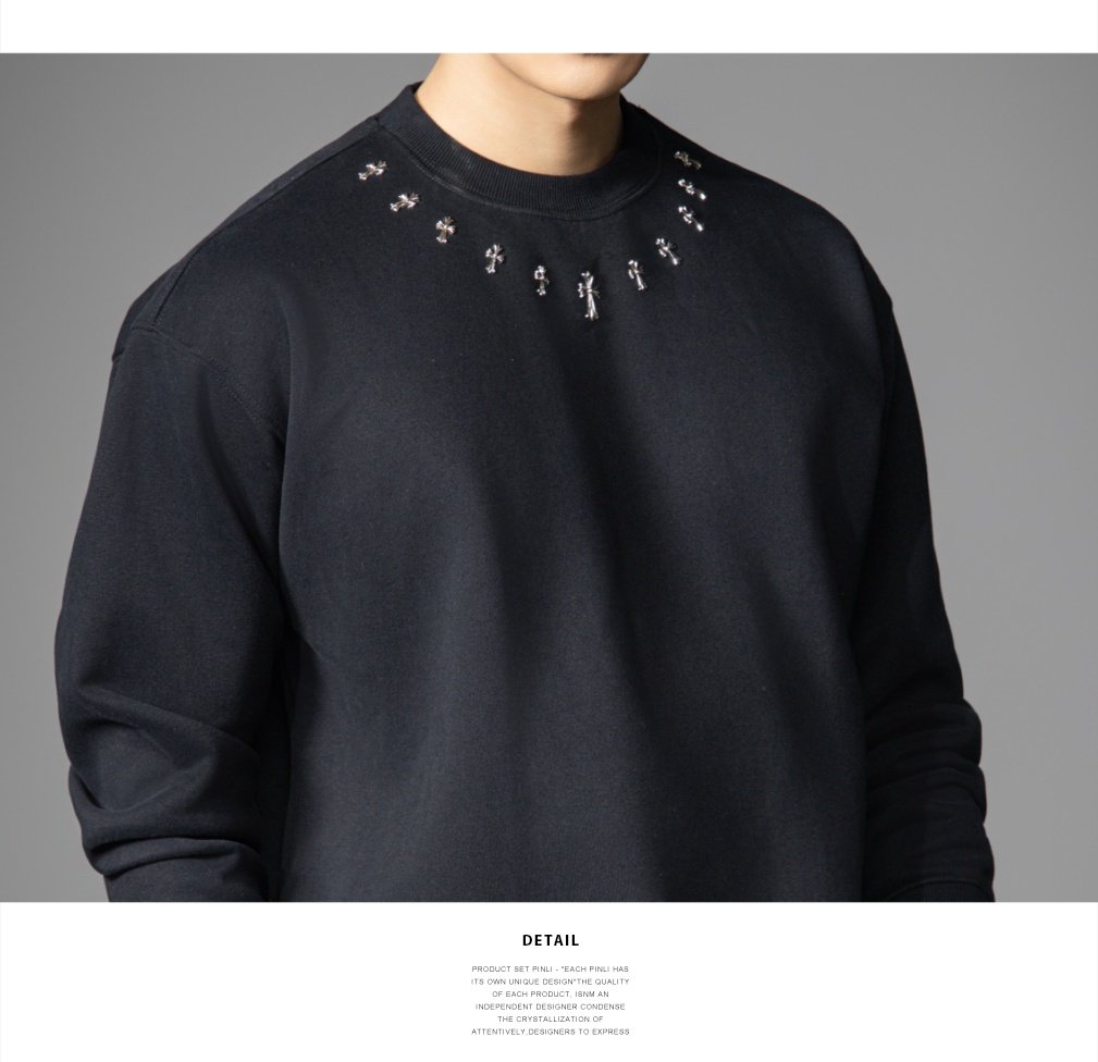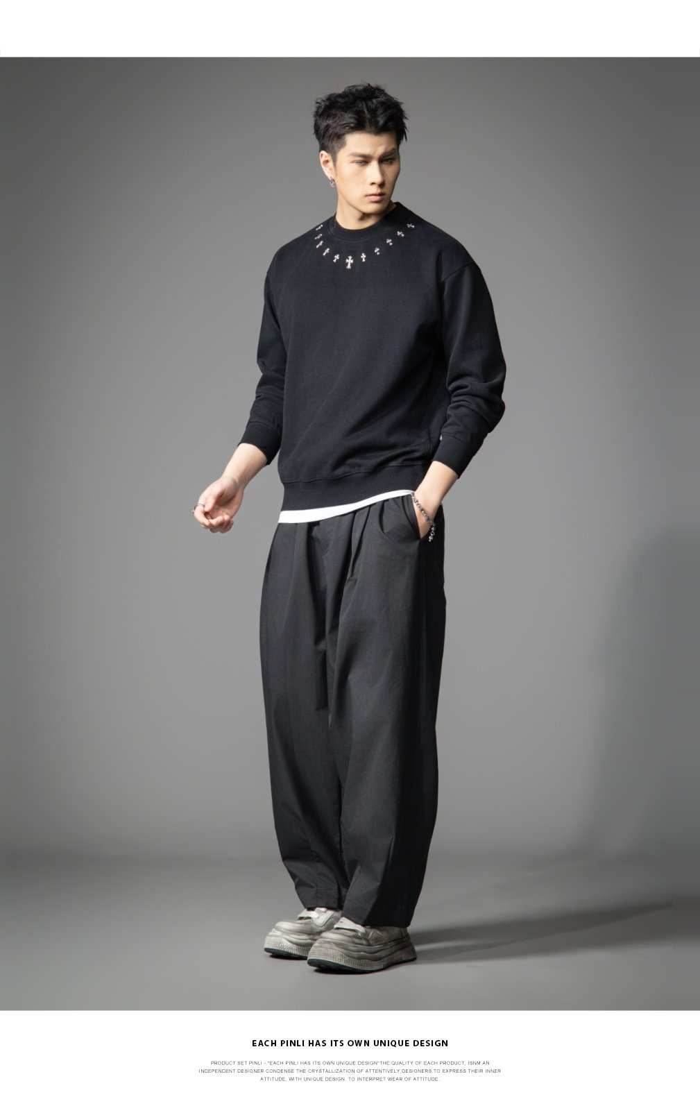 PINLI品立2026春季新款男士潮牌金属烫钻圆领落肩袖套头卫衣上衣BG262109002