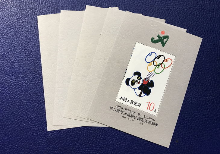 “第十一届亚洲运动会国际体育集邮展览”小型张,是为该次邮展募资而发行的,共1枚。小型张邮票主图是亚运会吉祥物熊猫盼盼,俗称“盼盼”张 ,面值10元,当年特供集邮协会会员集藏。