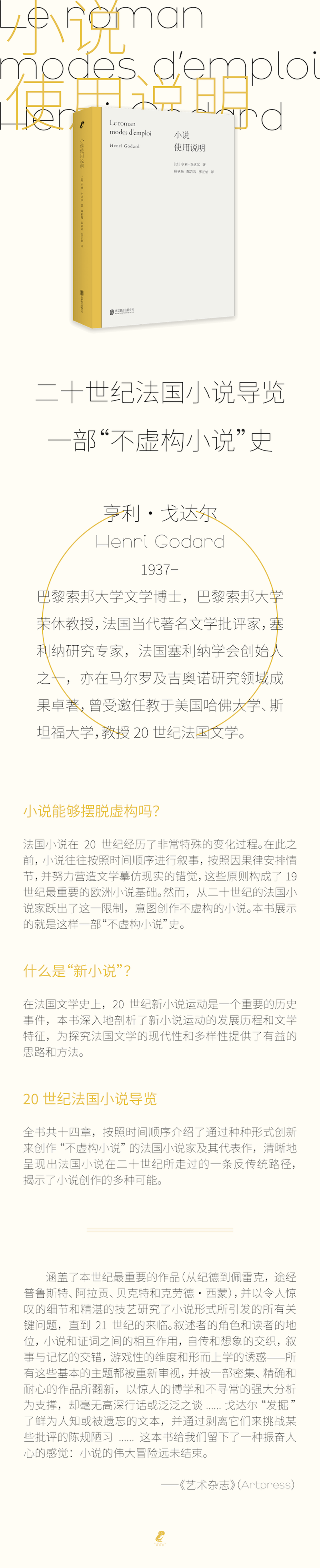 作者亨利戈达尔(Henri Godard,1937 ),巴黎索邦大学文学博士,巴黎索邦大学荣休教授,法国当代著名文学批评家,塞利纳研究专家,法国塞利纳学会创始人之一,亦在马尔罗及吉奥诺研究领域成果卓著,曾受邀任教于美国哈佛大学、斯坦福大学,教授20世纪法国文学。