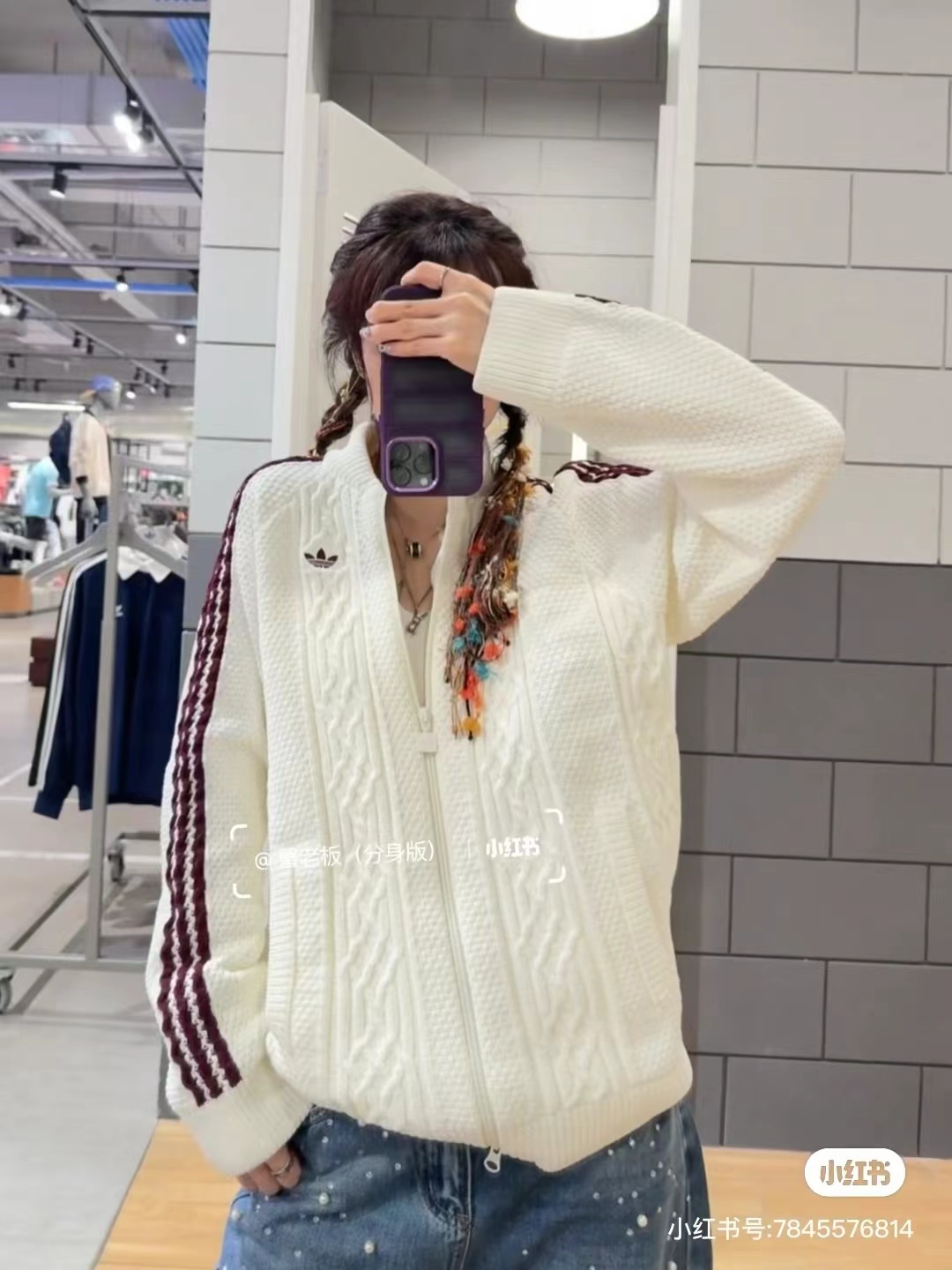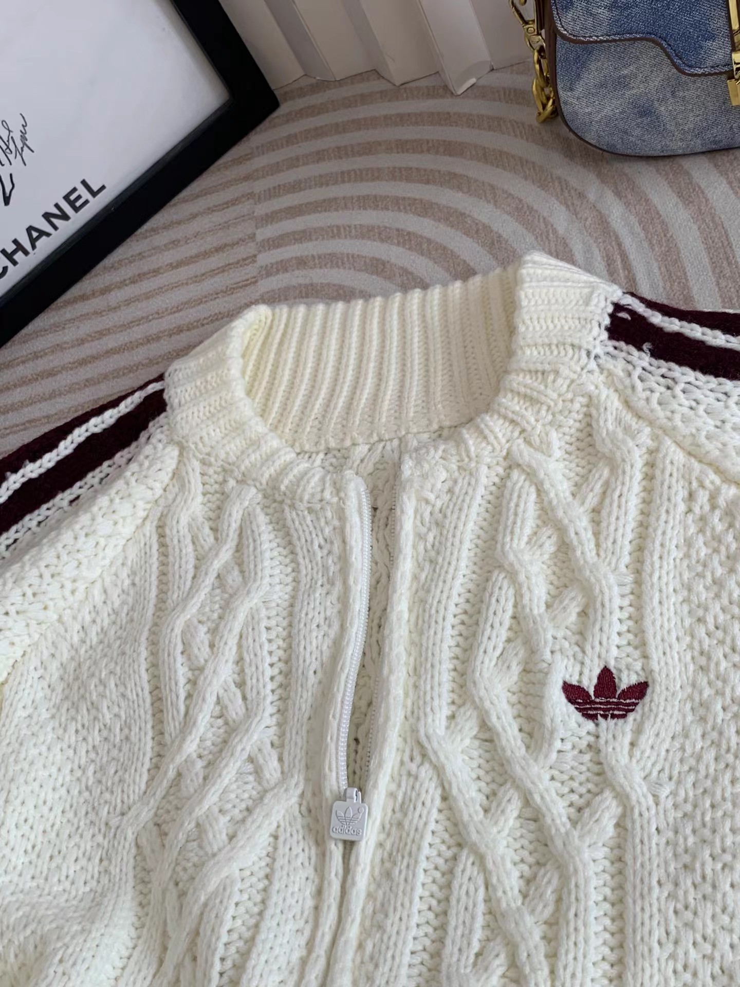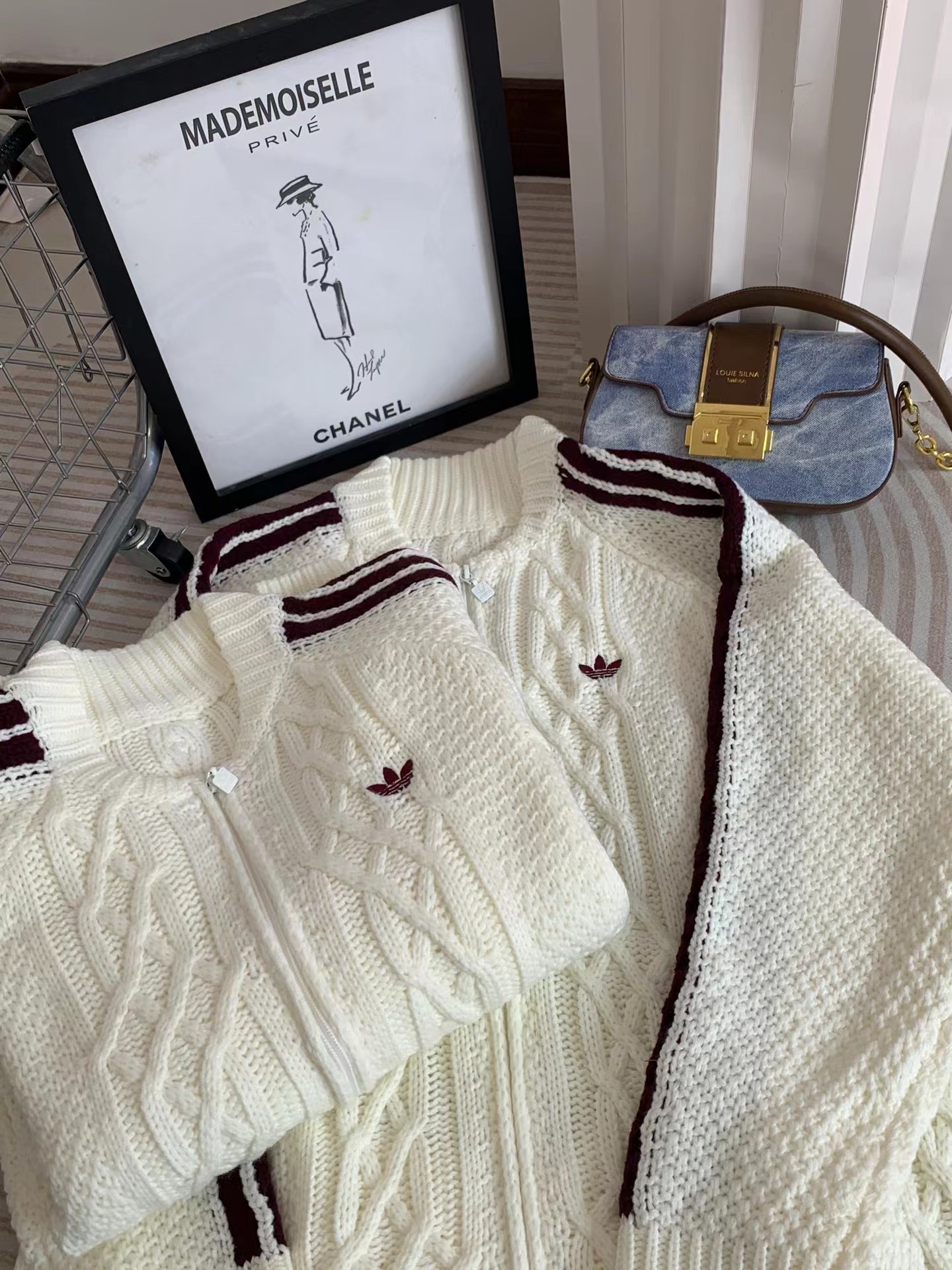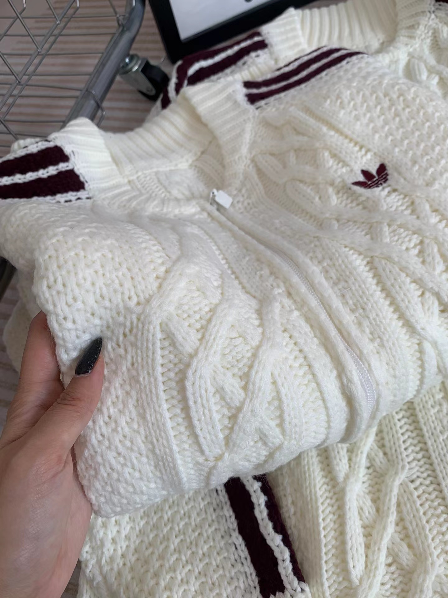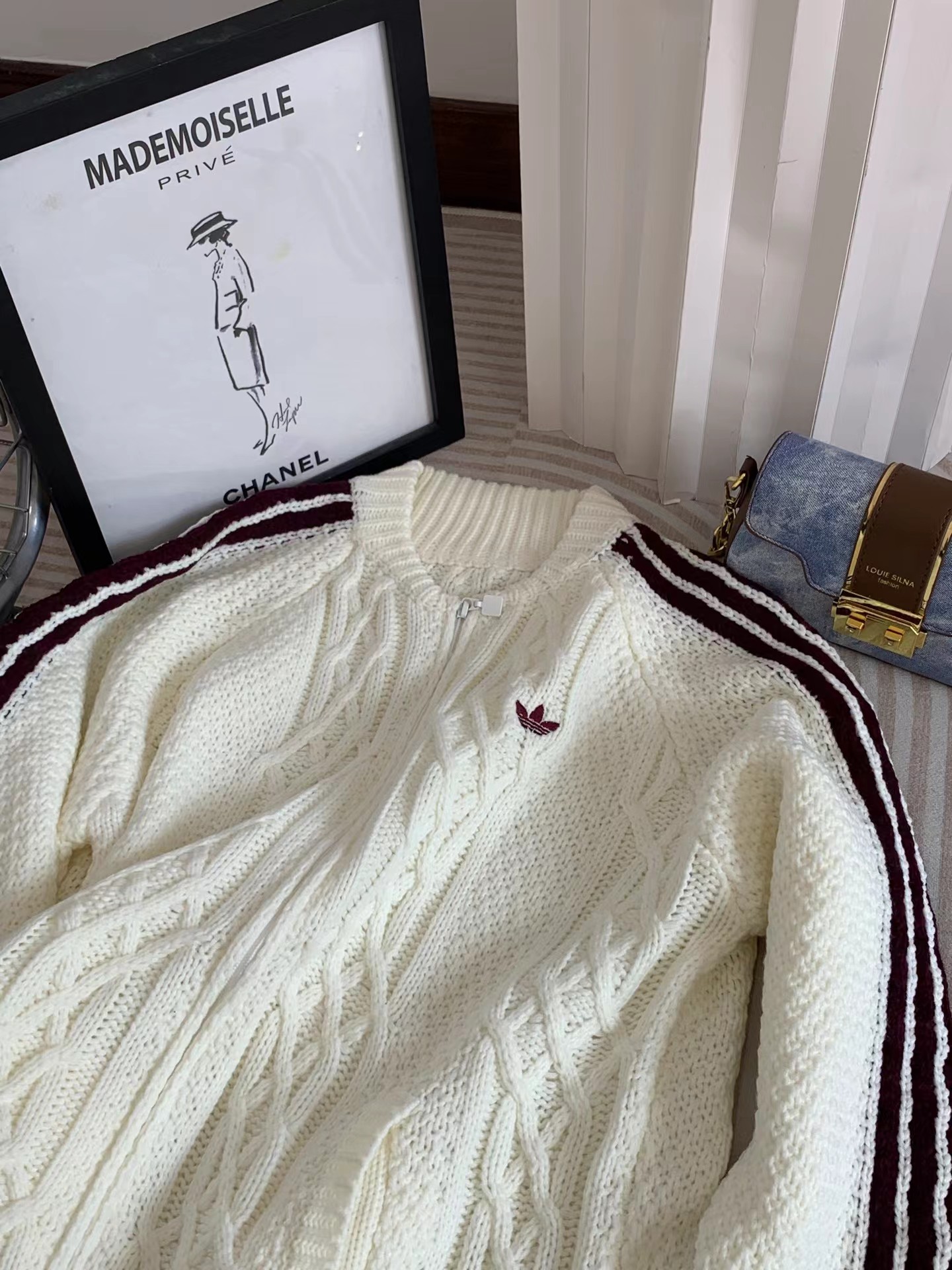 复古粗针绞花针织拉链开衫,奶乎乎的颜色,看着就软软糯糯的,酒红色的三条纹复古韵味加满~米白色麻花针织??面料,复古感的绞花工艺太有质感啦!胸口的三叶草小标低调又有辨识度~宽松版型藏肉又显随性,像把温柔滤镜穿在身上,不管是想走复古风,松弛风还是运动风,这件外套都可以轻松拿捏,定制logo拉链,把品质都藏进细节里。这个颜色真的美式学院风~没有谁能拒绝他!