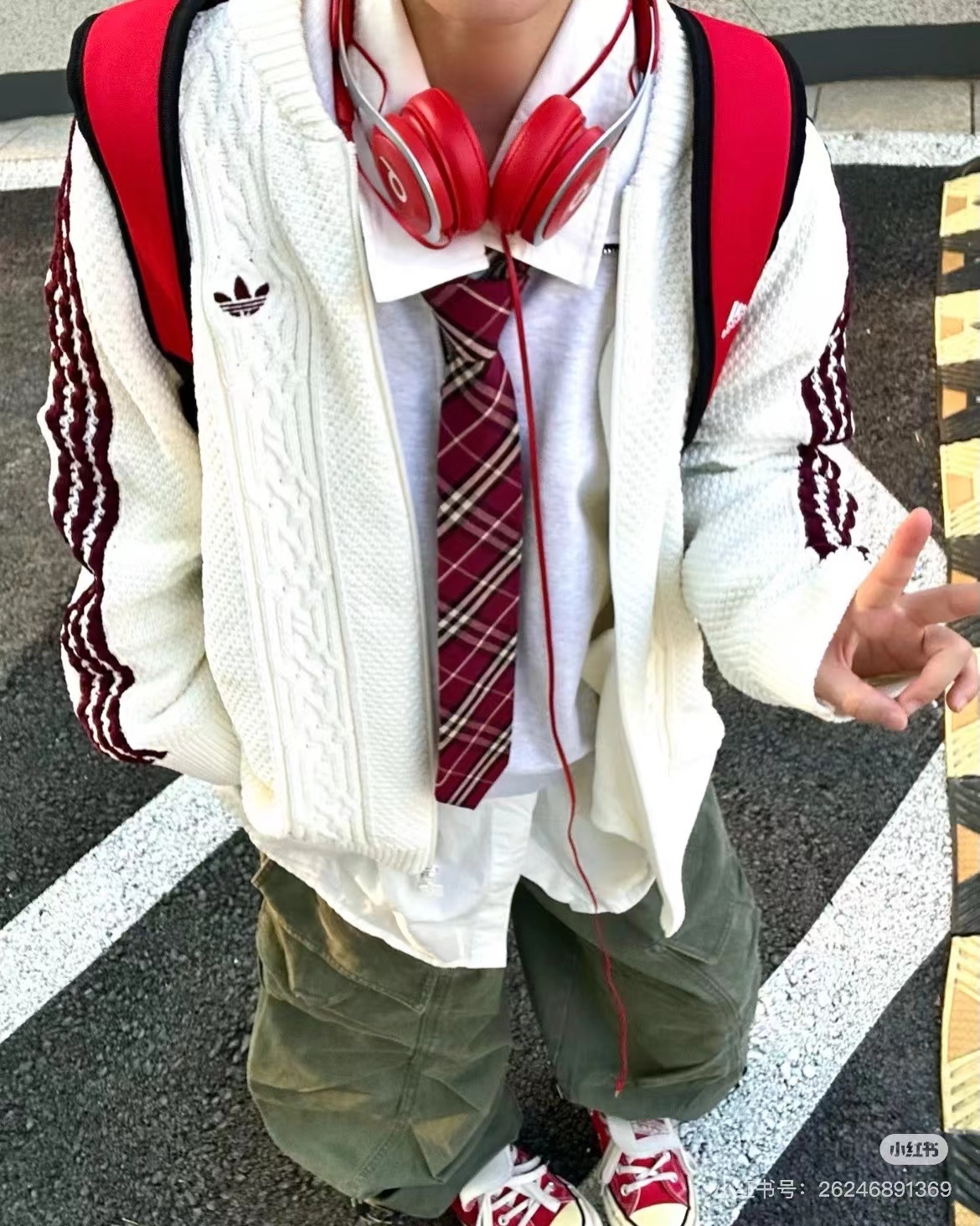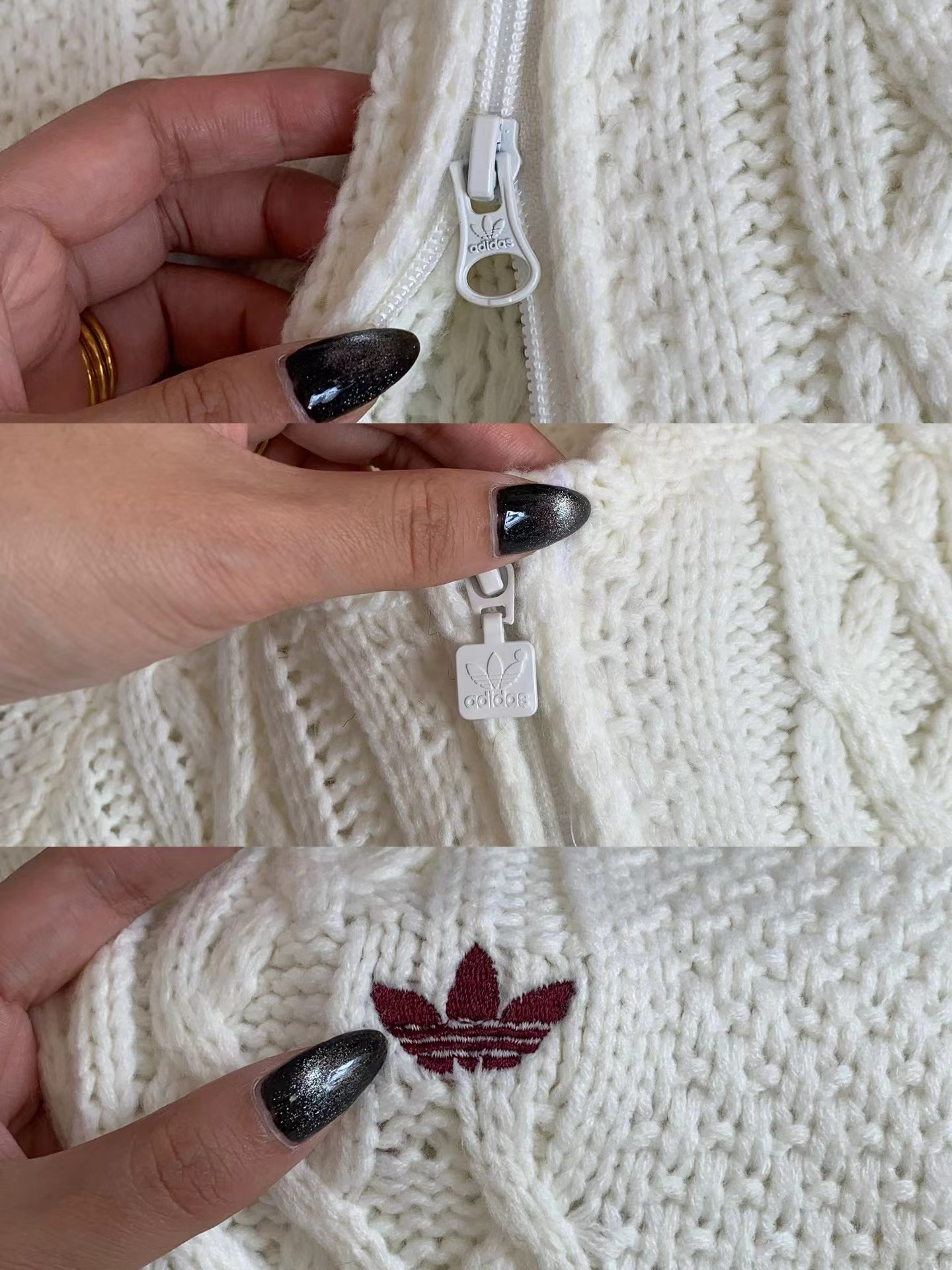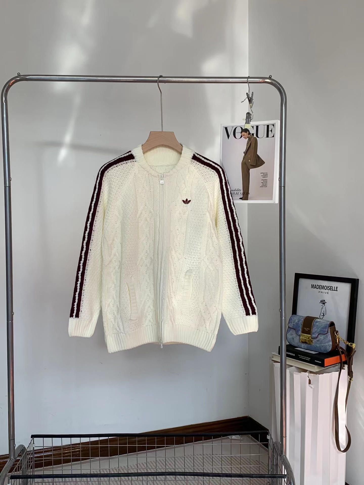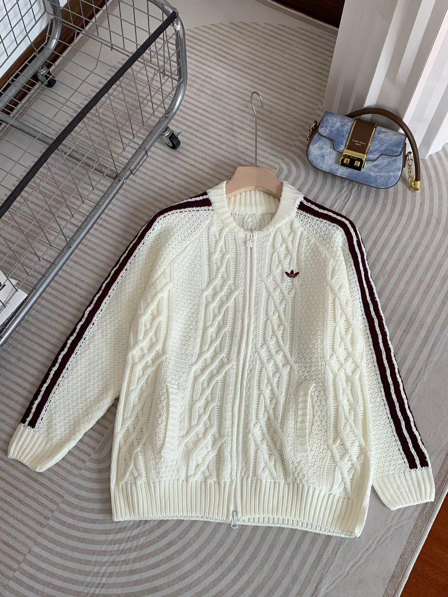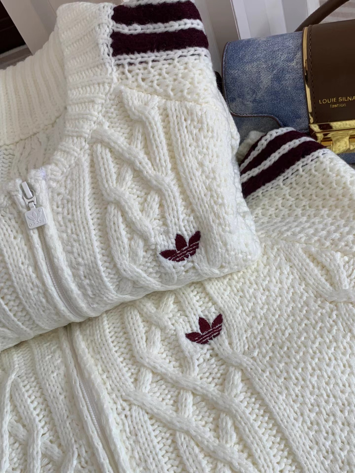 复古粗针绞花针织拉链开衫,奶乎乎的颜色,看着就软软糯糯的,酒红色的三条纹复古韵味加满~米白色麻花针织??面料,复古感的绞花工艺太有质感啦!胸口的三叶草小标低调又有辨识度~宽松版型藏肉又显随性,像把温柔滤镜穿在身上,不管是想走复古风,松弛风还是运动风,这件外套都可以轻松拿捏,定制logo拉链,把品质都藏进细节里。这个颜色真的美式学院风~没有谁能拒绝他!